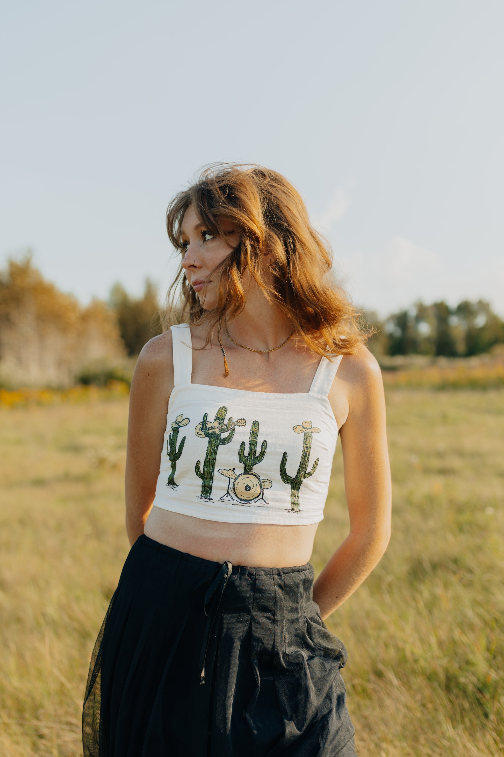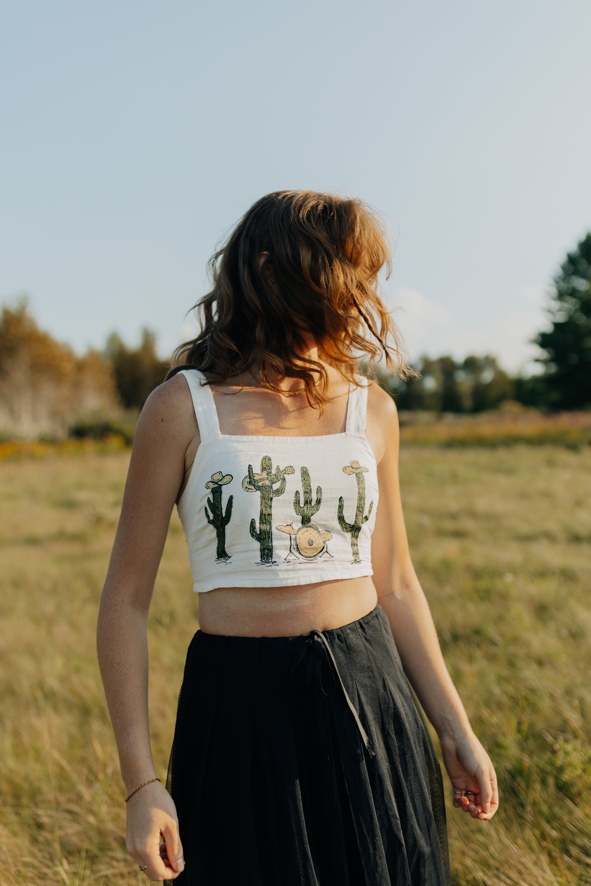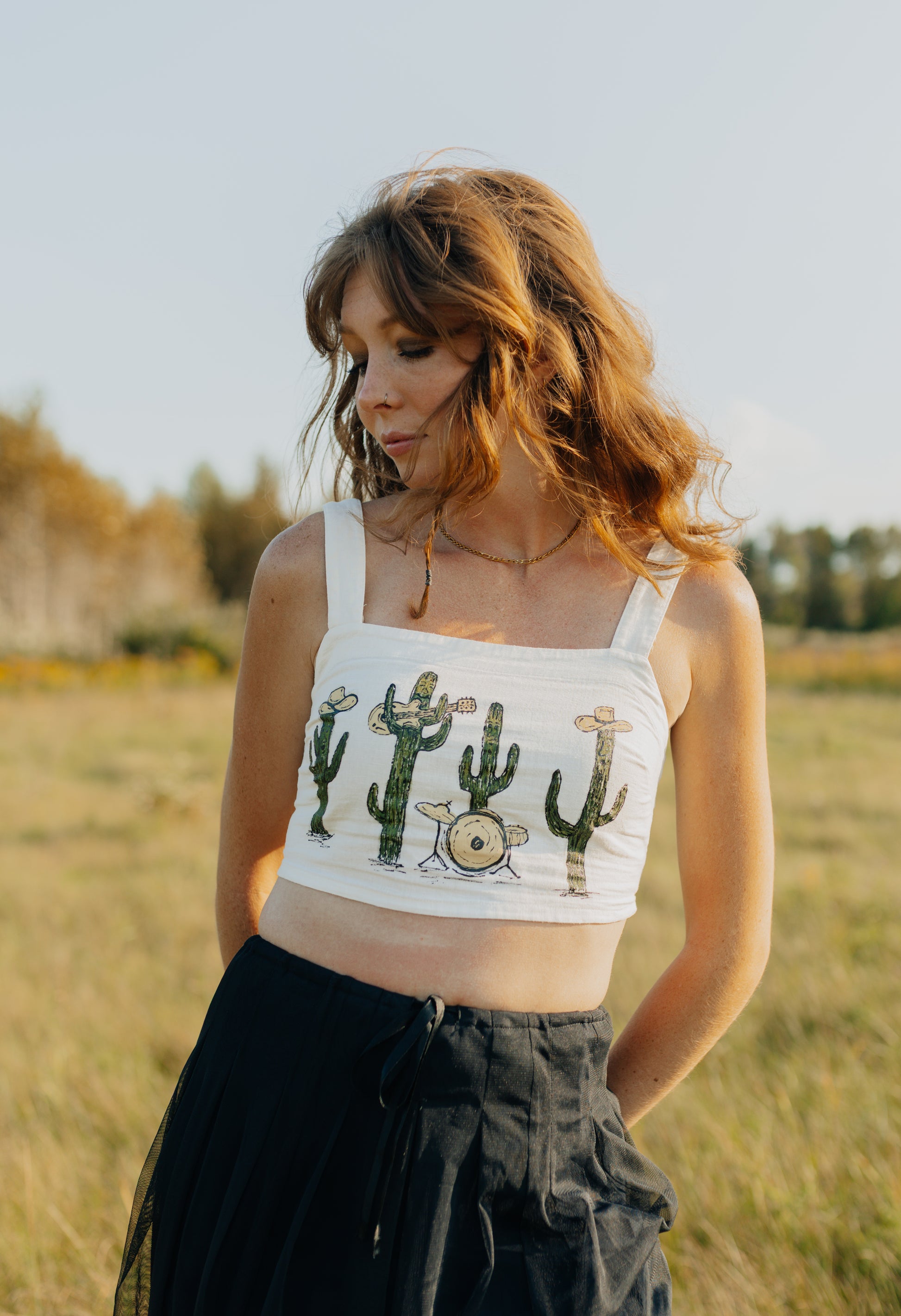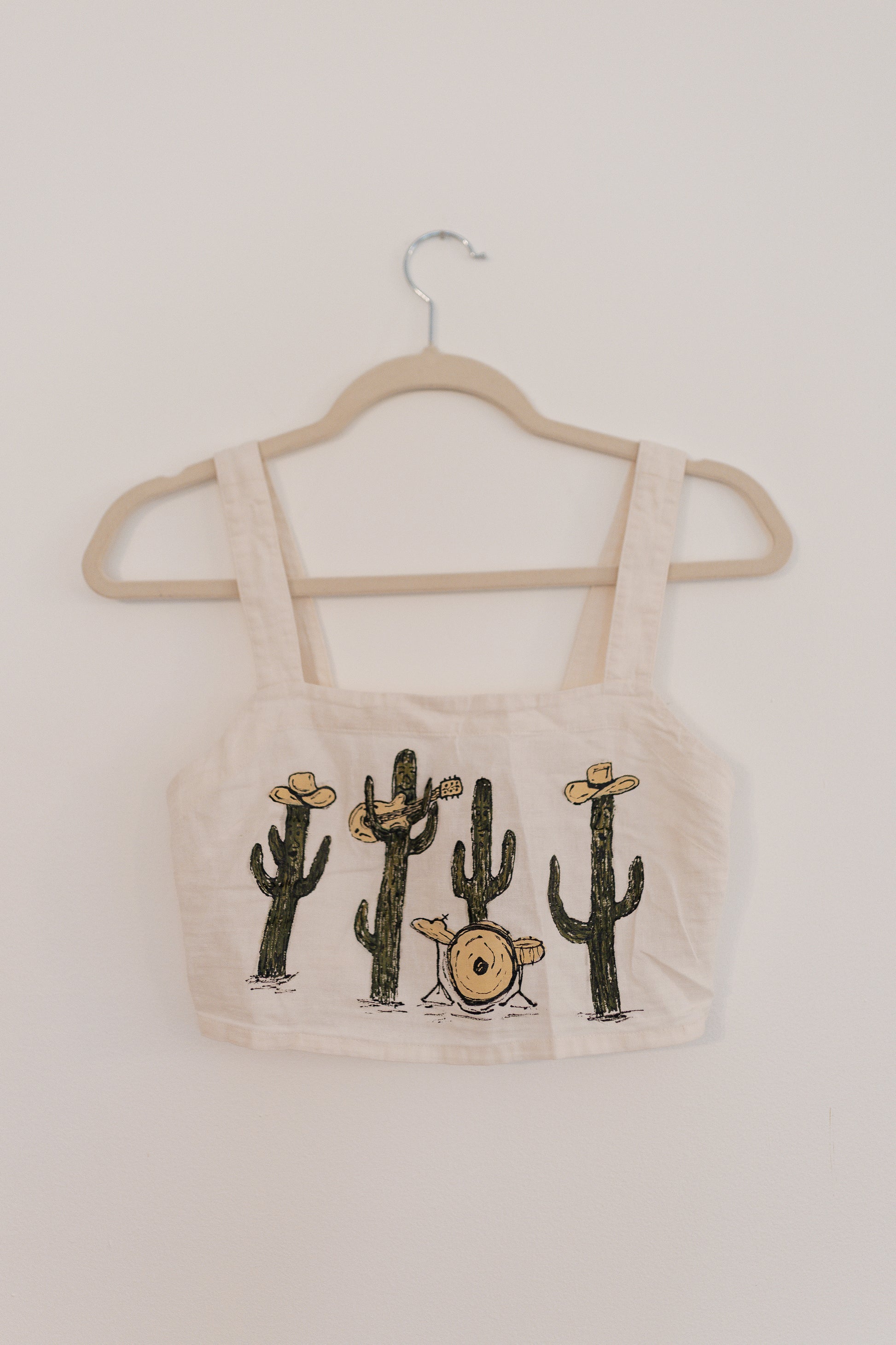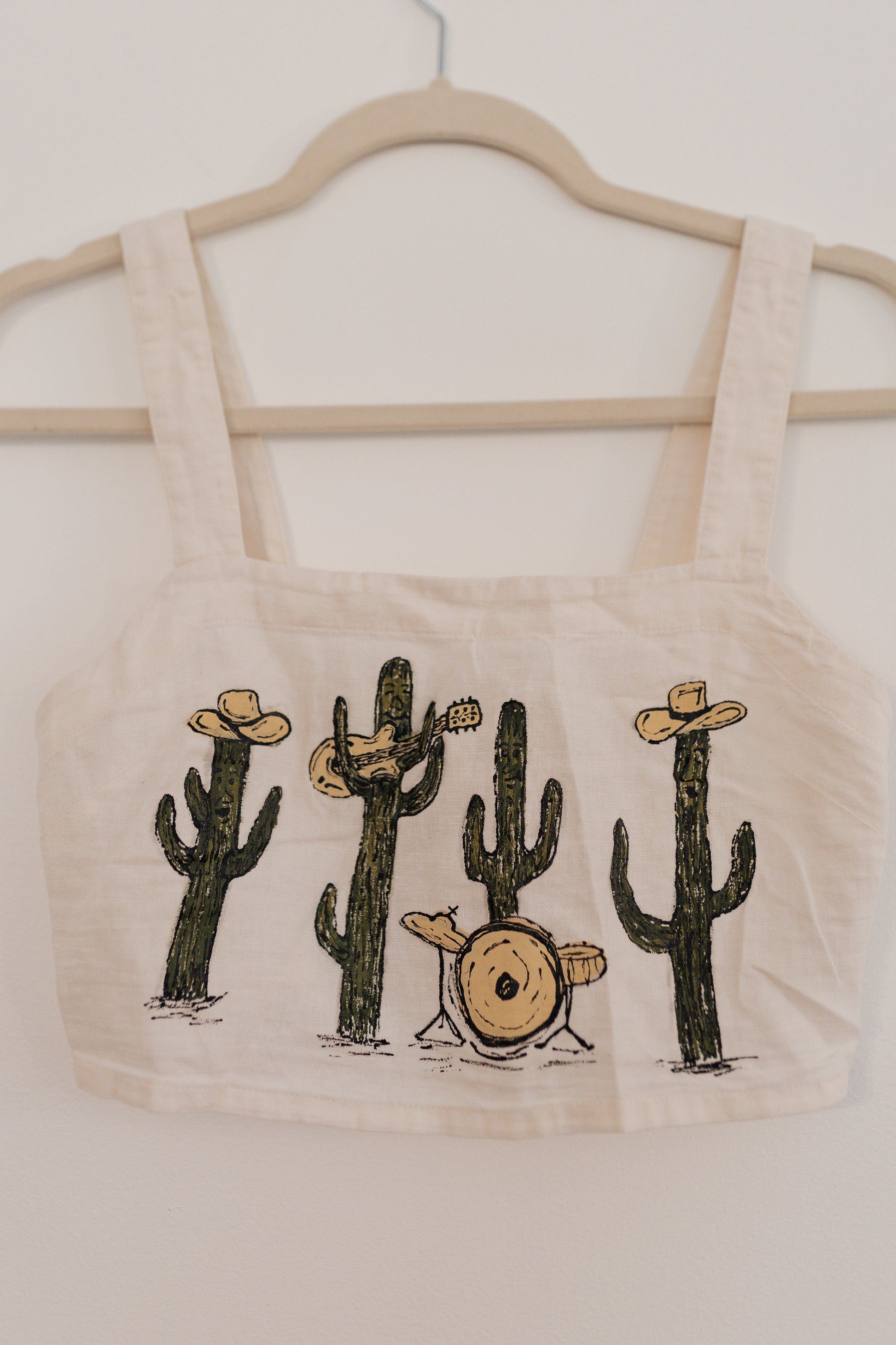 A thrifted, cropped white tank top with a hand painted cactus band.