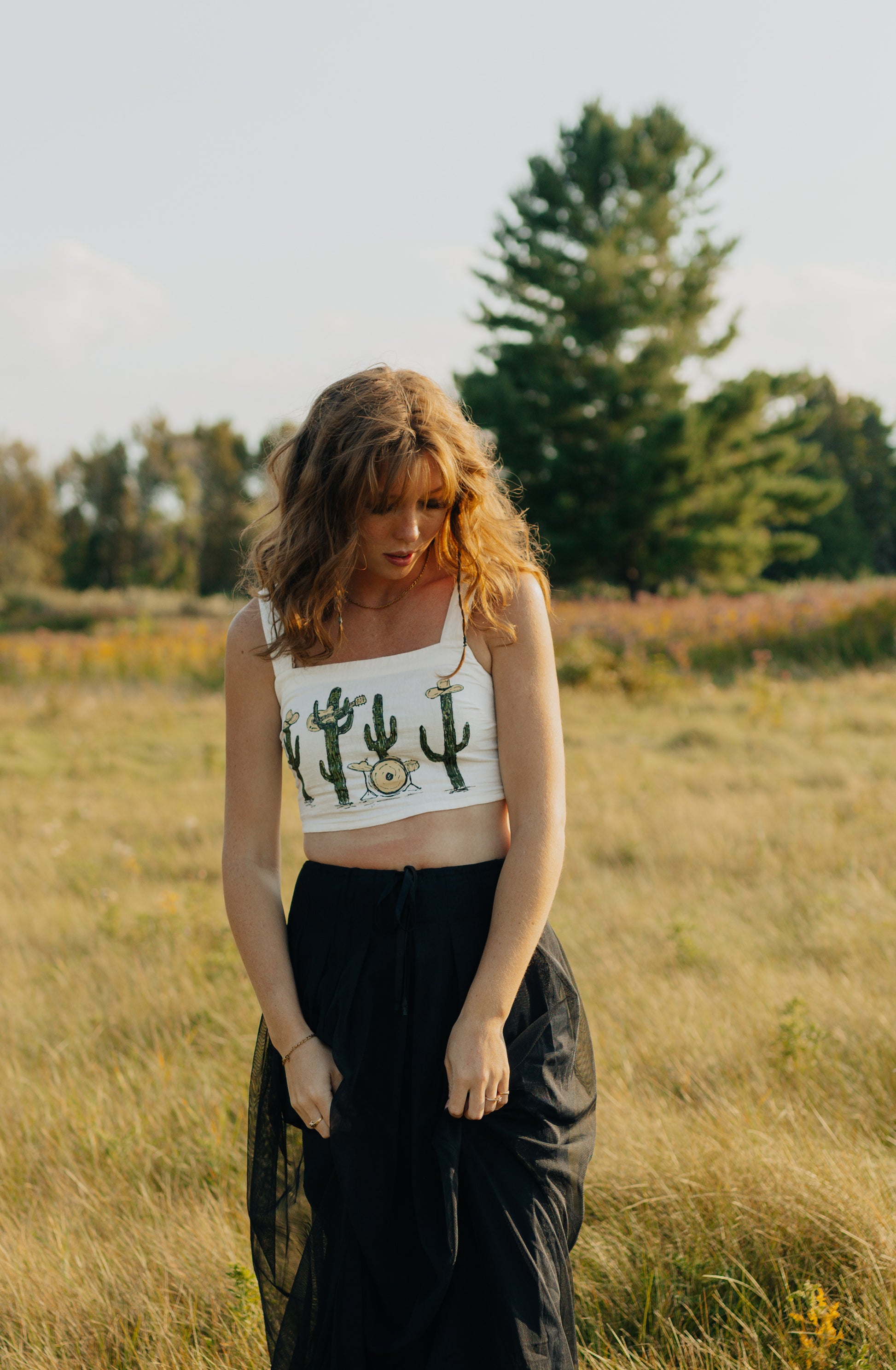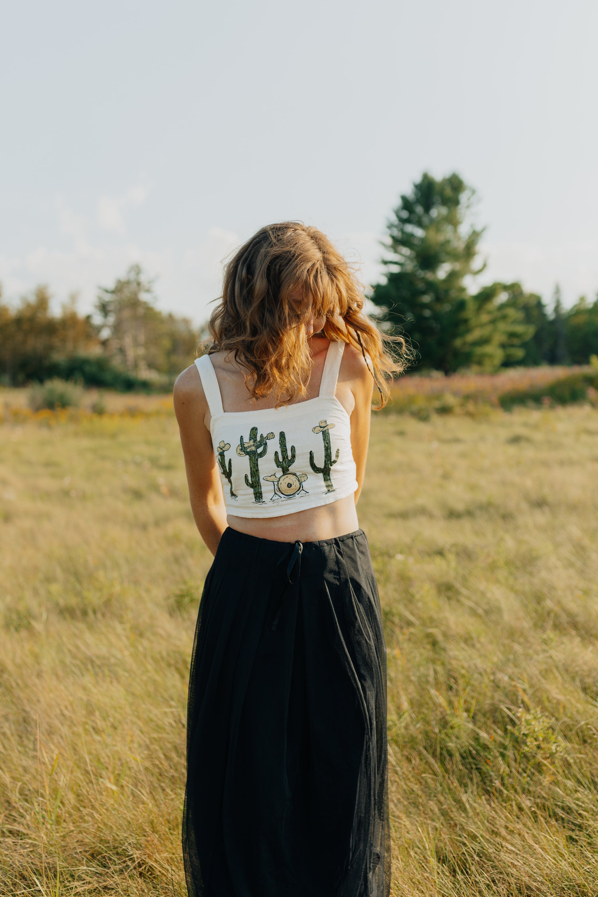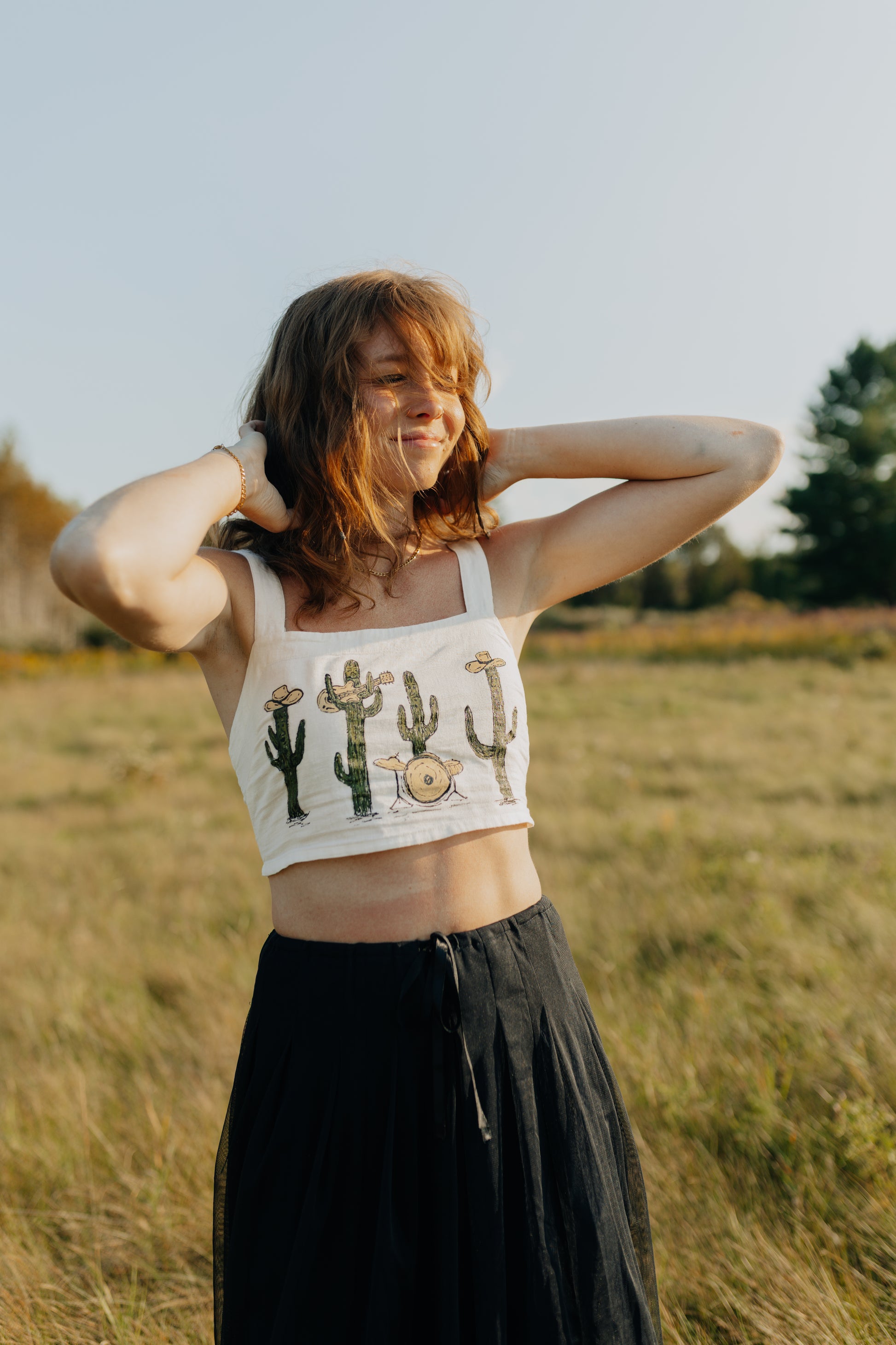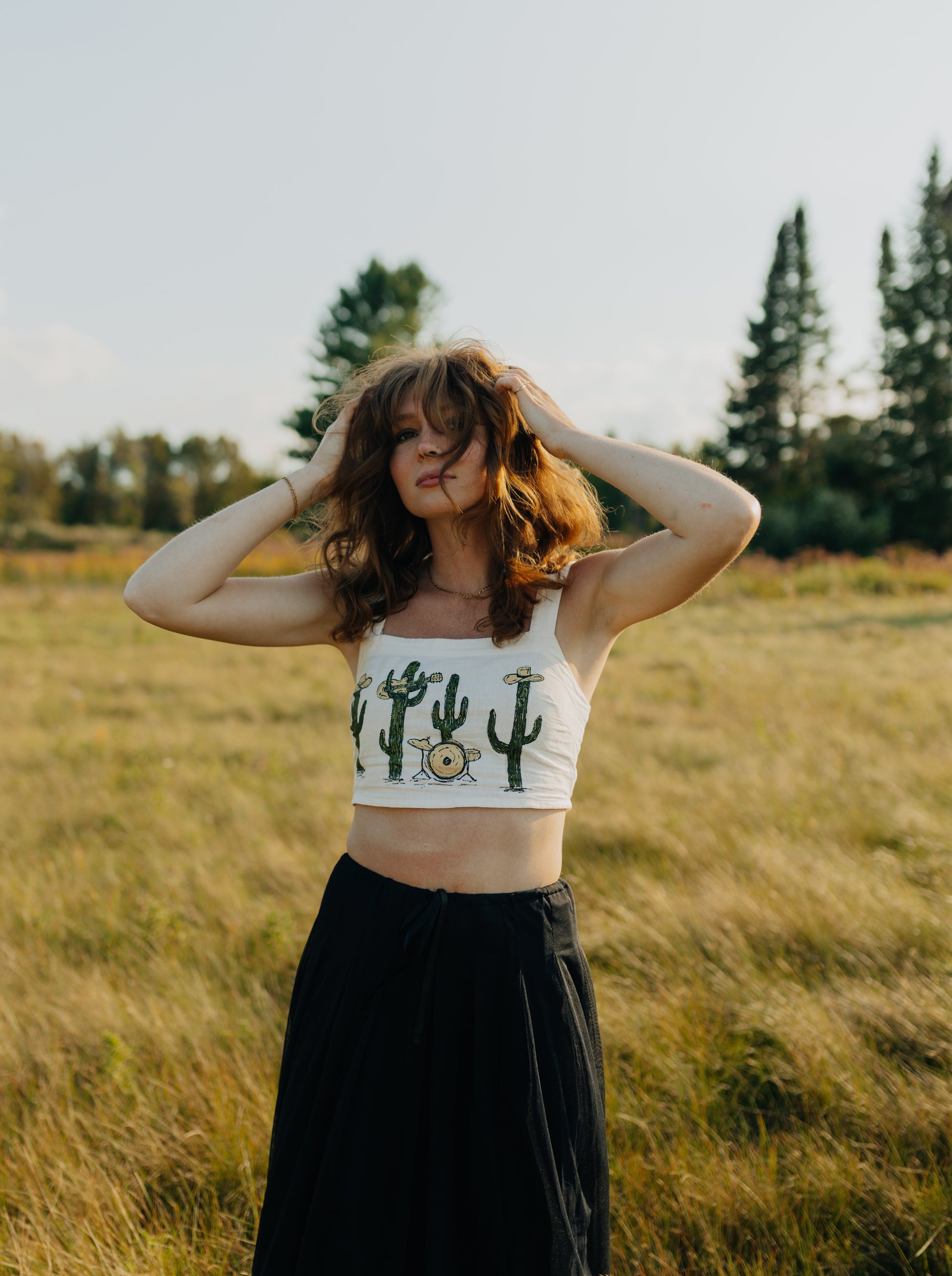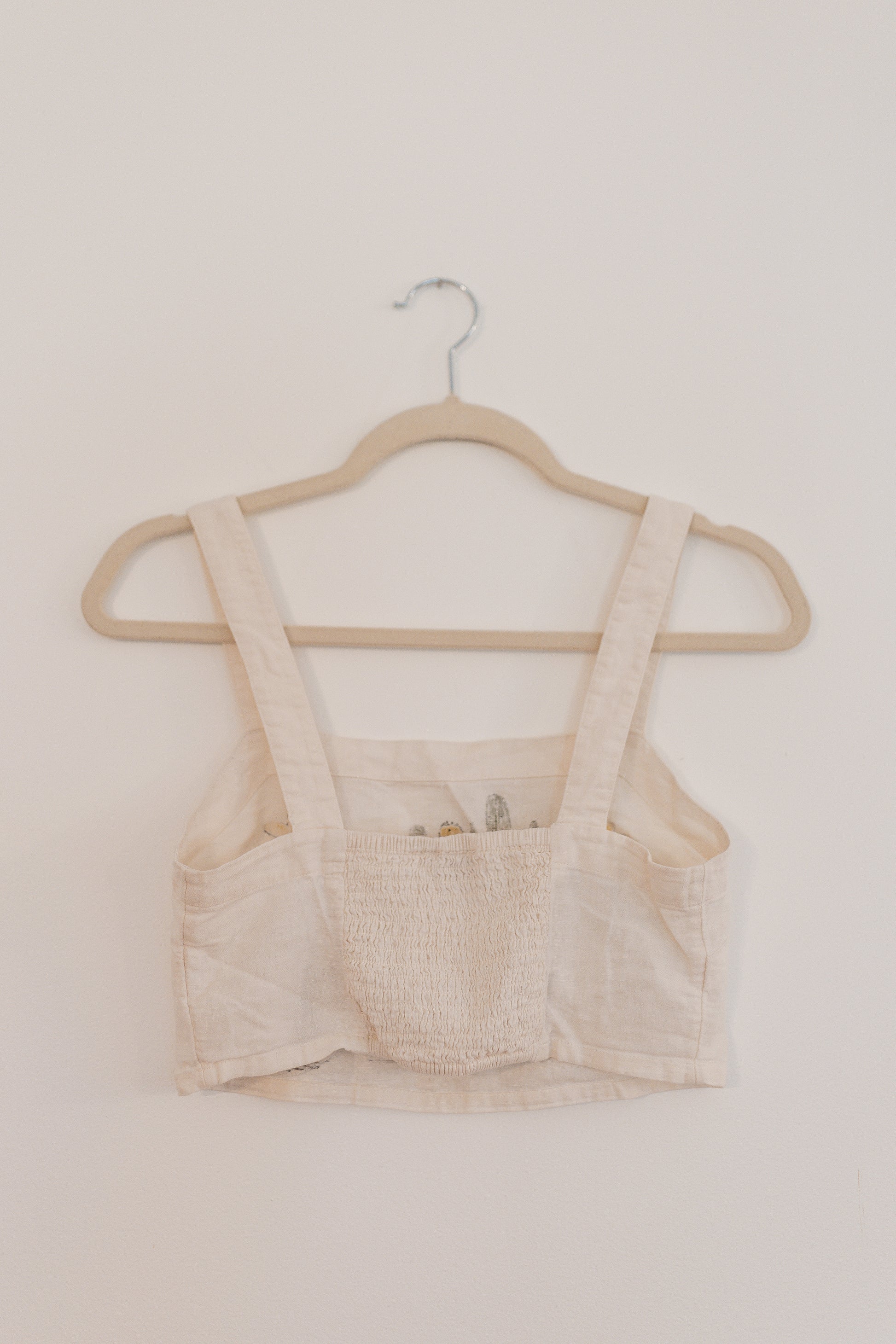 A thrifted, cropped white tank top with a hand painted cactus band.
