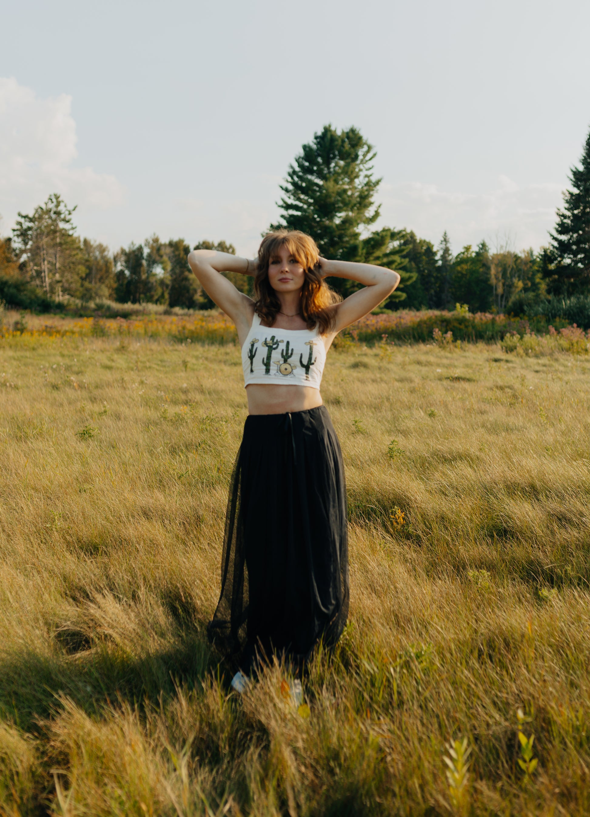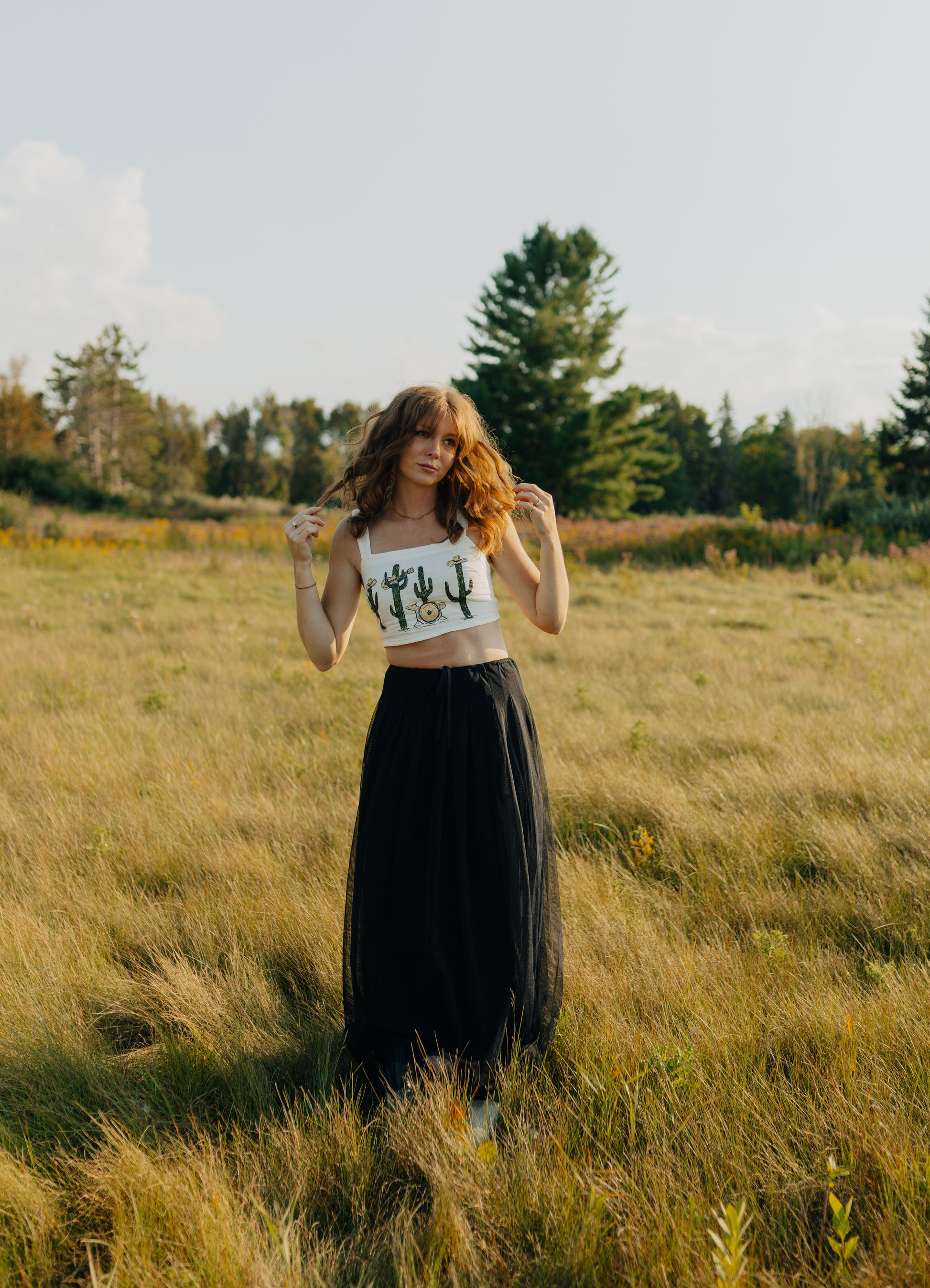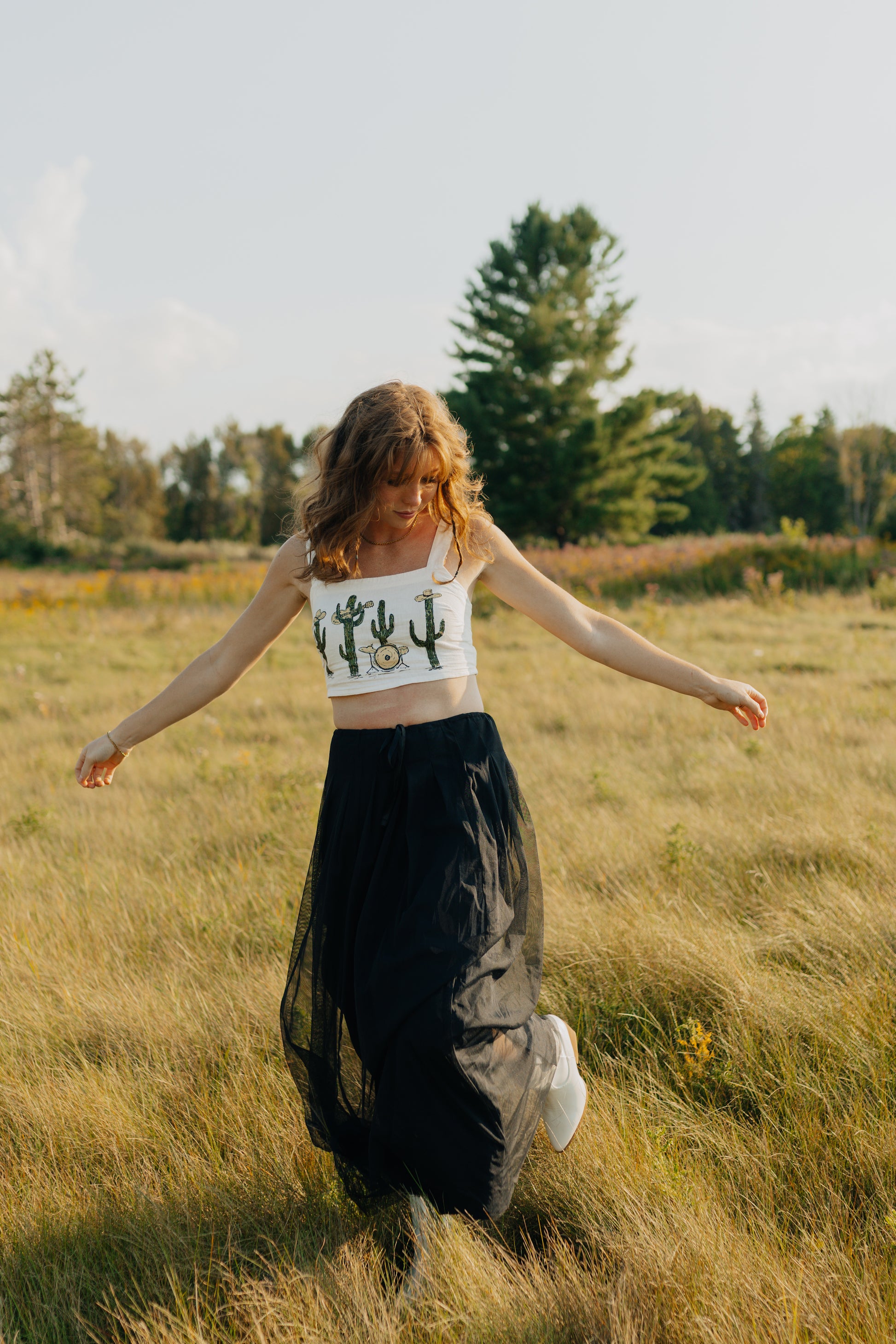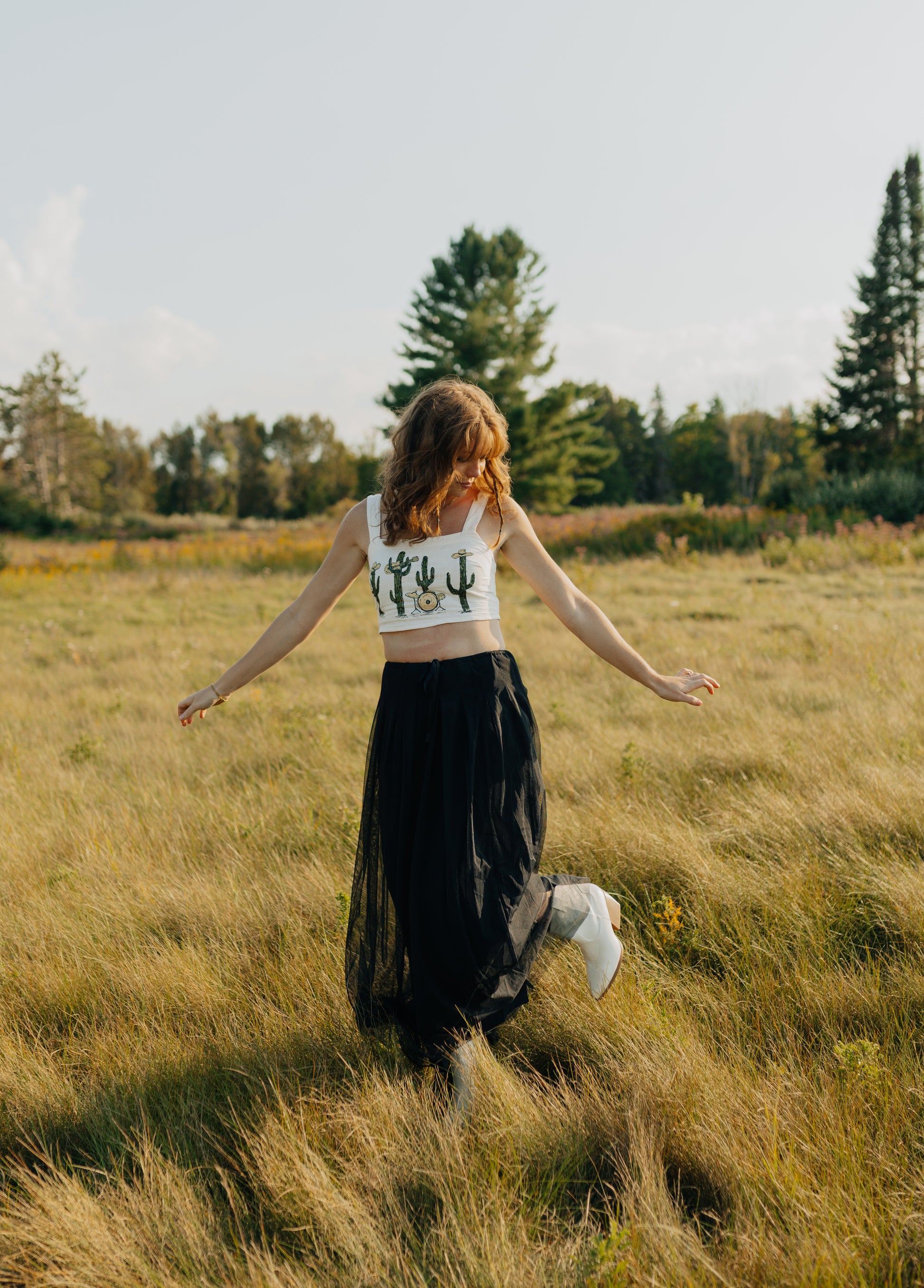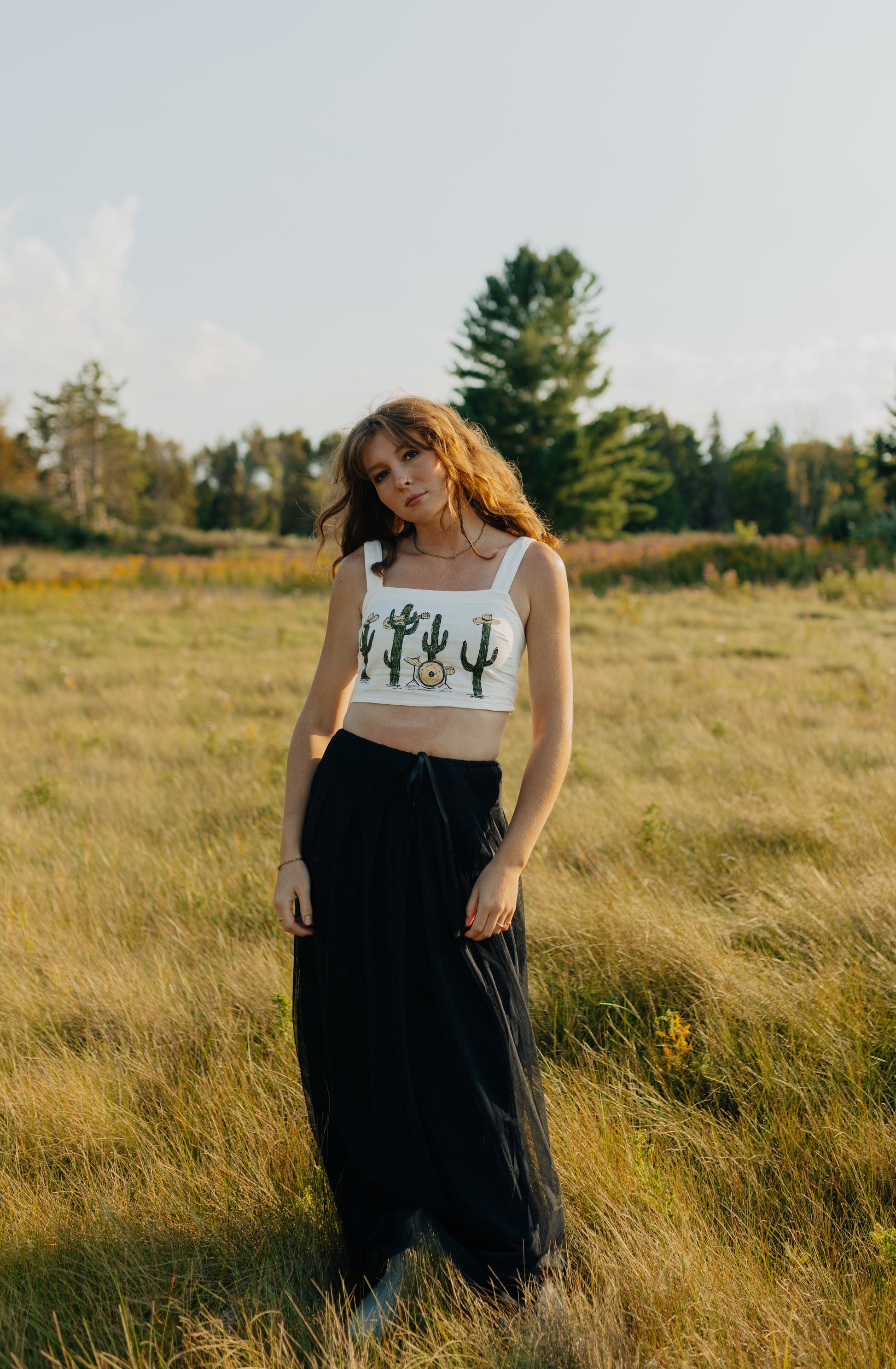 A thrifted, cropped white tank top with a hand painted cactus band.