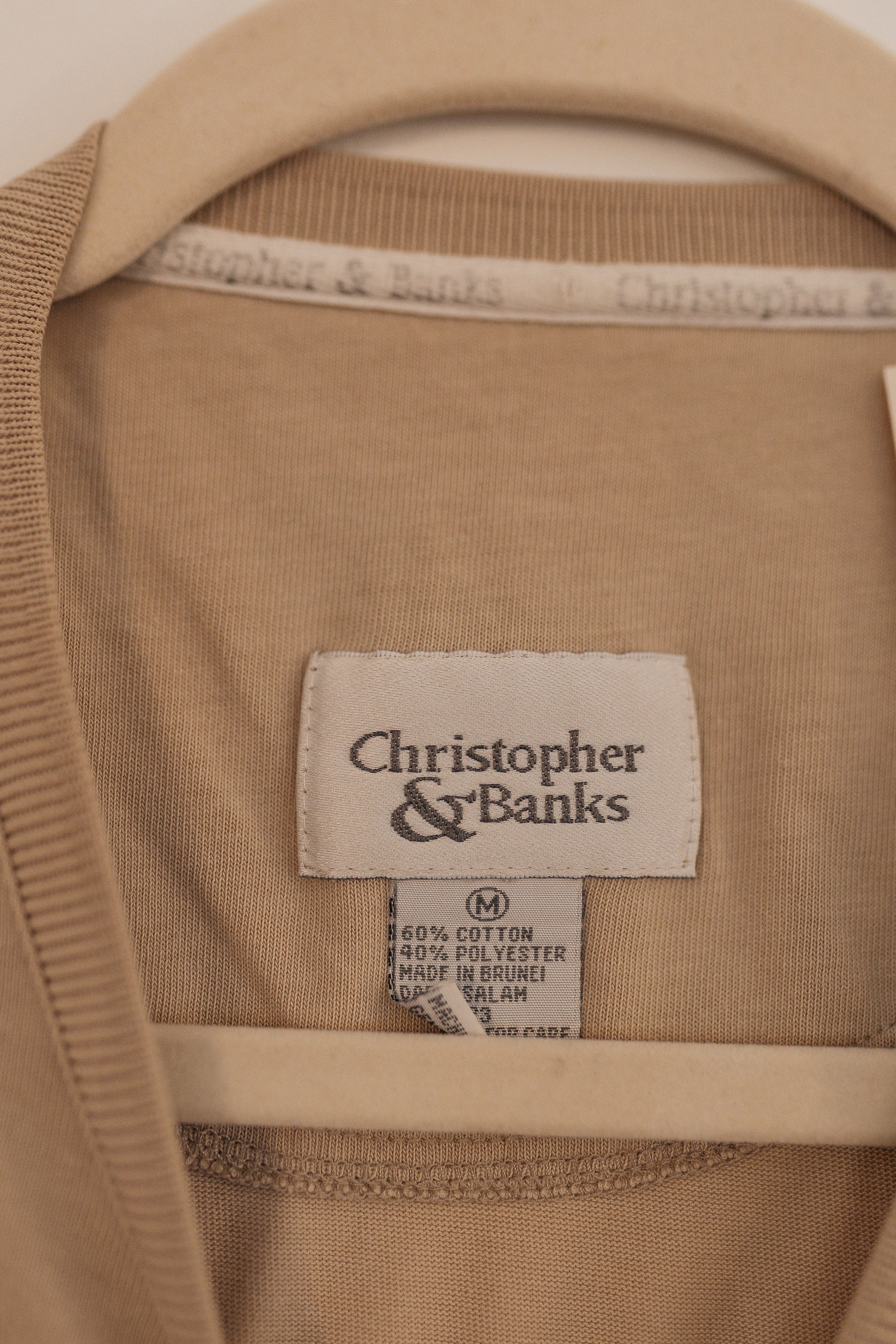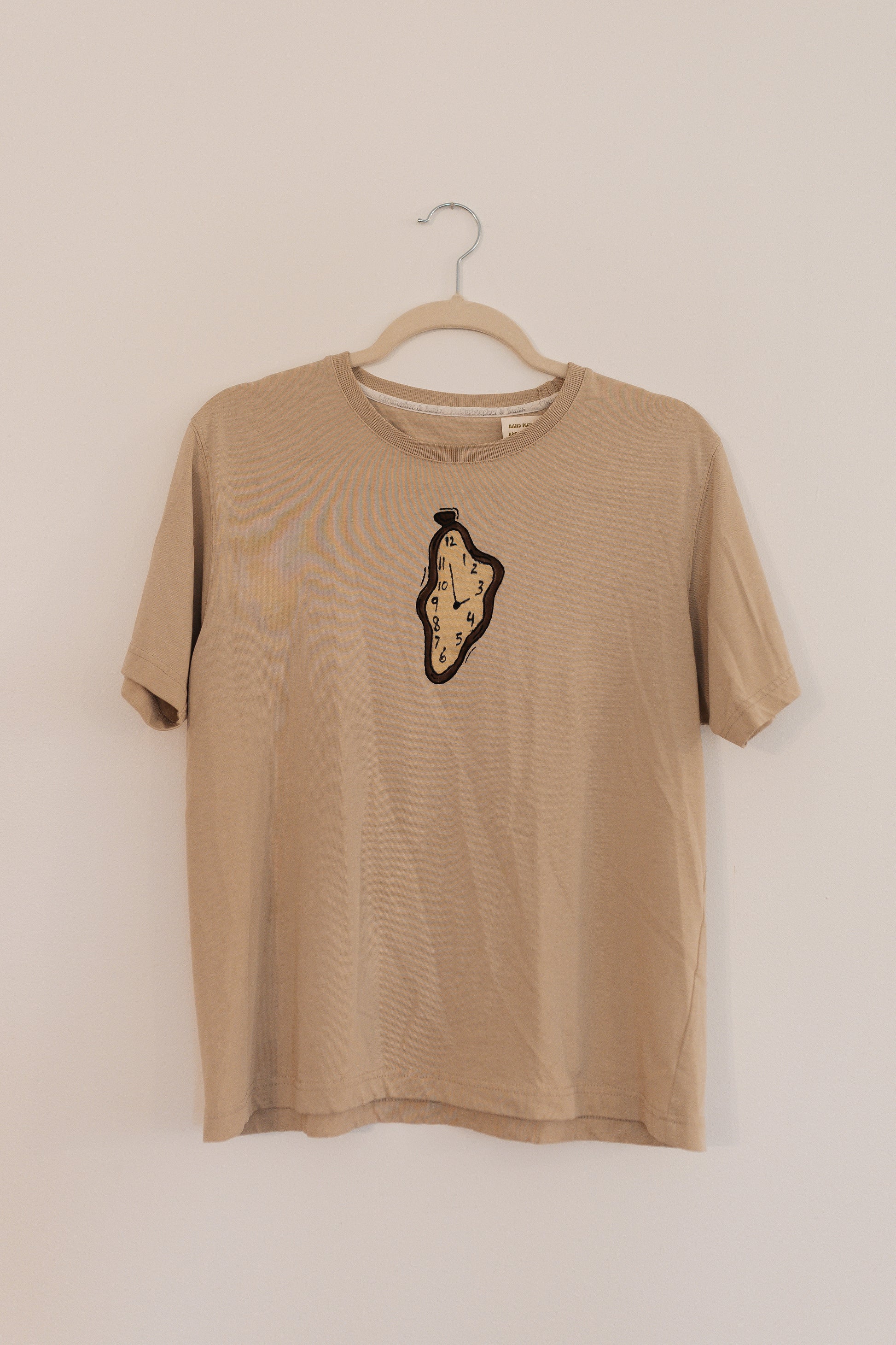 Thrifted tan tshirt with a clock hand painted on it. Machine washable.