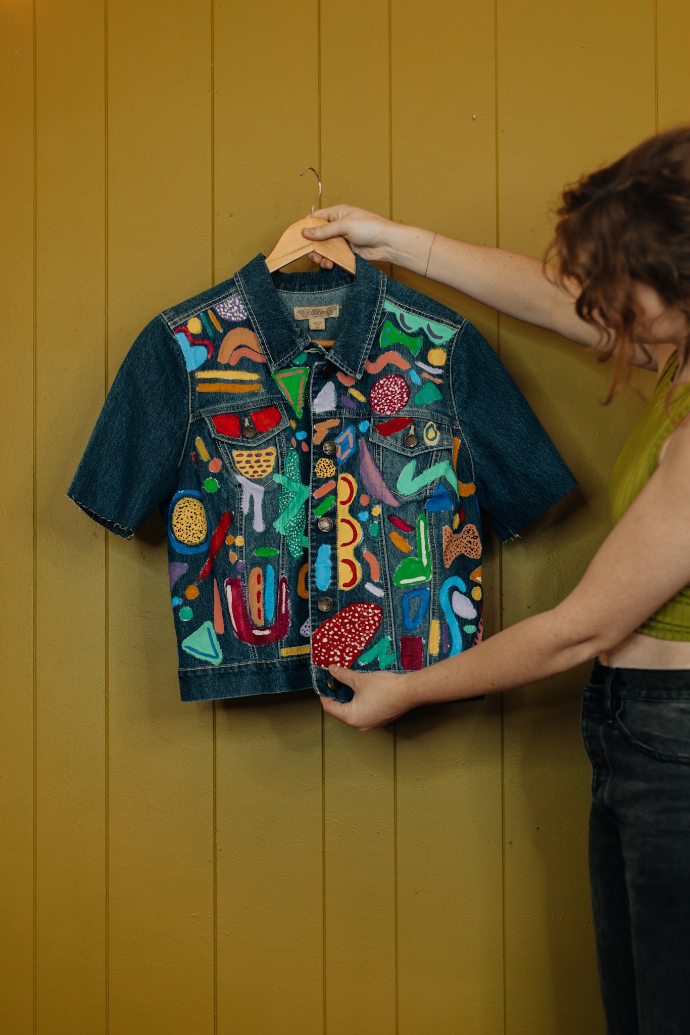 A super funky painted top! This was a thrifted denim jacket i cut the sleeves off and then painted! If this is your style you are the coolest person around and I love your style. This is such a fun top and definitely takes a specific person to be able to pull it off, and if your even looking at it YOU DEFINITELY CAN!!