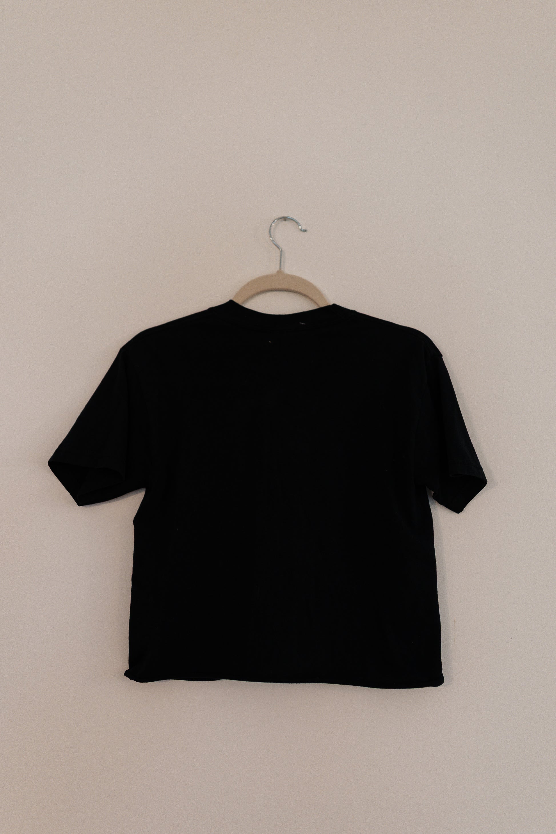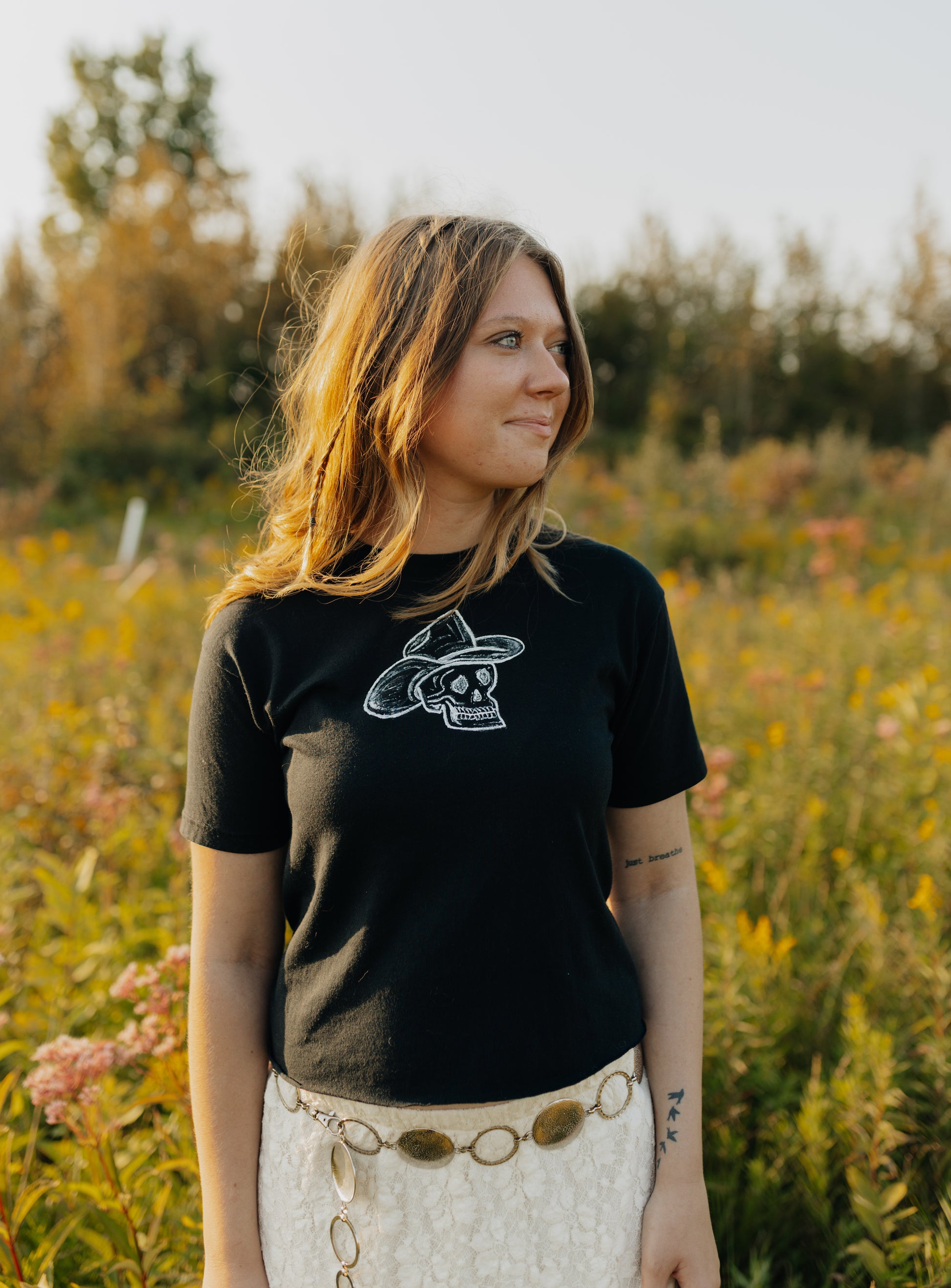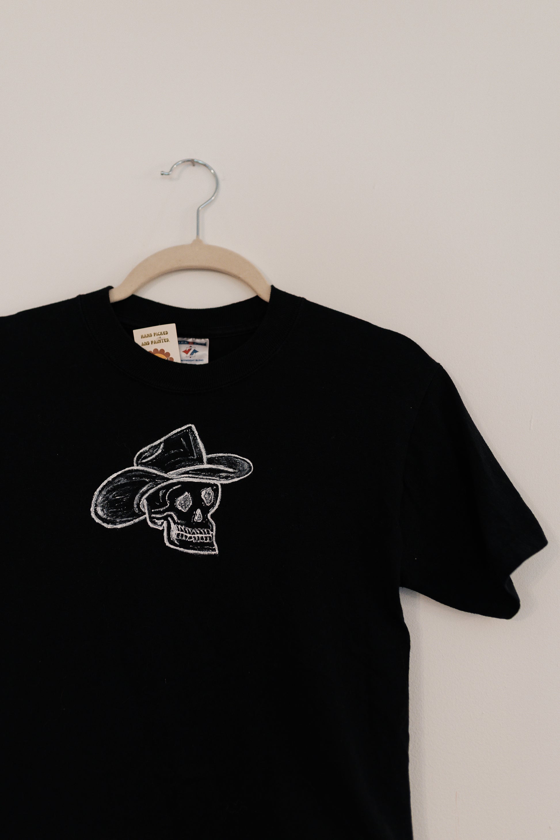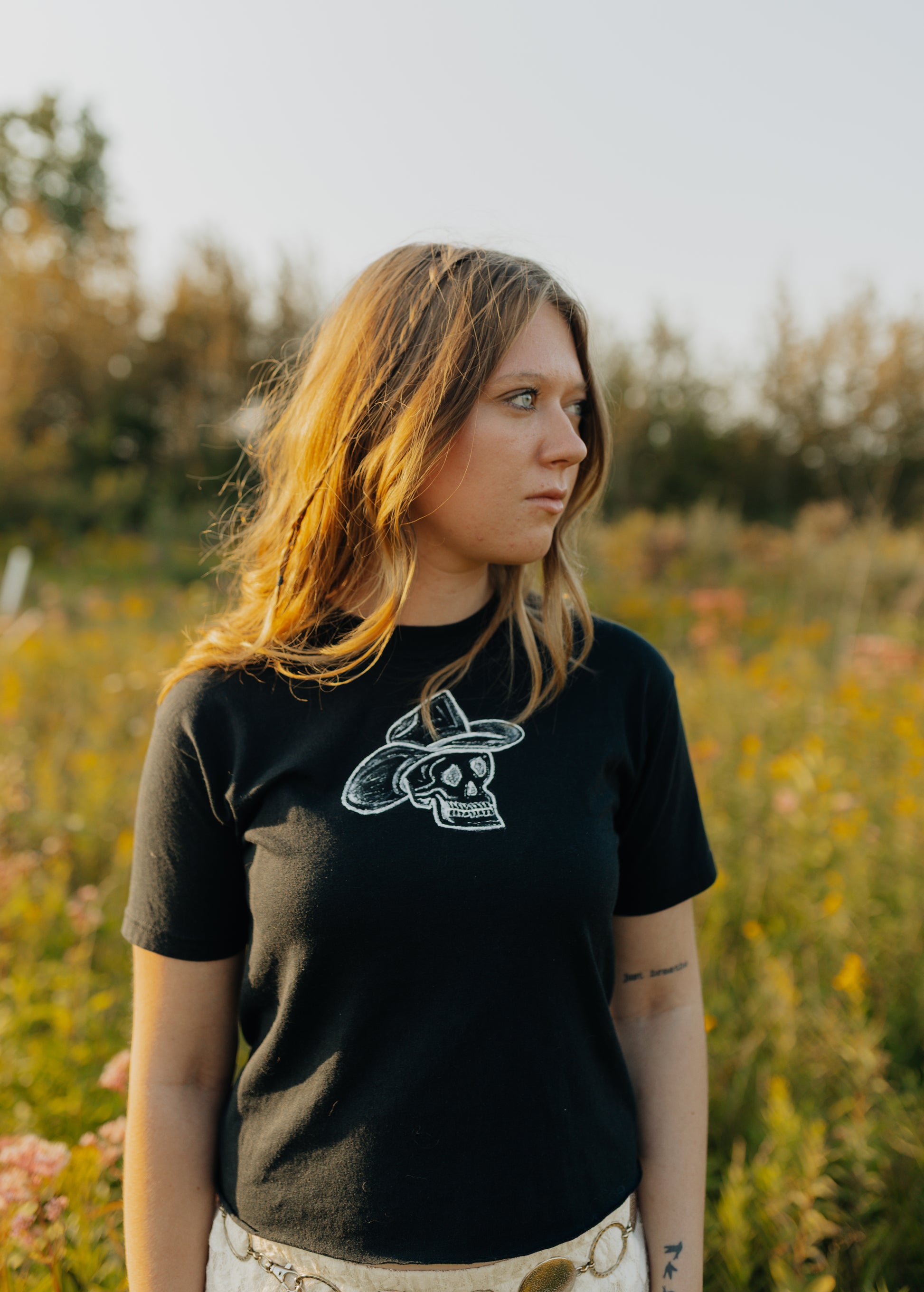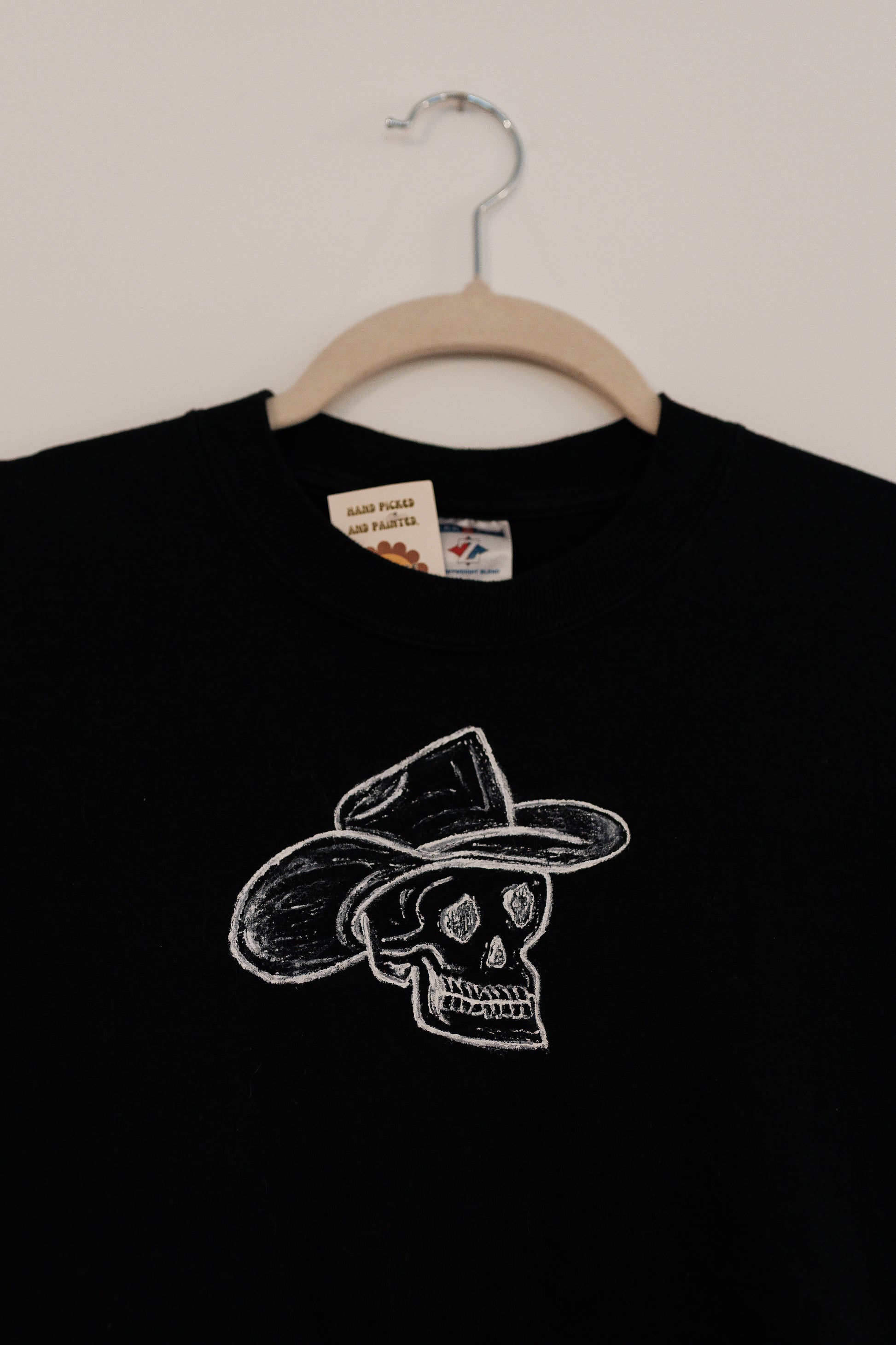 A thrifted, cropped black tshirt with a white hand painted skull wearing a cowboy hat.