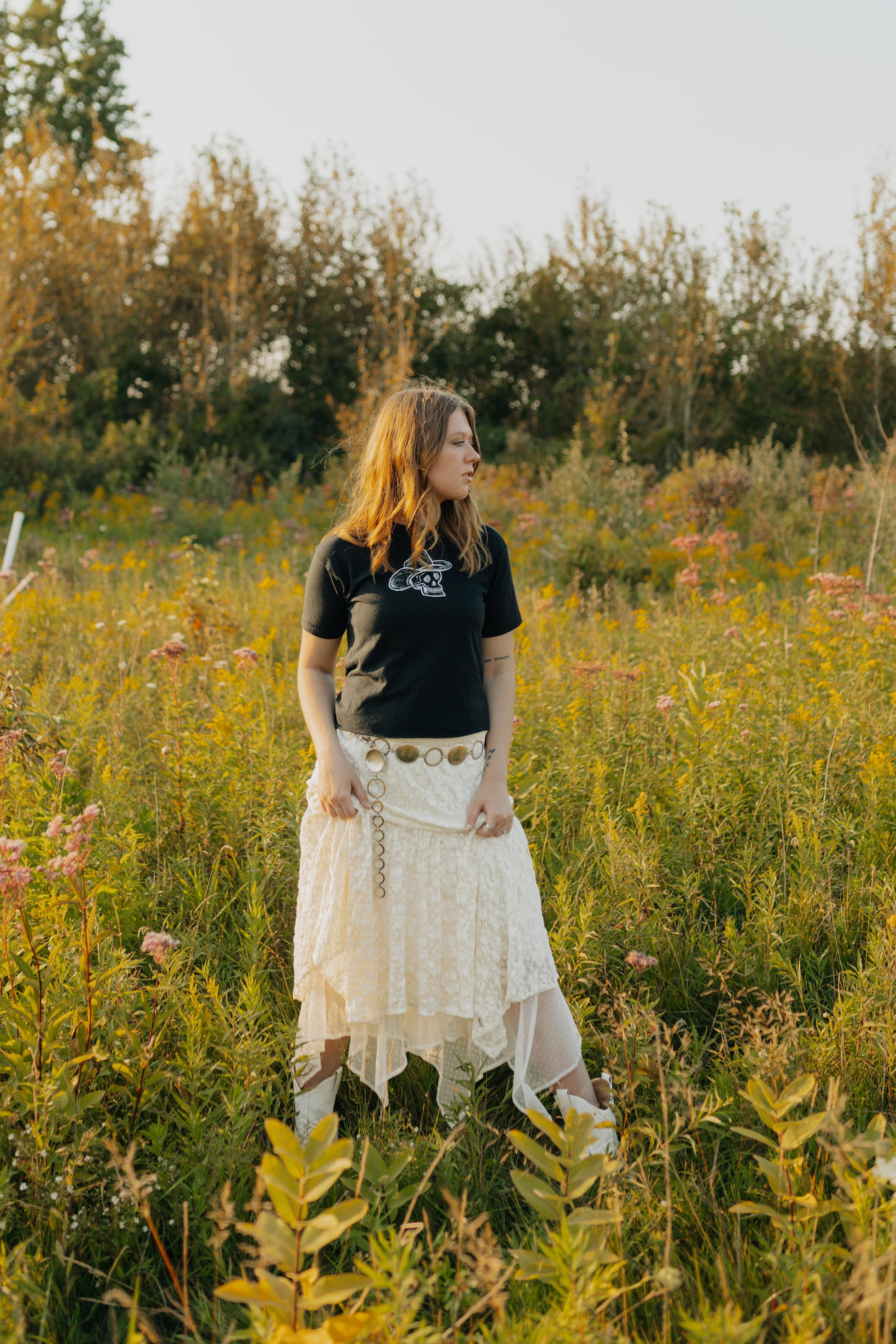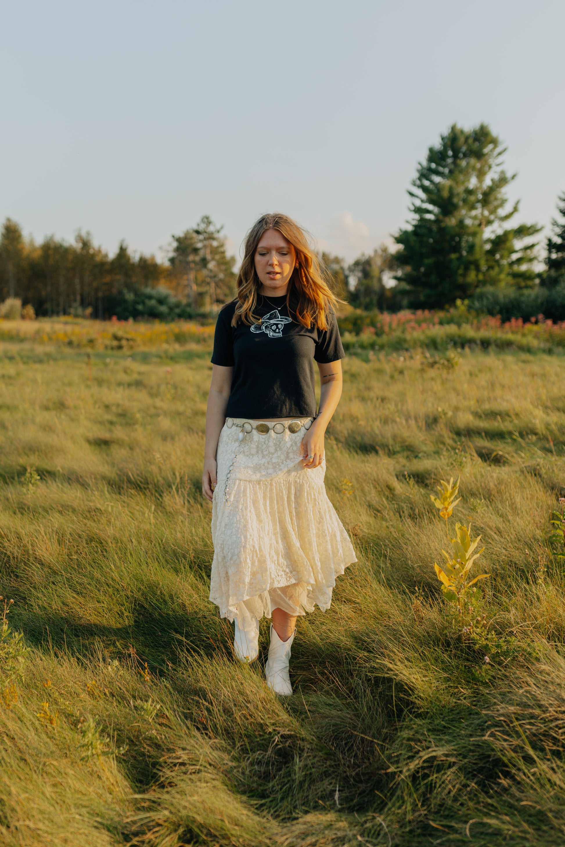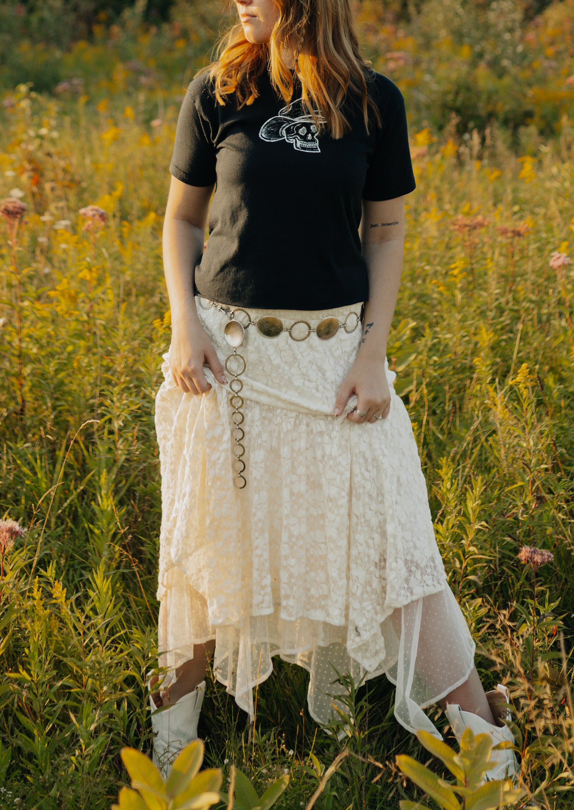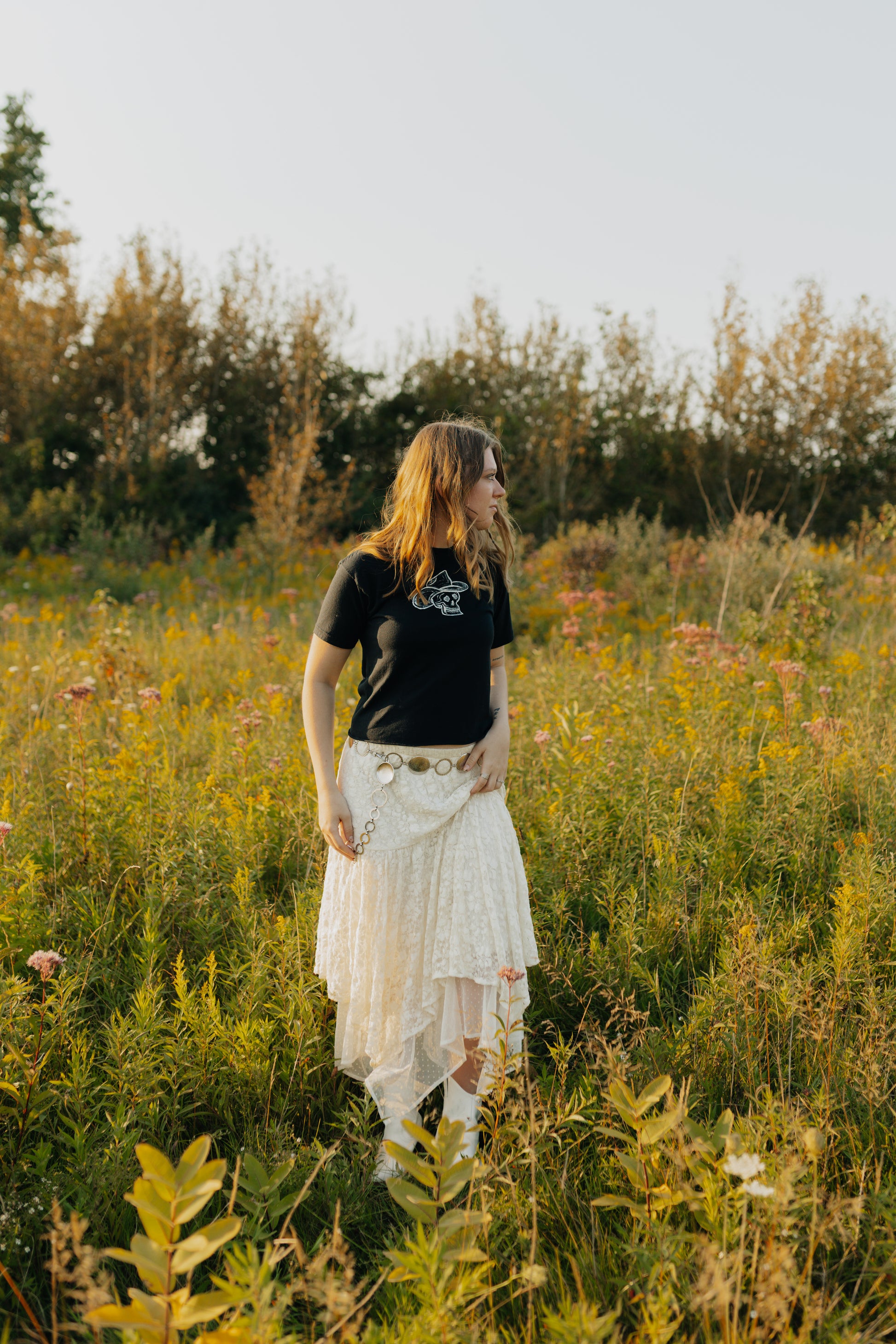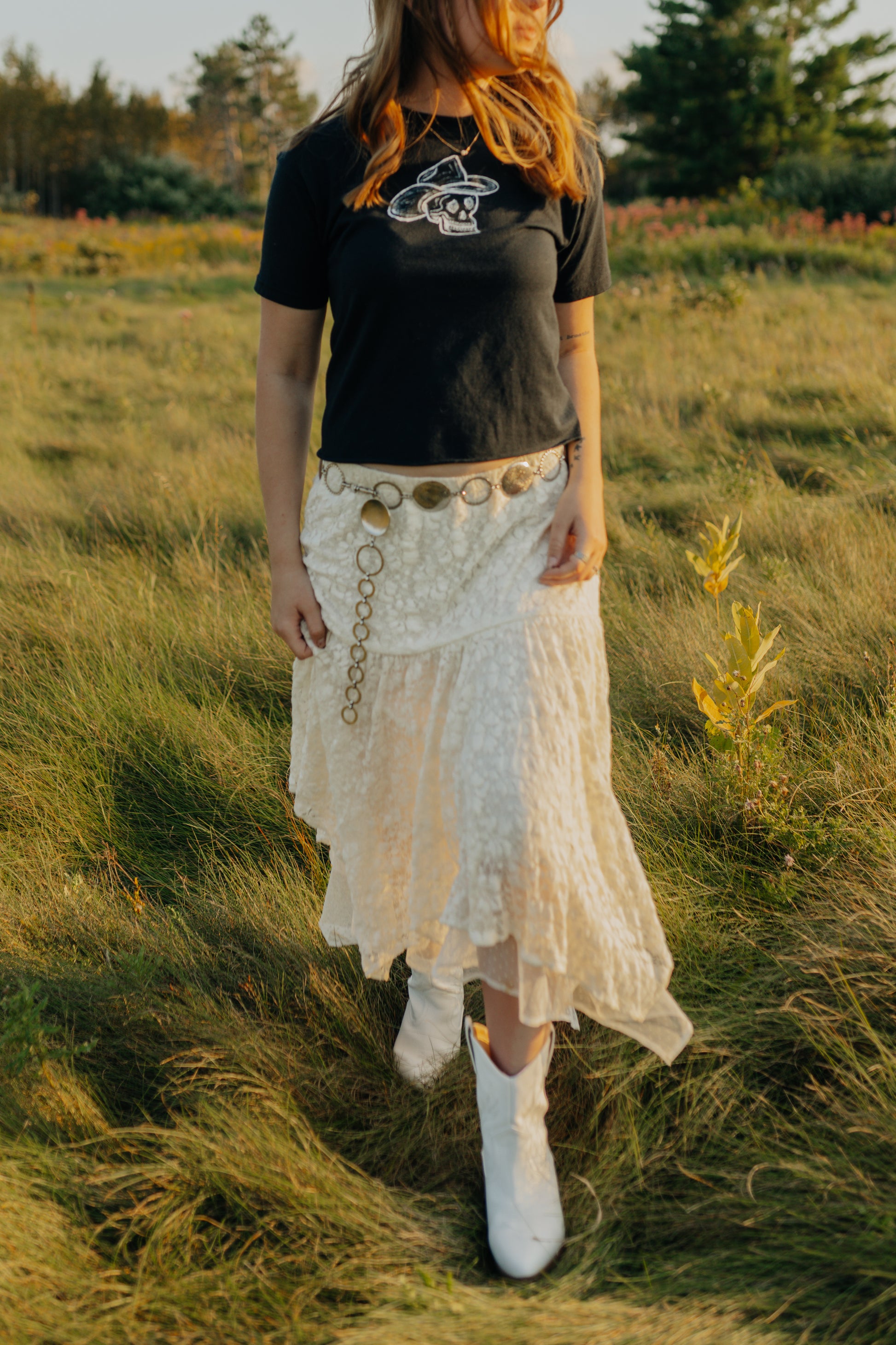 A thrifted, cropped black tshirt with a white hand painted skull wearing a cowboy hat.