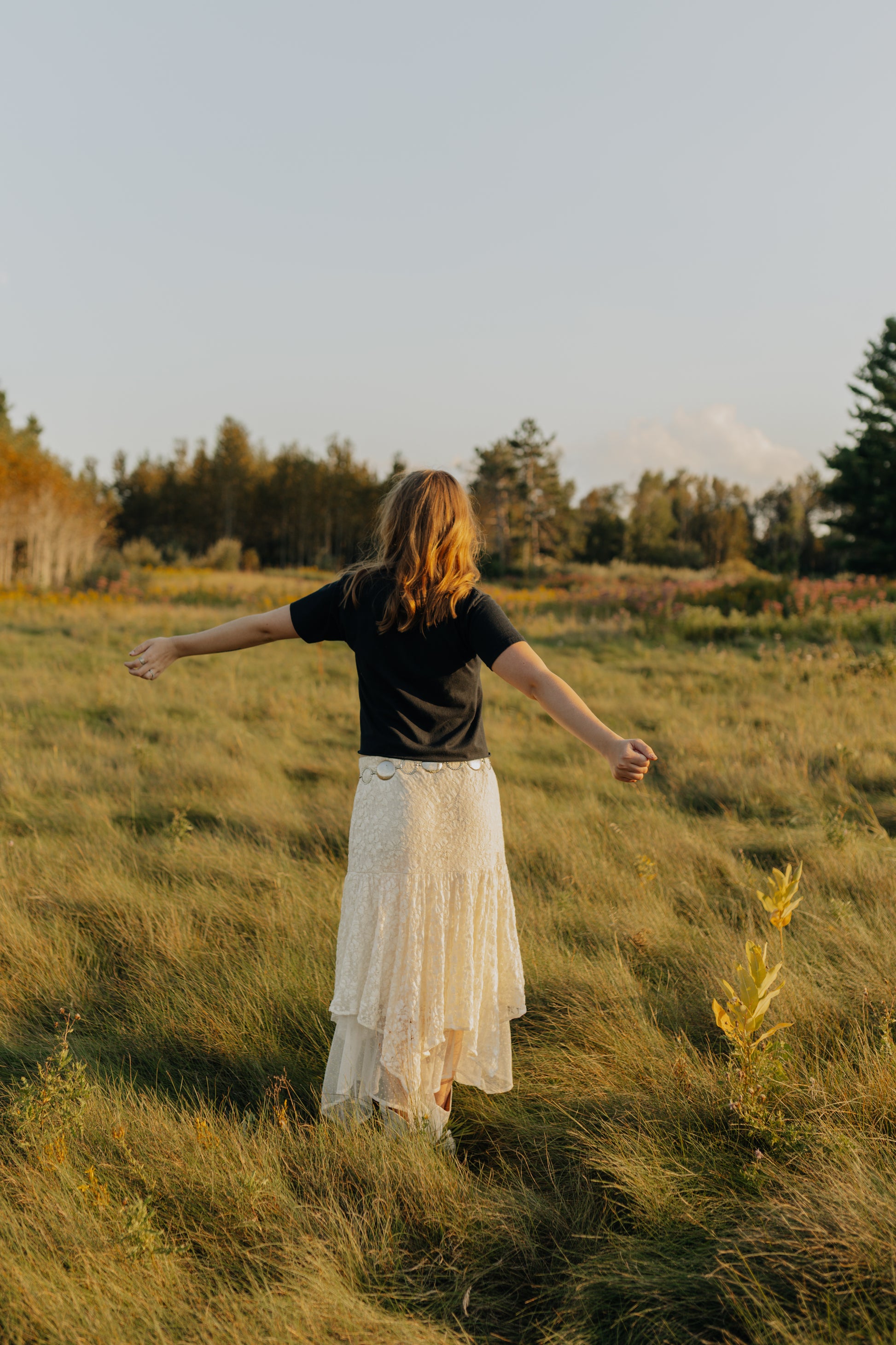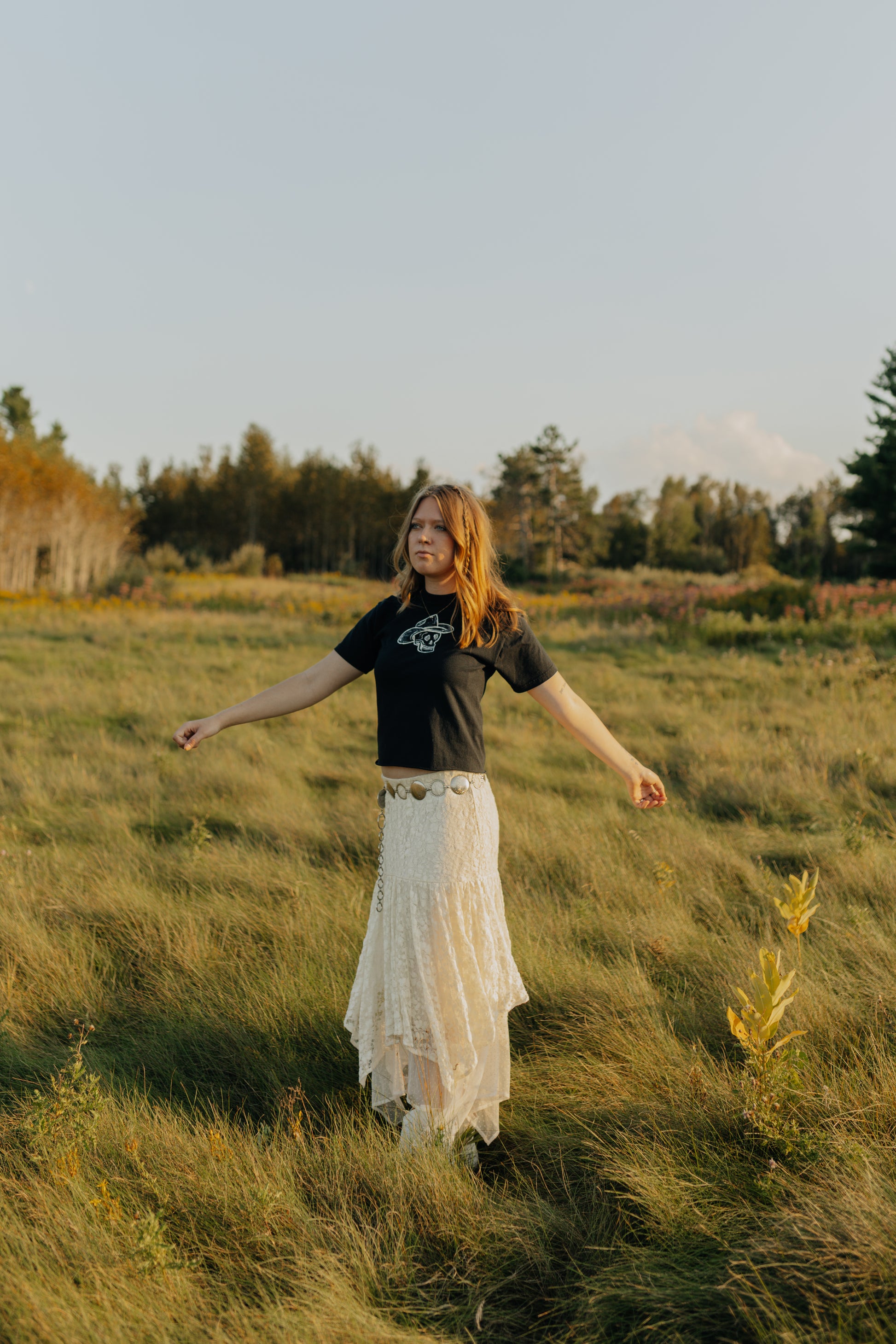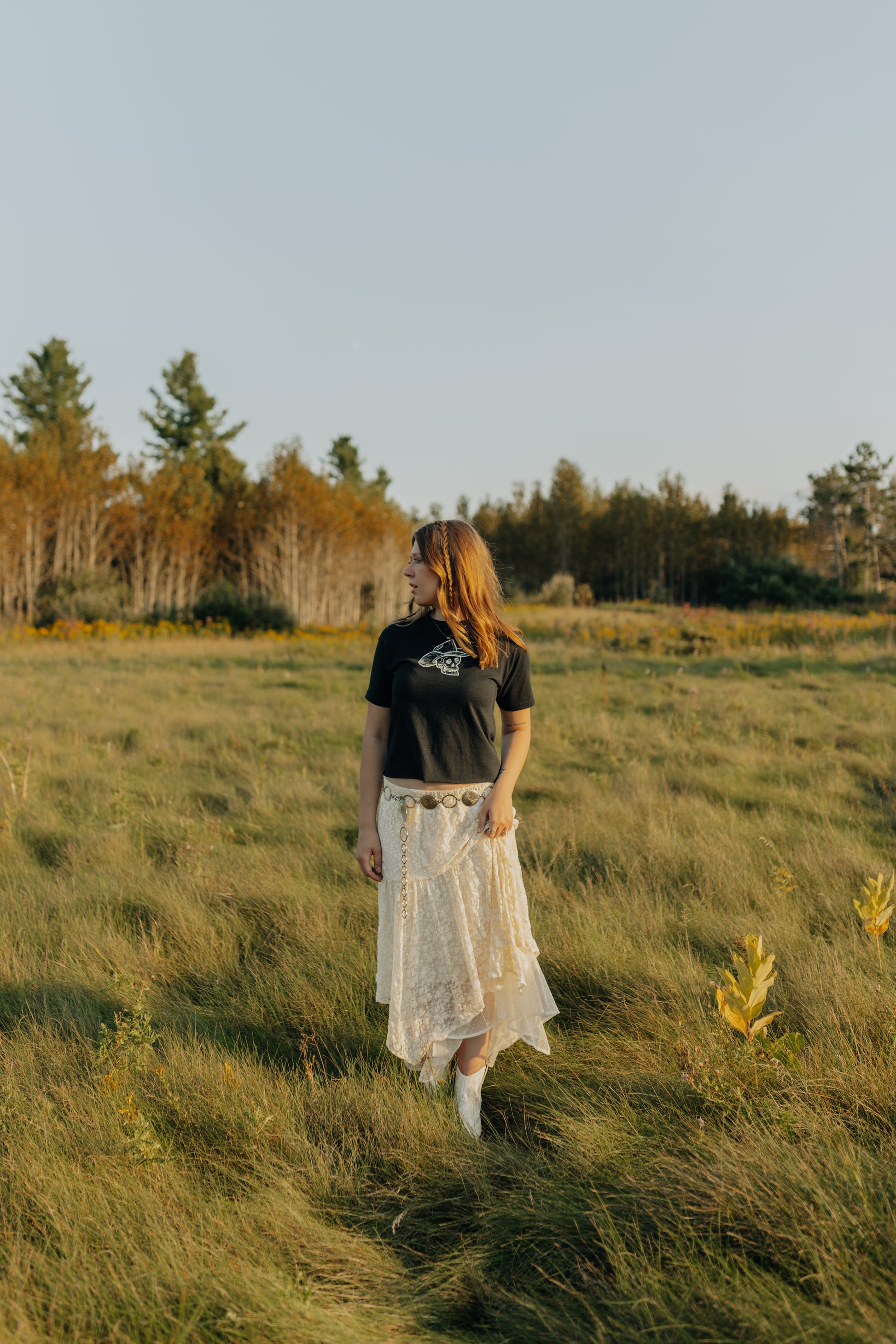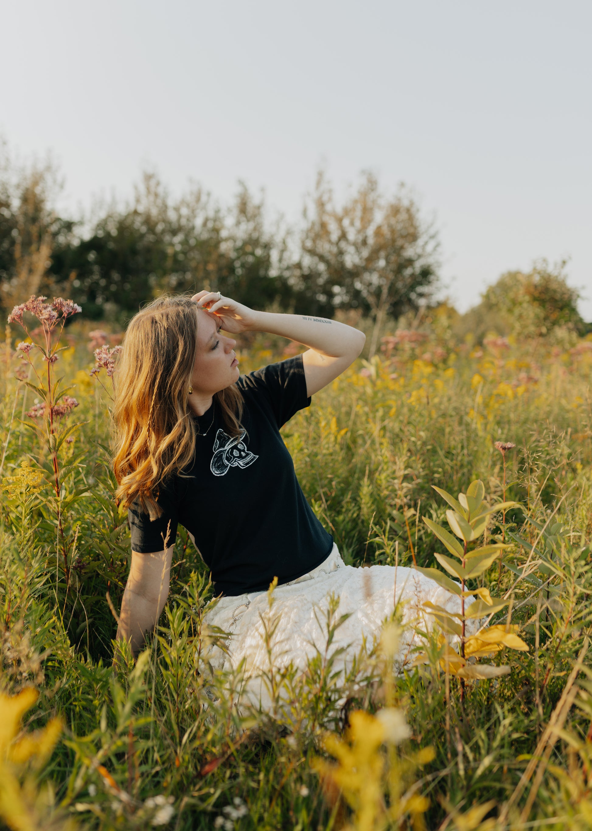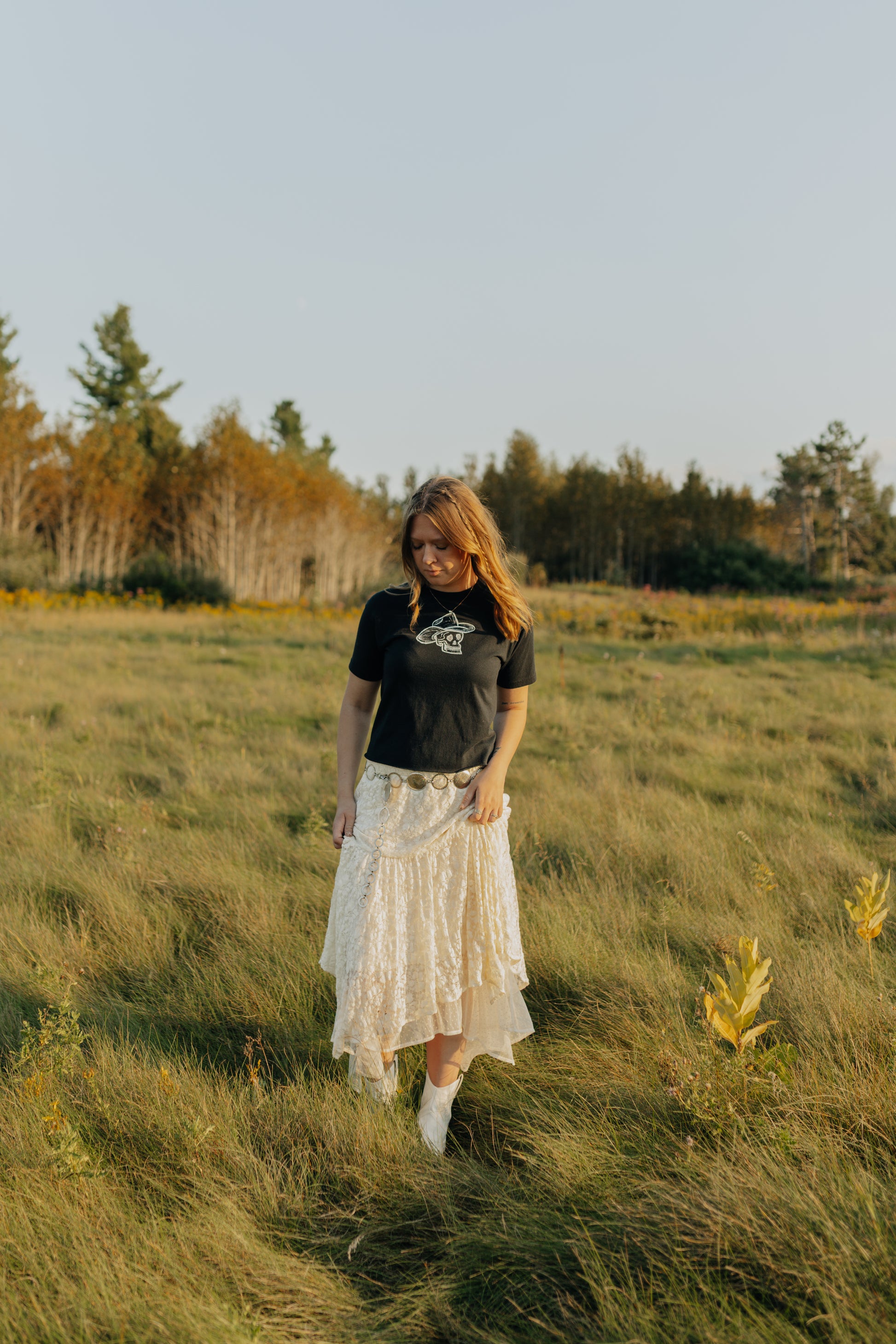 A thrifted, cropped black tshirt with a white hand painted skull wearing a cowboy hat.