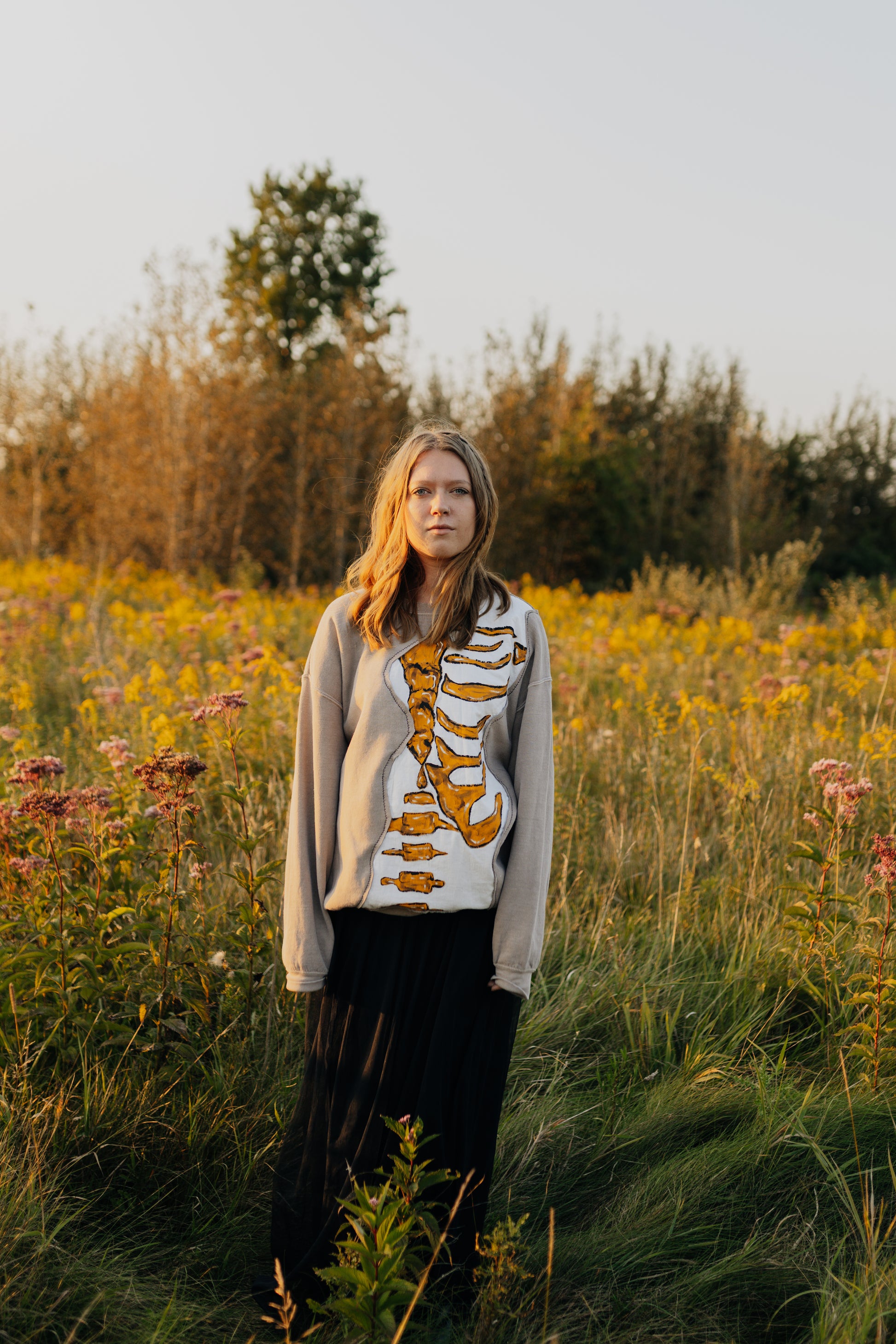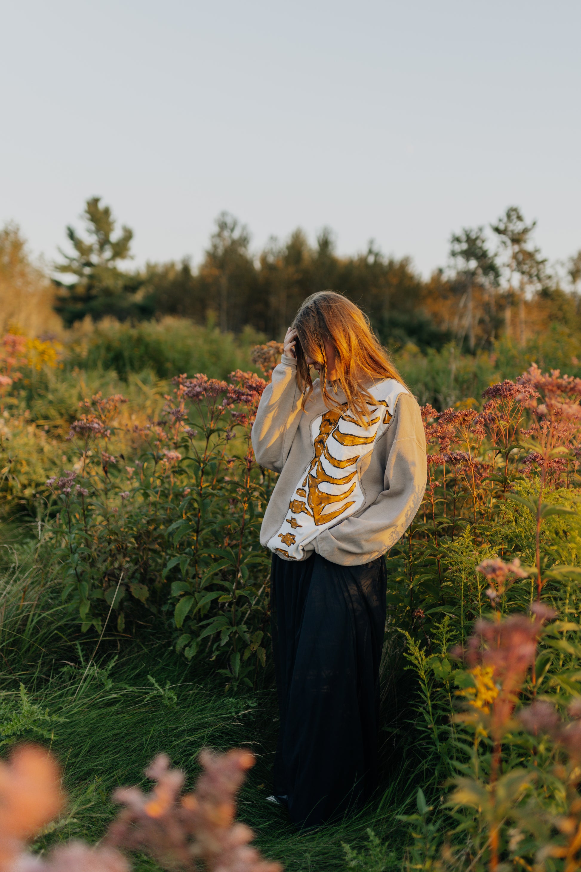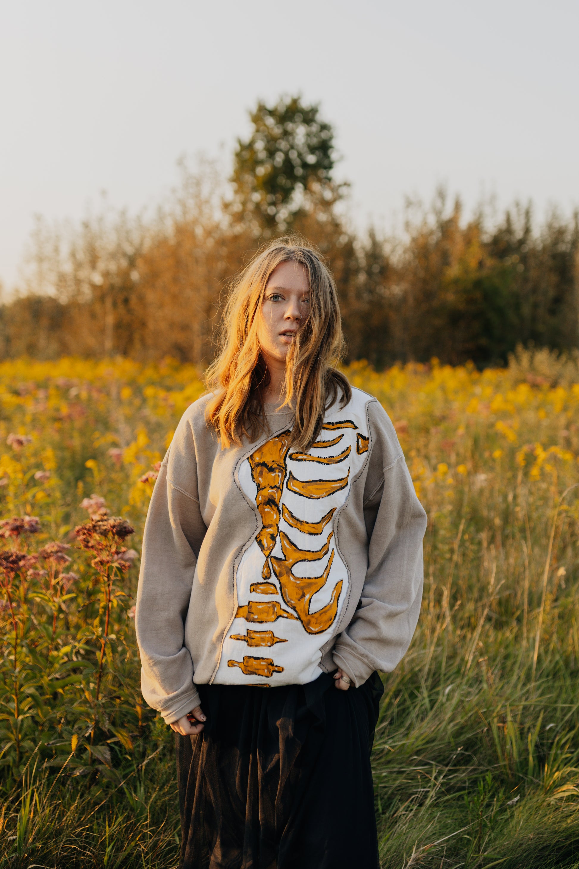 To create this piece I first cut out the original crewneck where i wanted to put in the patch, next I cut the shape out of white fabric, i then painted my design and sewed the patch on from the inside, I also sewed the crewneck fabric on the back of the patch so its still soft and has the same thickness as the rest of the crewneck!