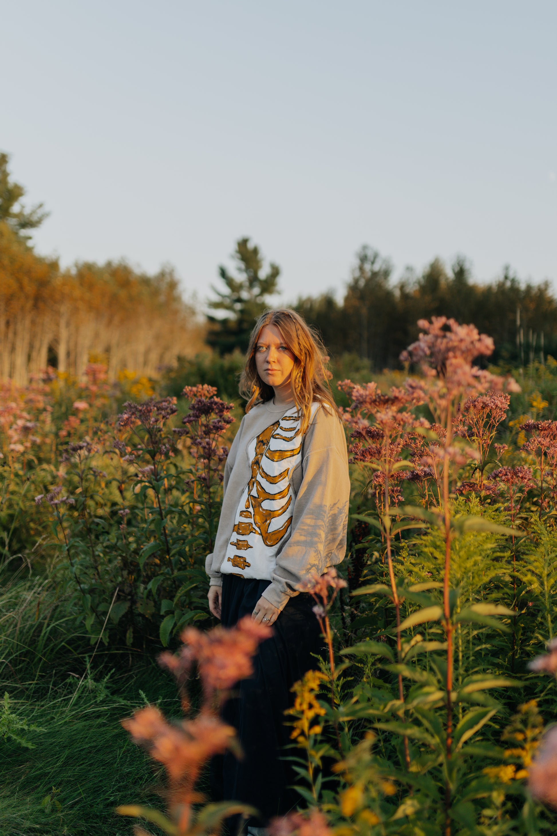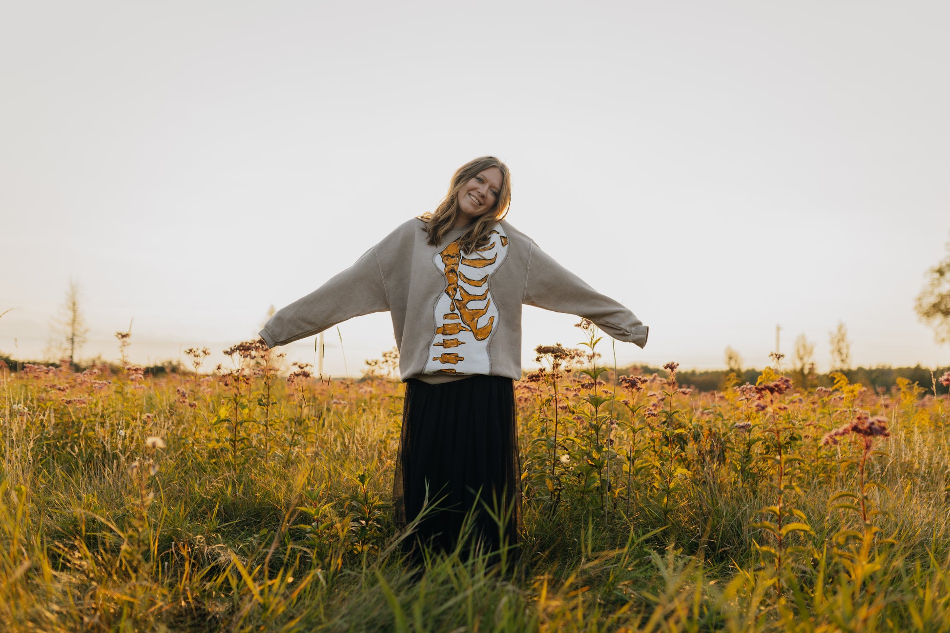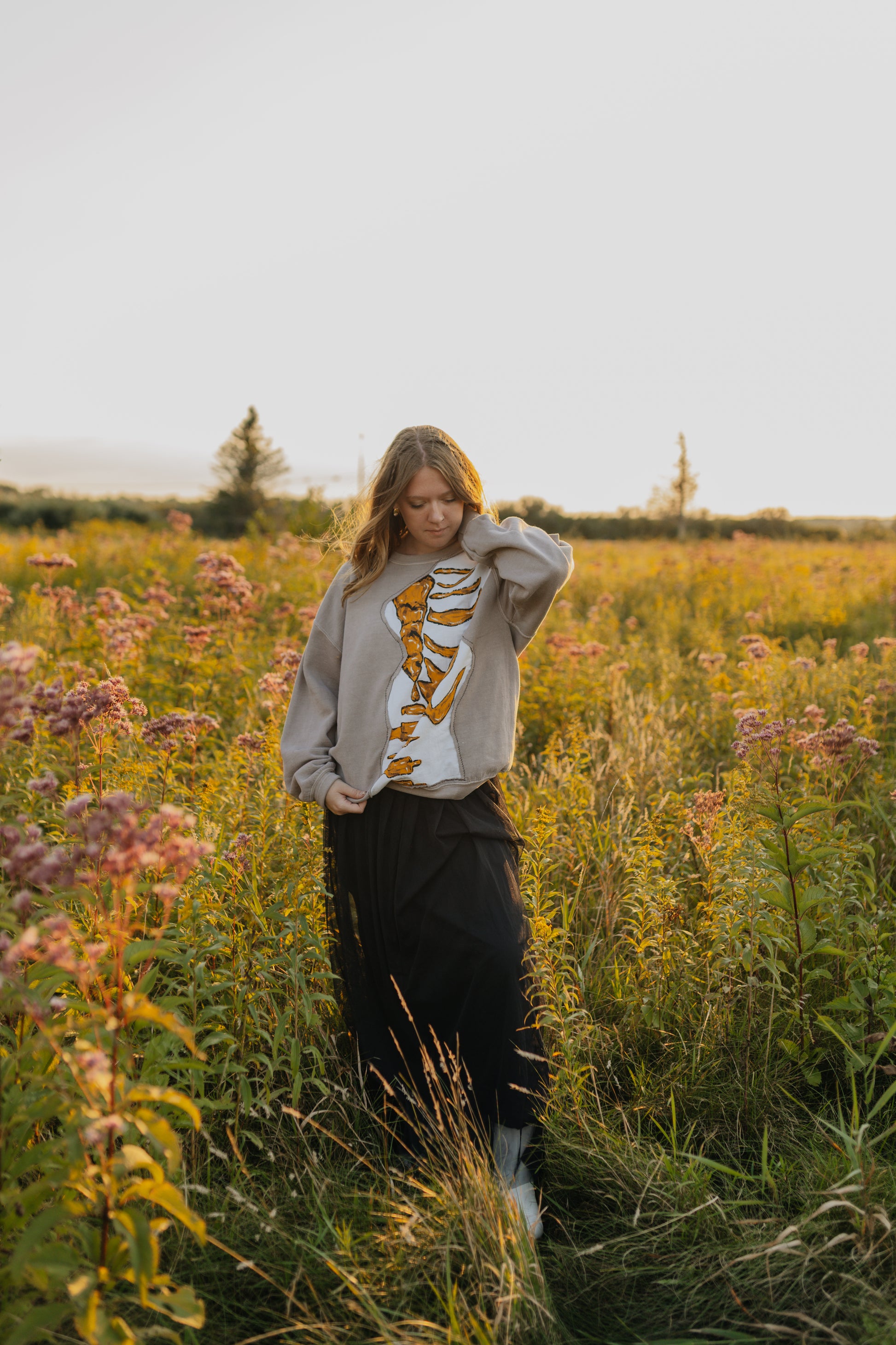 To create this piece I first cut out the original crewneck where i wanted to put in the patch, next I cut the shape out of white fabric, i then painted my design and sewed the patch on from the inside, I also sewed the crewneck fabric on the back of the patch so its still soft and has the same thickness as the rest of the crewneck!