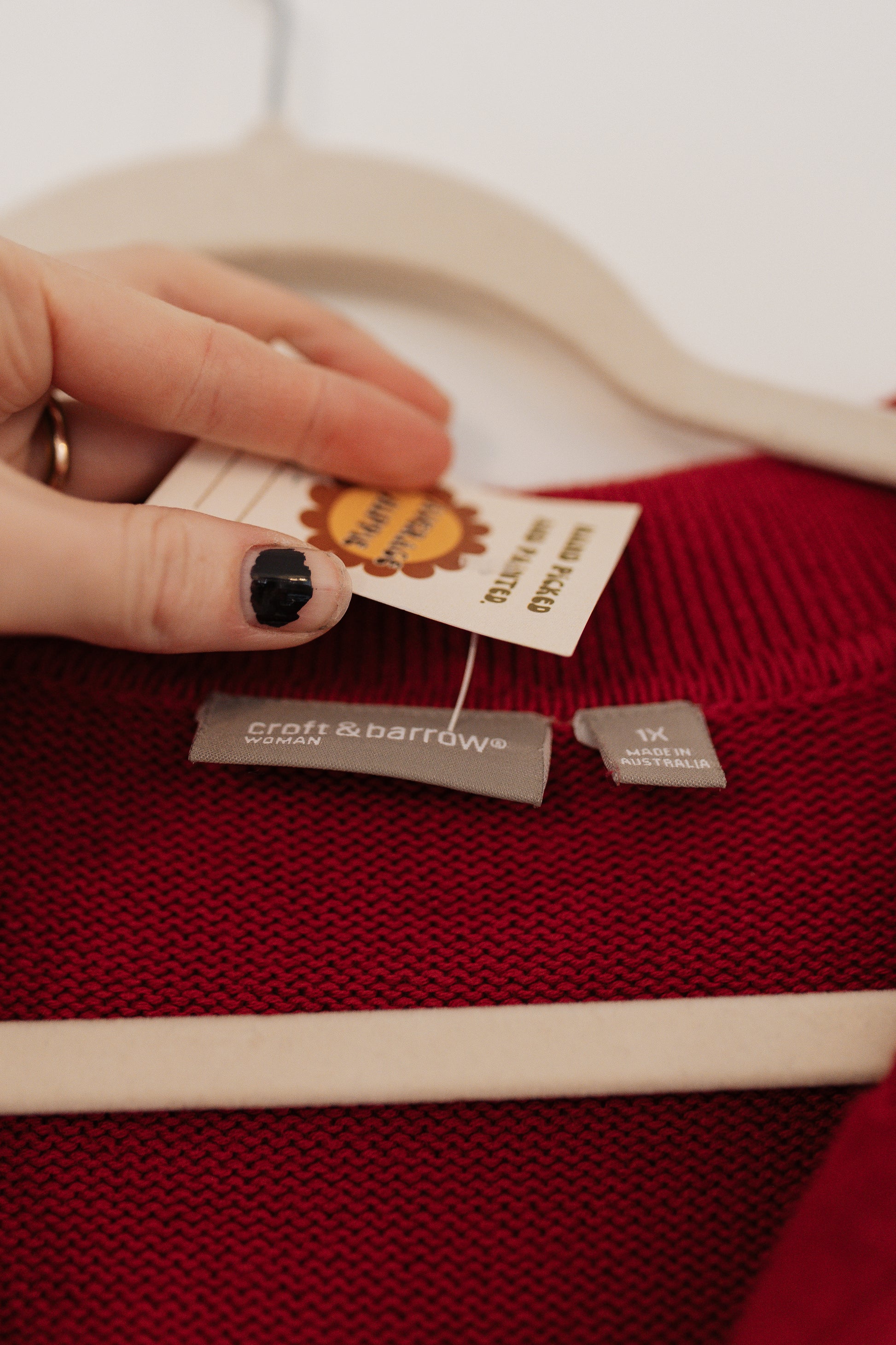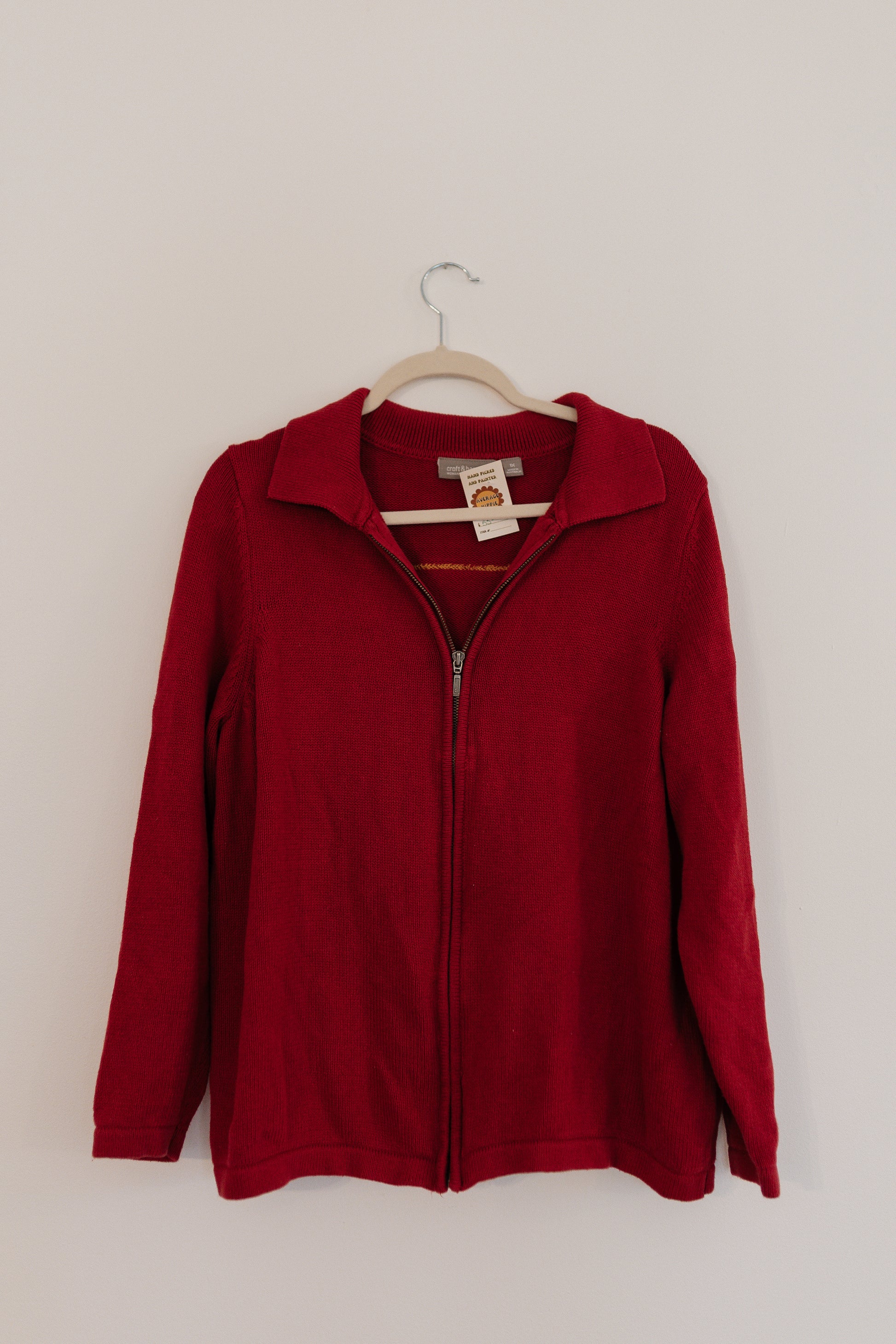 Thrifted Red knit sweater with blue painted fish. Was hand painted and sewn. Machine washable.
