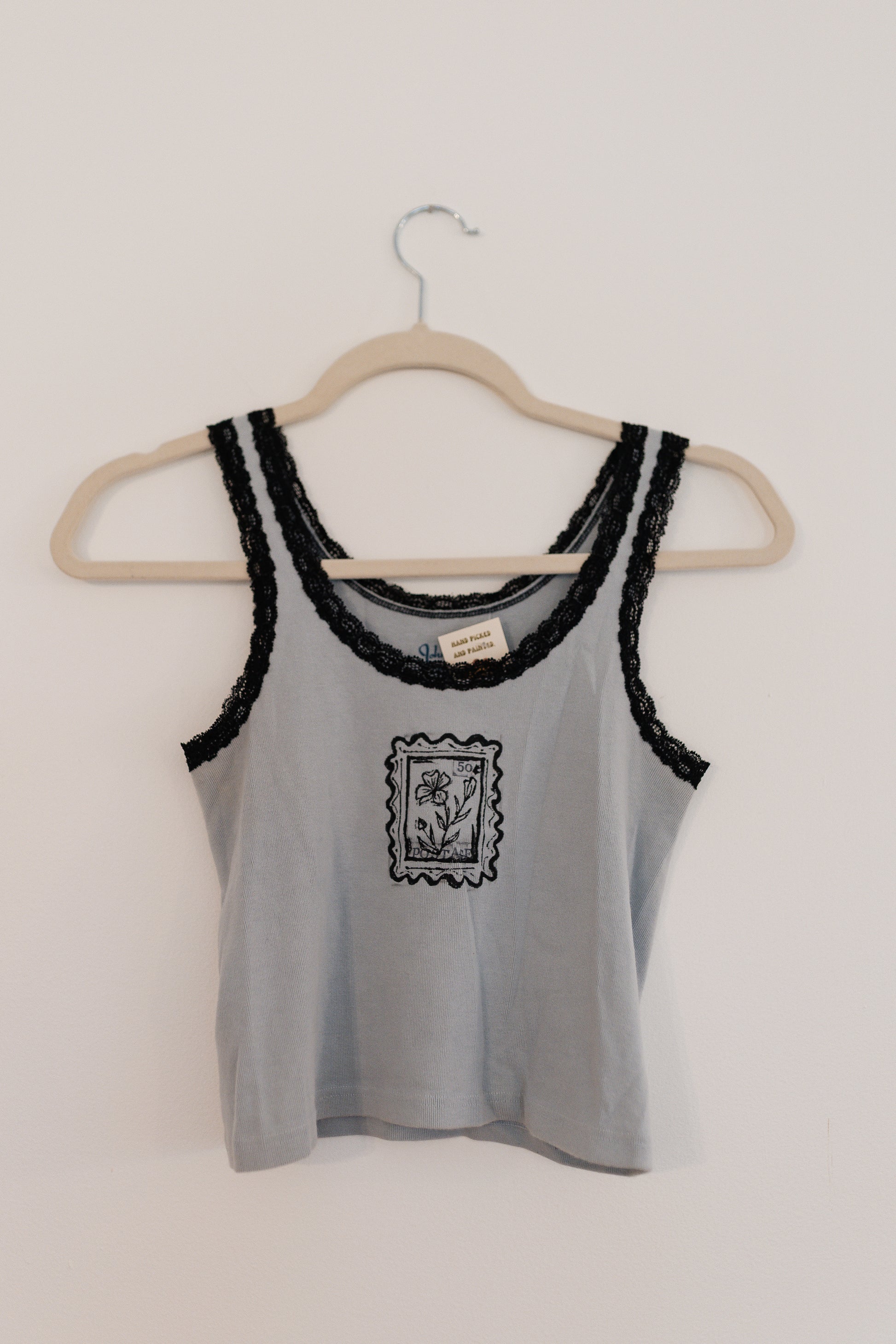 Blue tank with a stamp design on it. Hand painted by me, machine washable