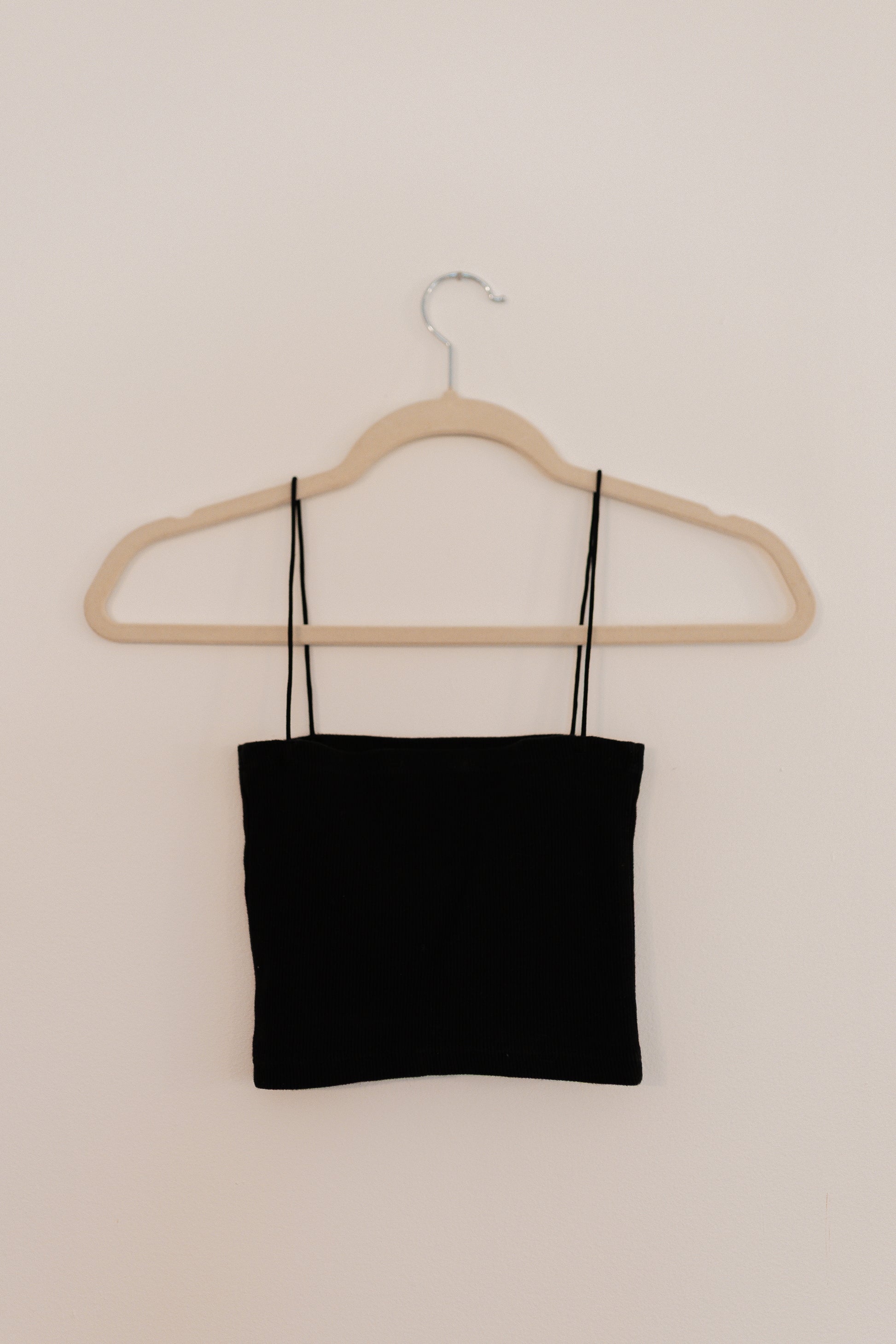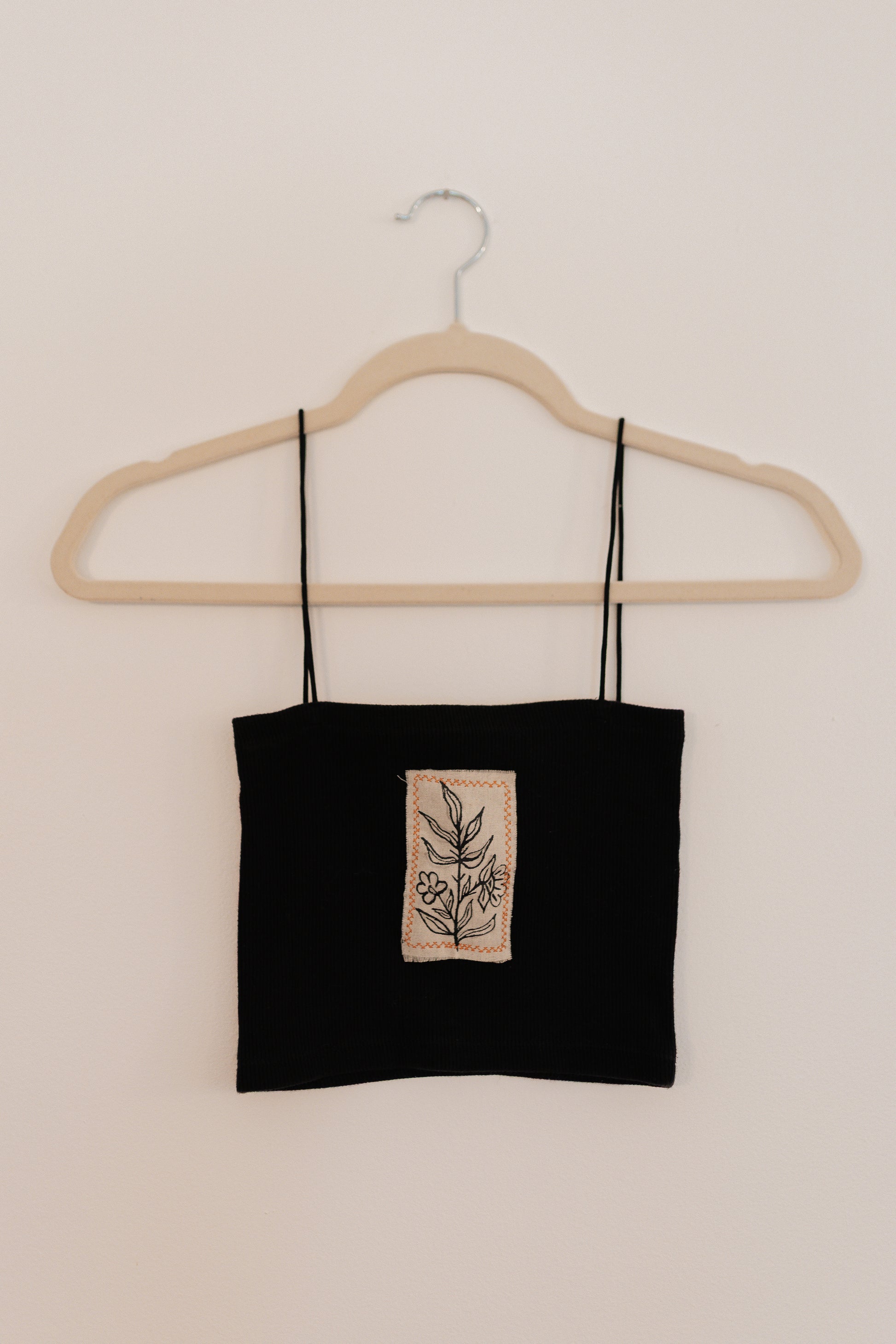 Black cropped tank with a patched floral design. Painted and upcycled by me. Machine washable.