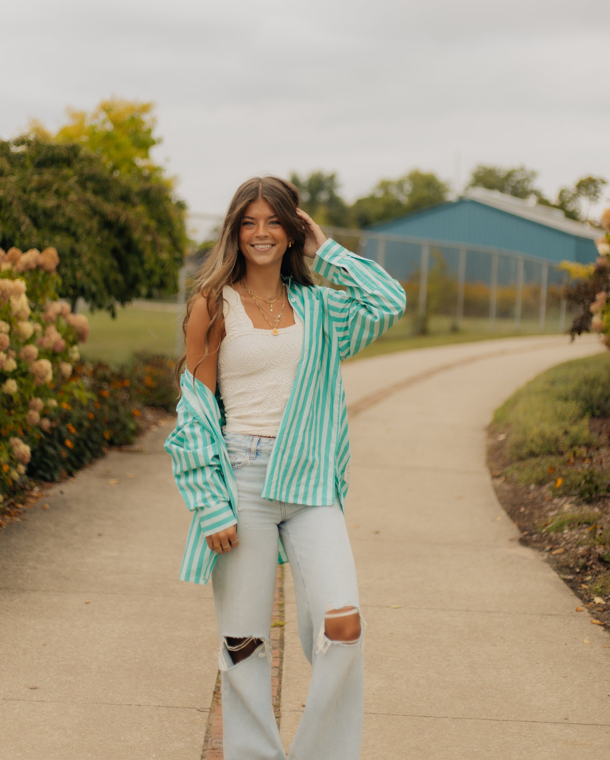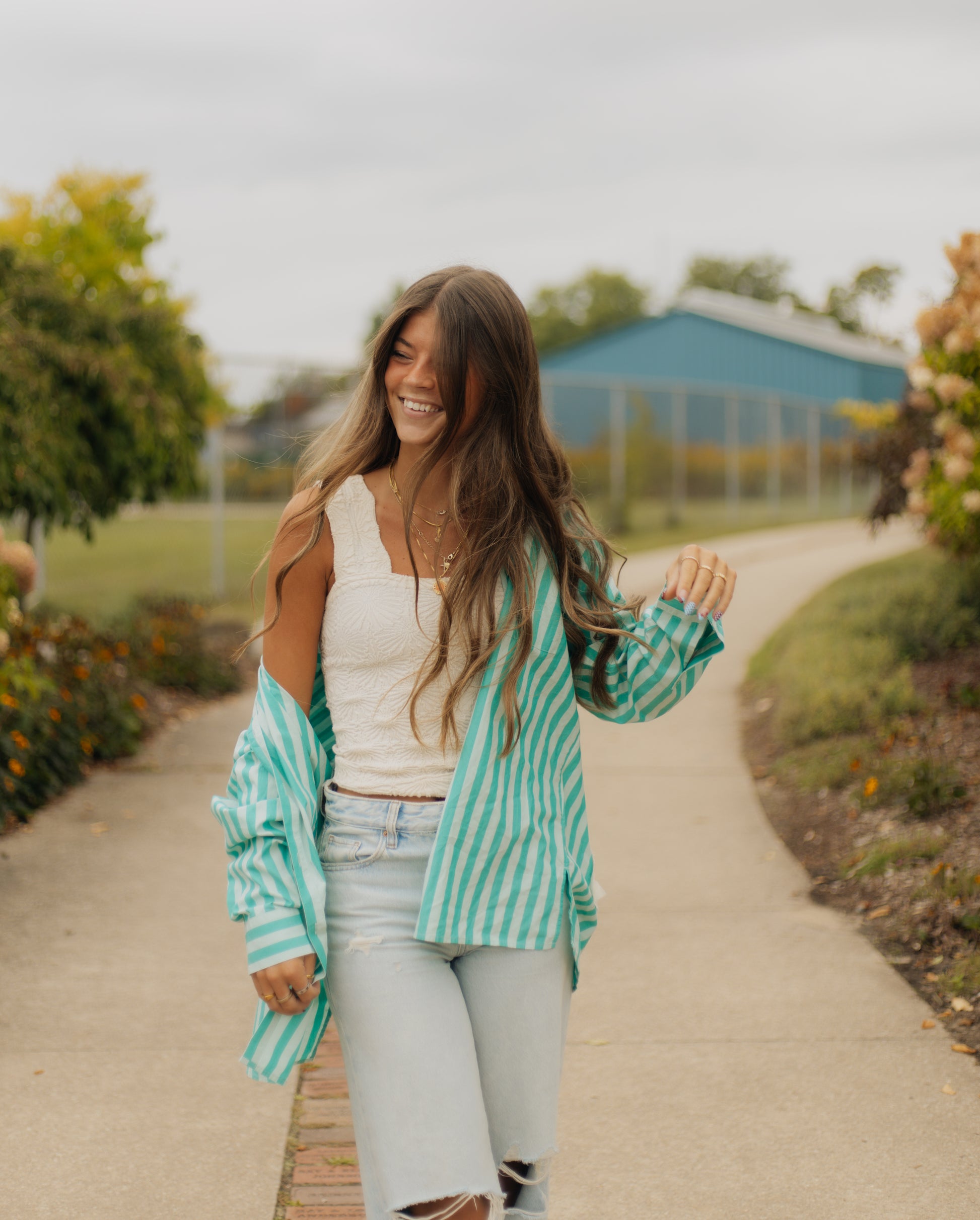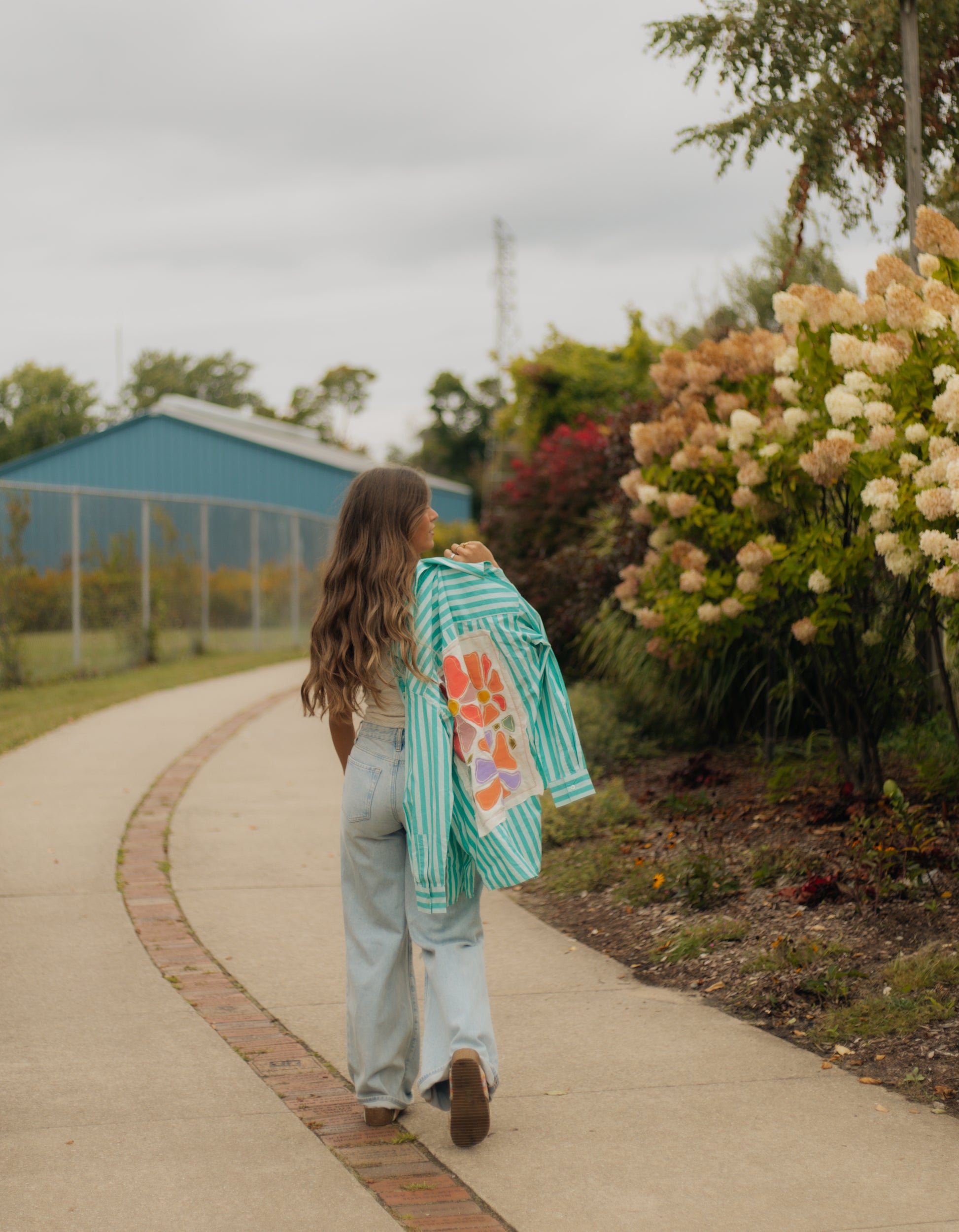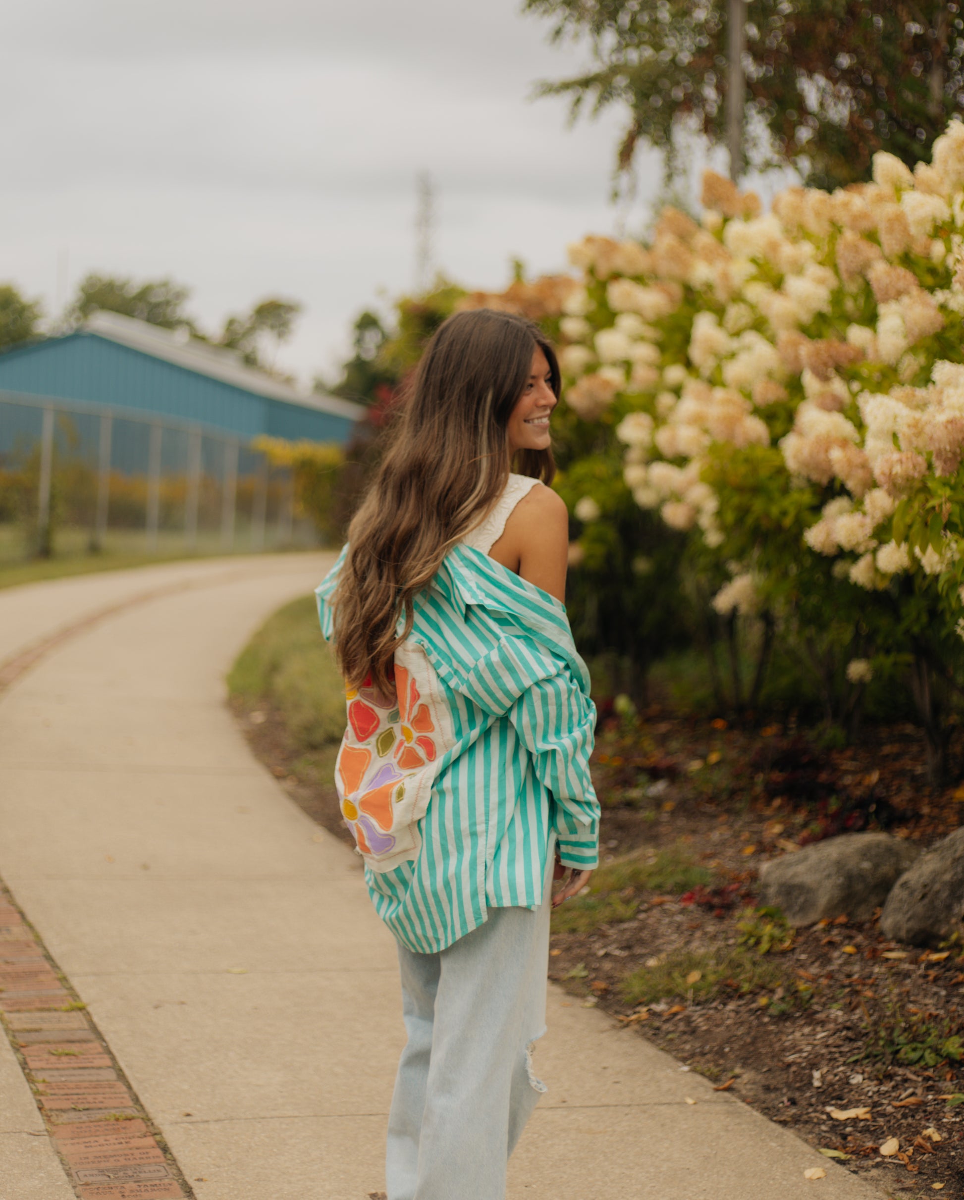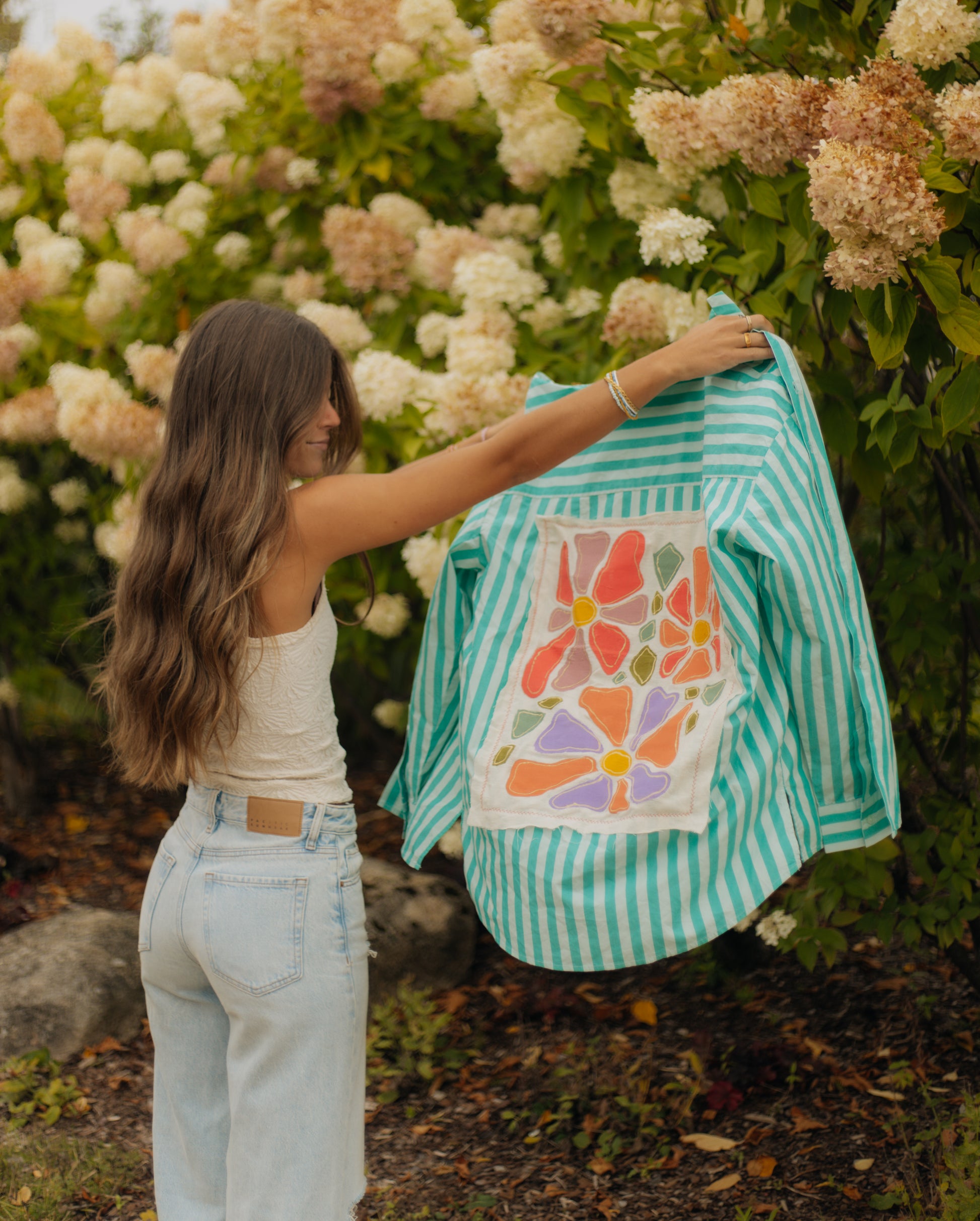This teal striped button up was thrifted and still has the tags on it. I then sewed on a colorful floral patch on the back that was hand painted by me.