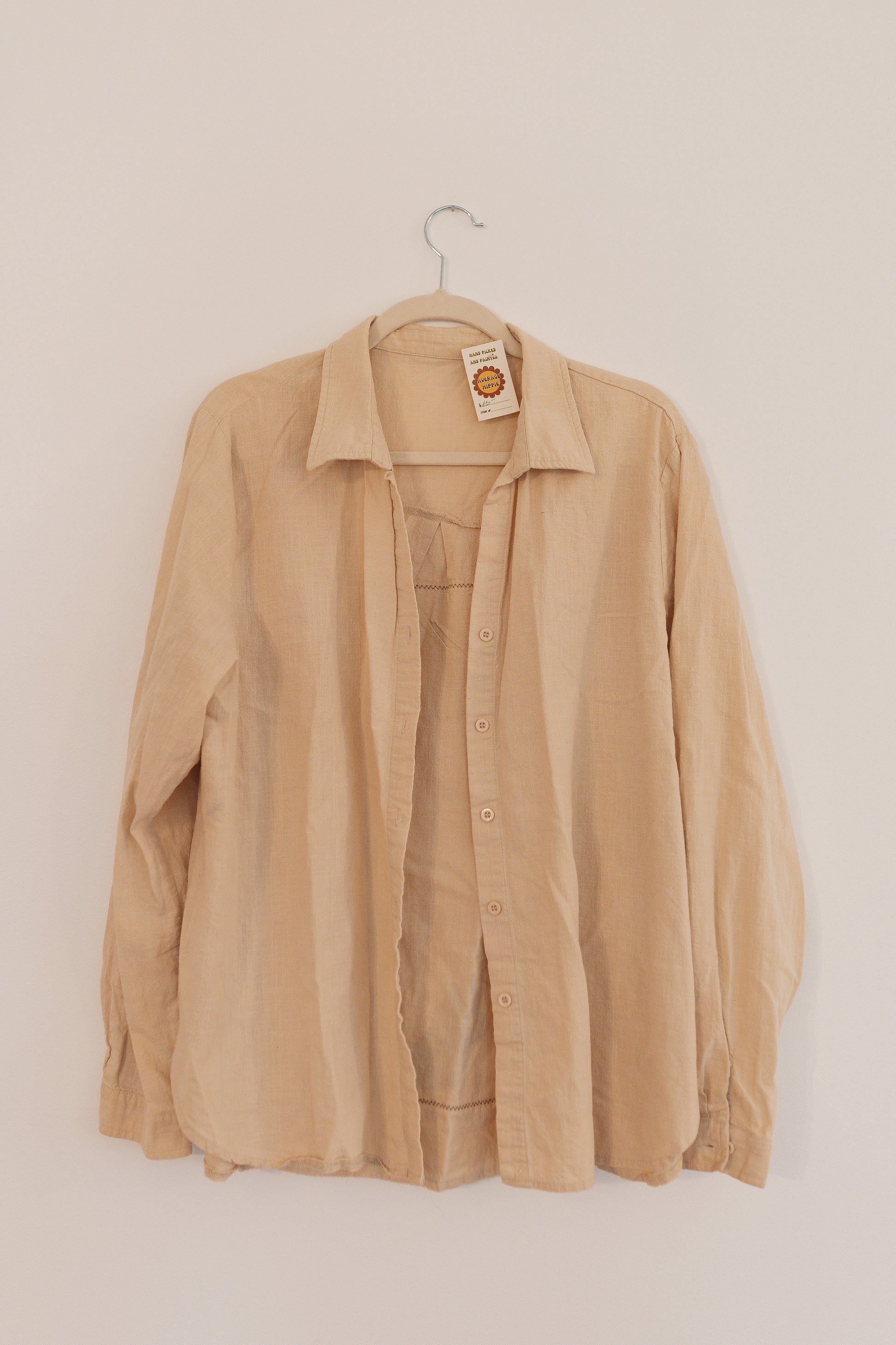 Thrifted cream button up long sleeve with a hand painted fruit patch sewn on the back. Machine washable.