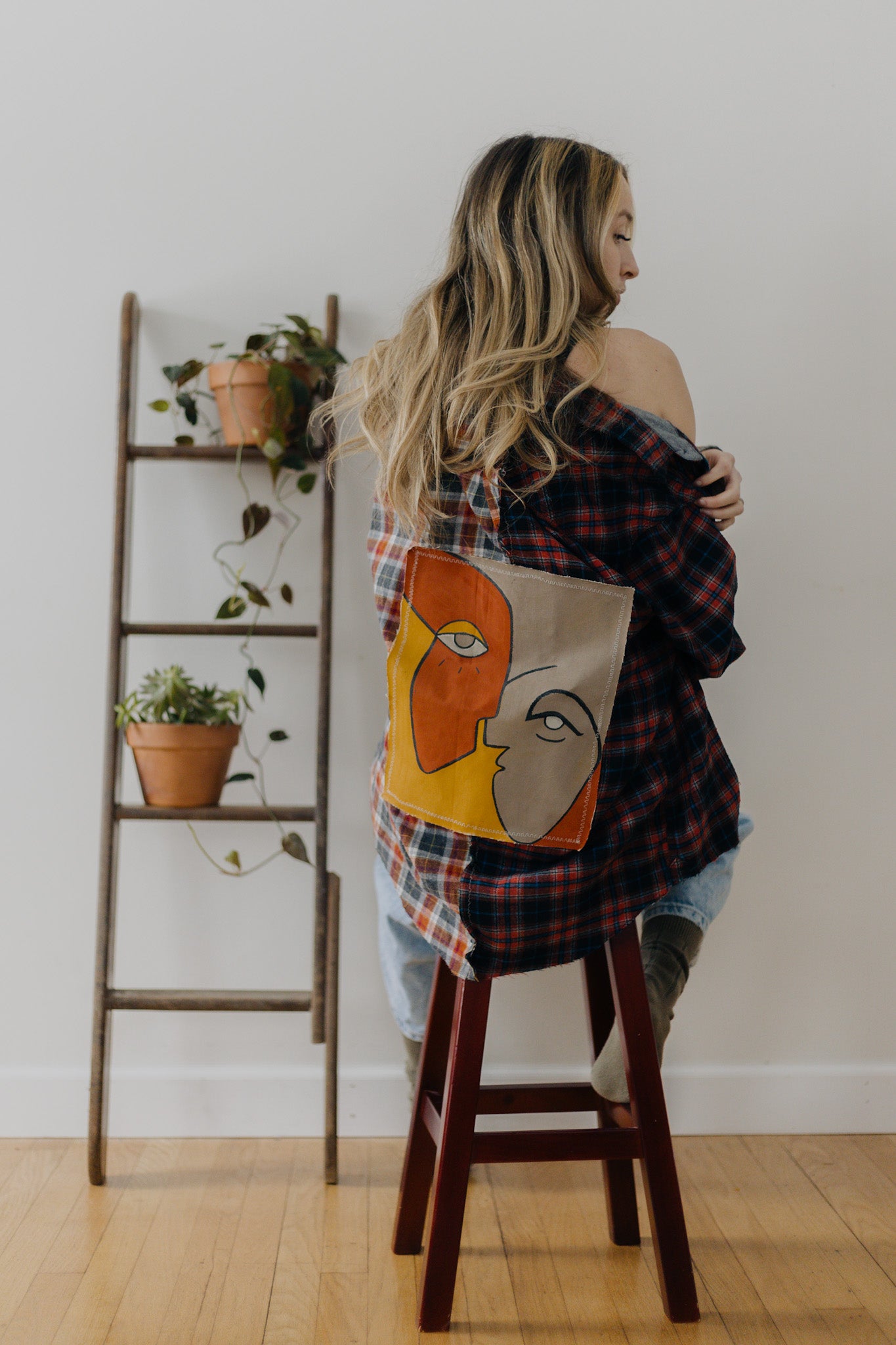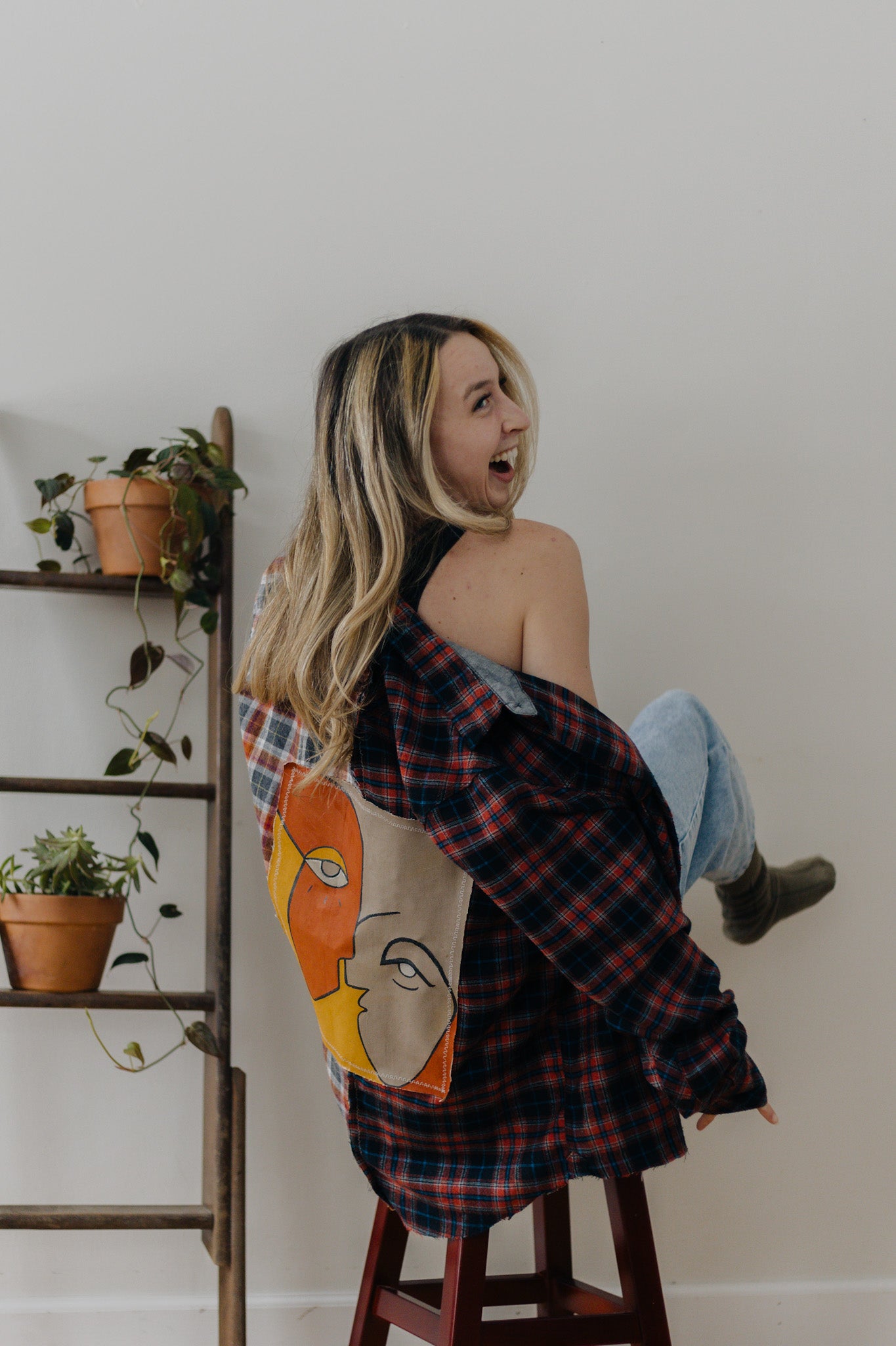 Funky colorful flannel to add some spice to your fit. This flannel was two thrifted flannels cut in half and sewn together, then the patch was hand painted and sewn on.