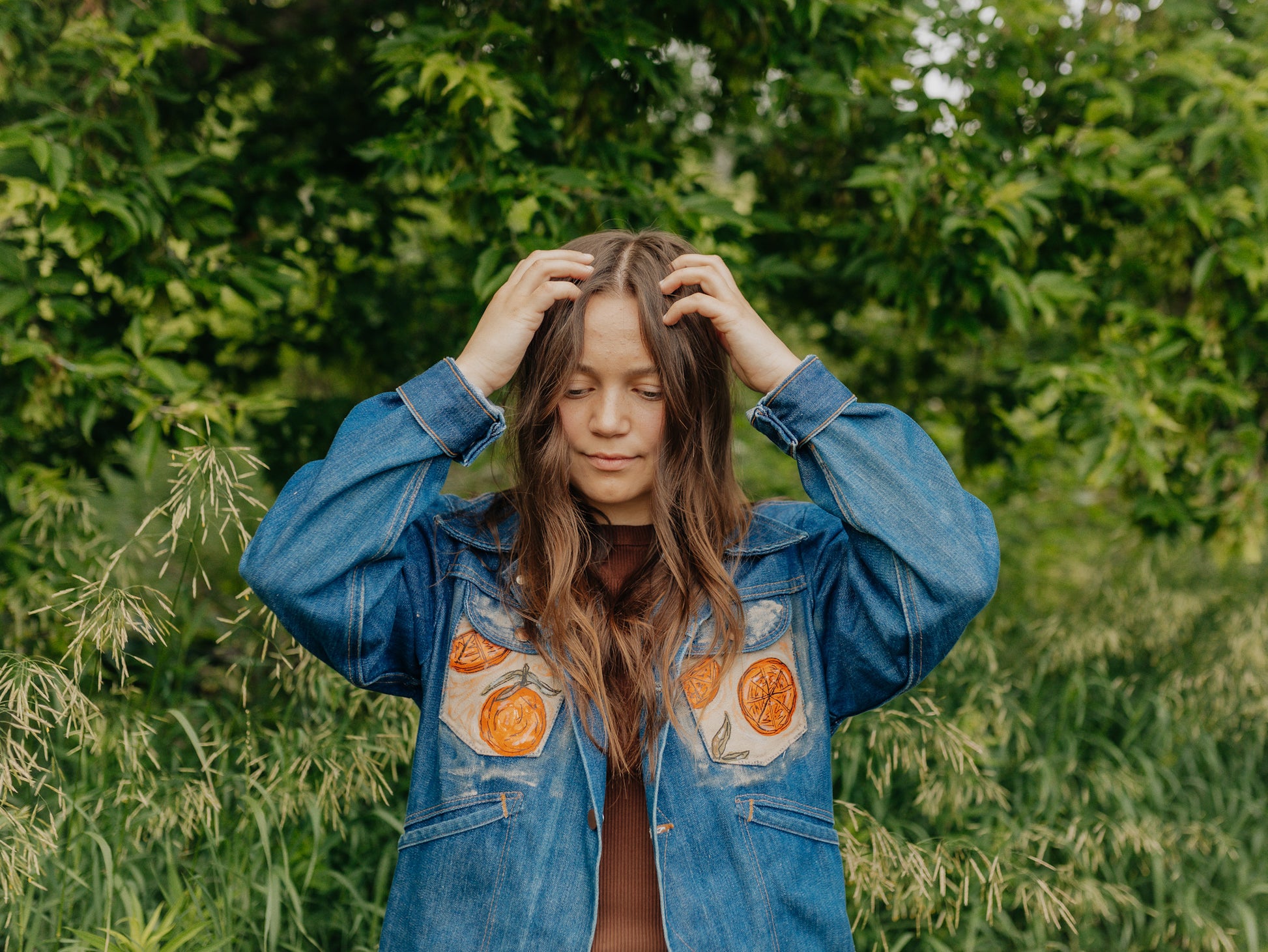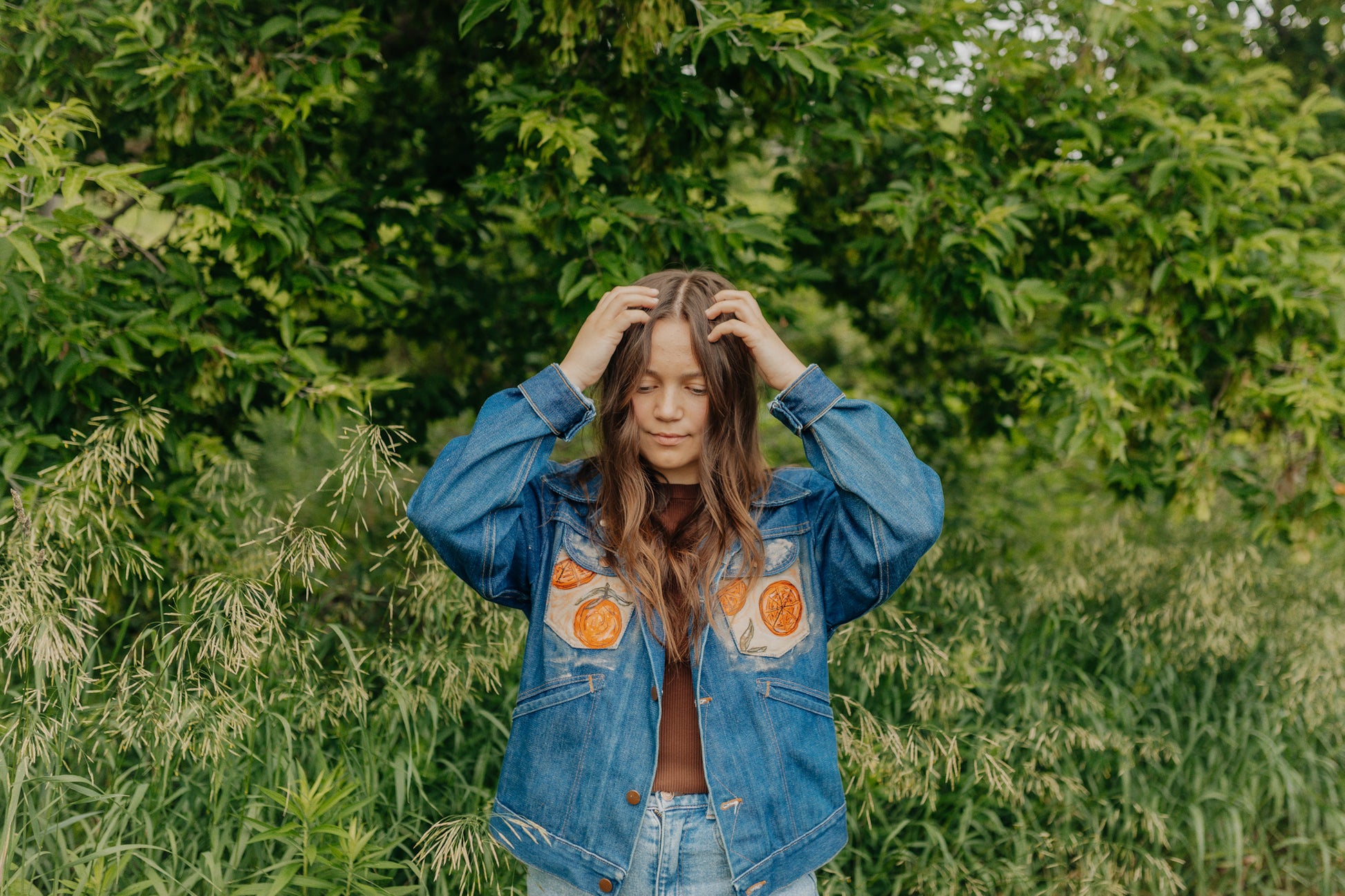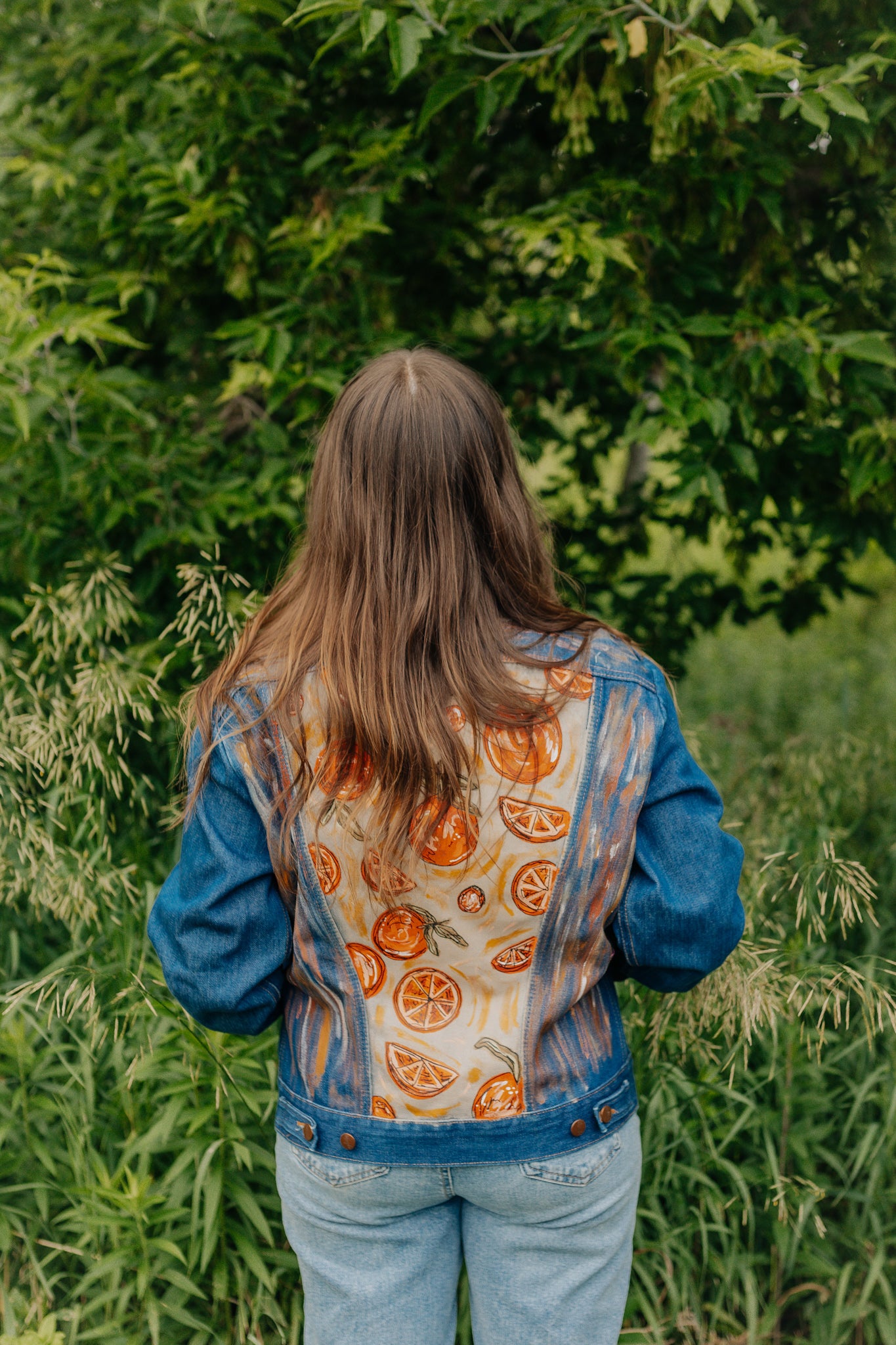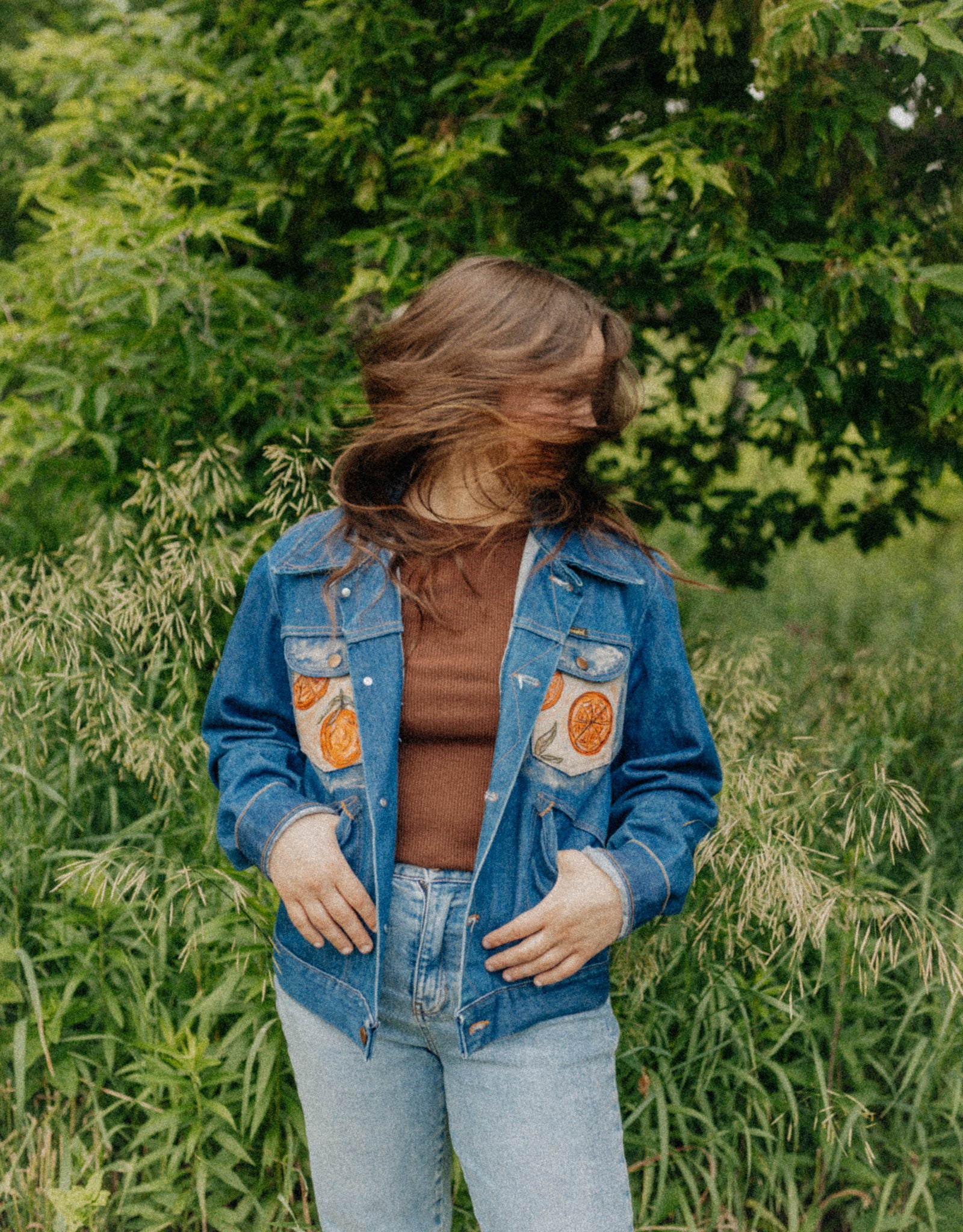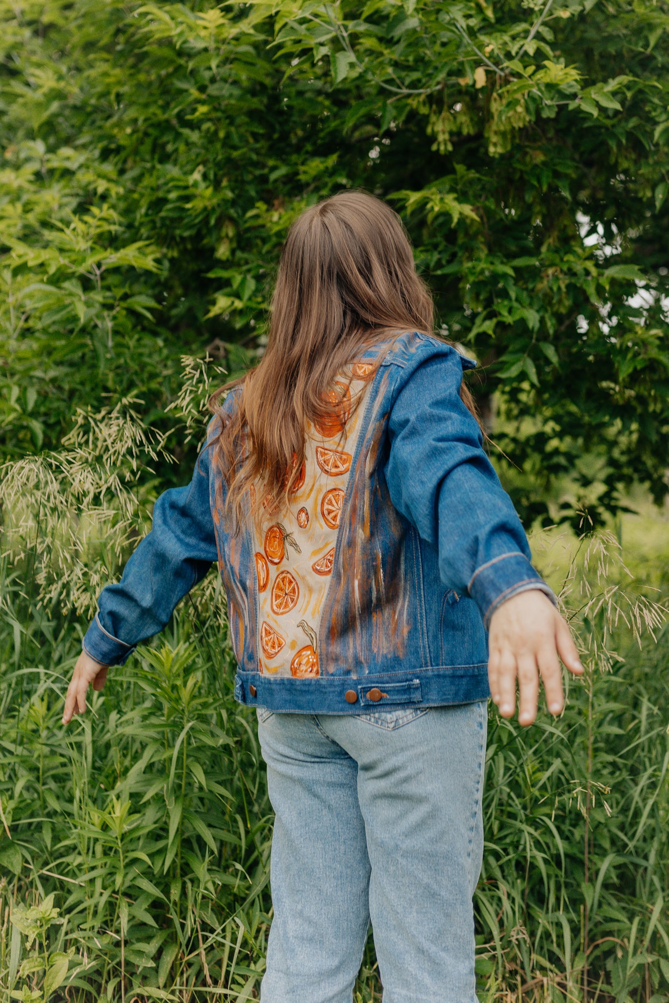 This jacket was thrifted and hand painted, its fruity and fun on the front and back!