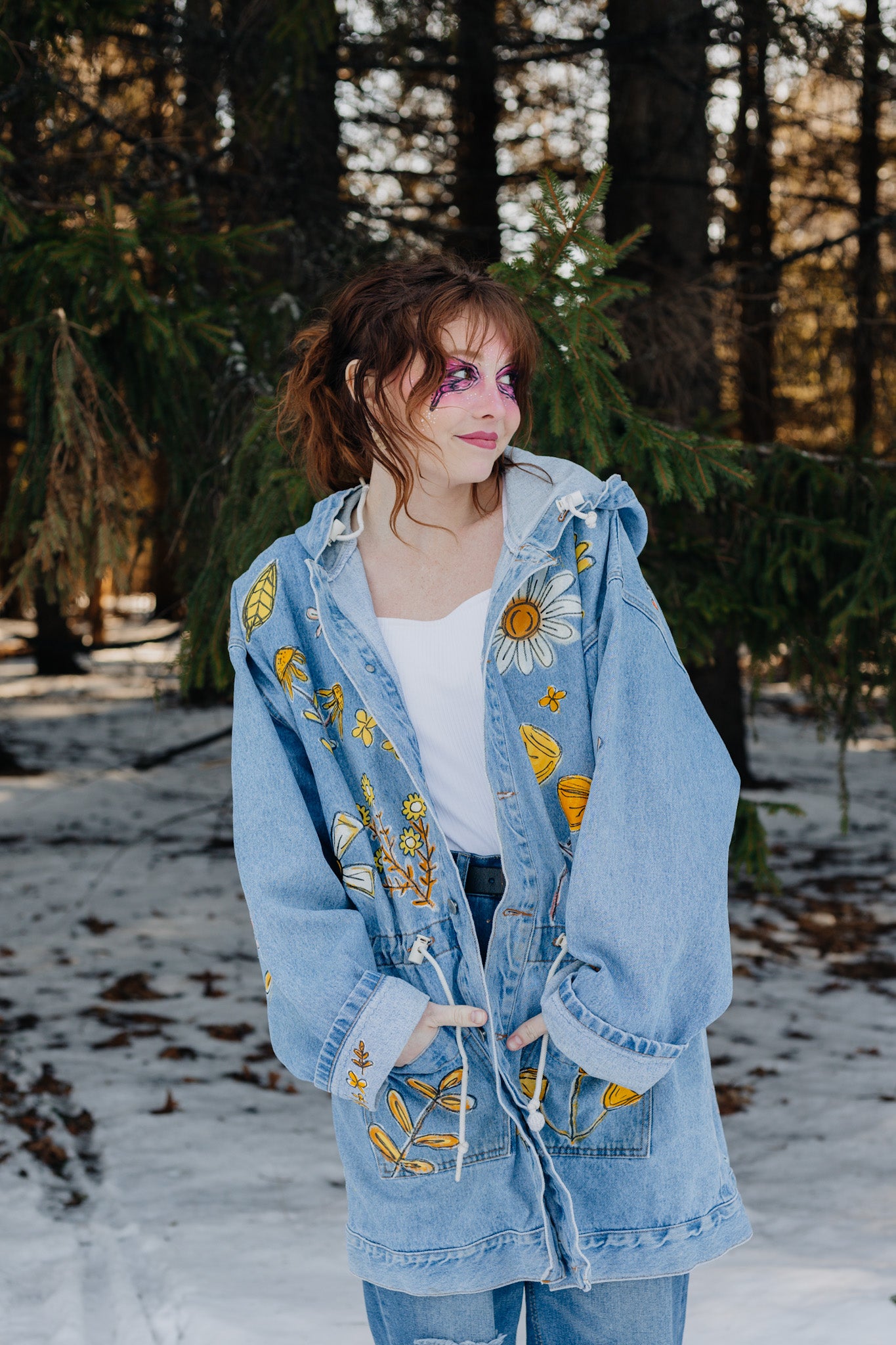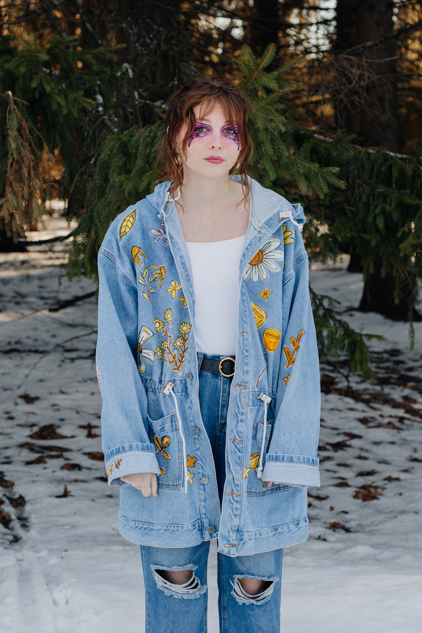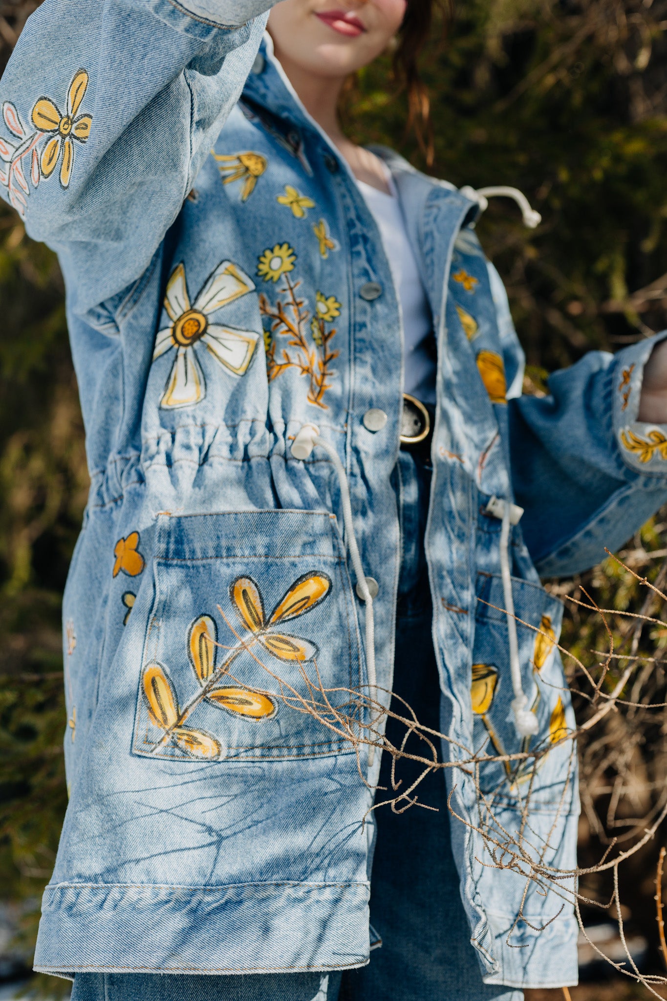 Own a piece of wearable art with this truly unique and funky jean jacket! Hand-painted with vibrant yellow flowers, this jacket is a true expression of joy and happiness. The bold and playful design is sure to turn heads and bring a smile to everyone's face. Don't miss out on the chance to own this one-of-a-kind jacket and showcase your individual style.