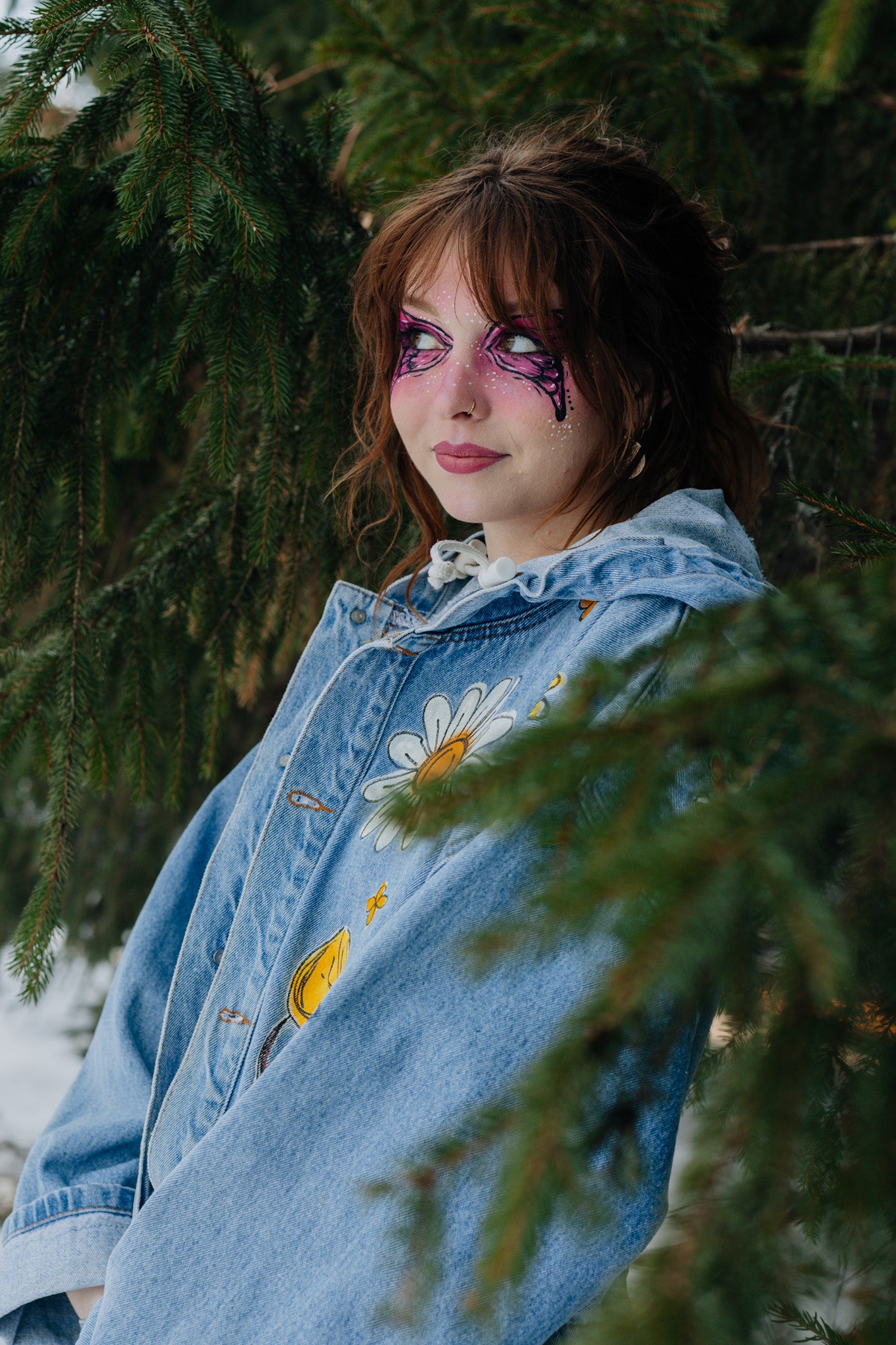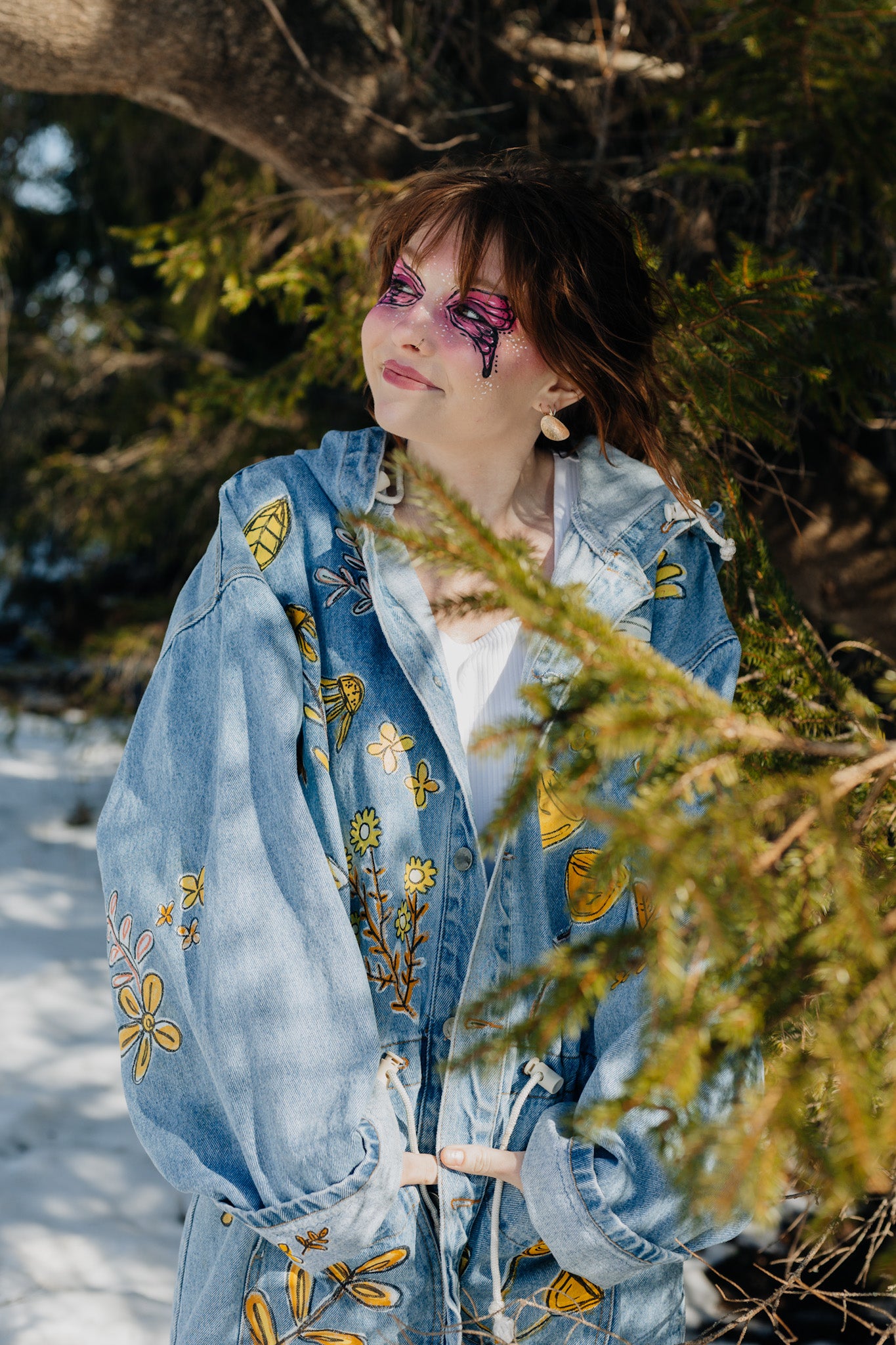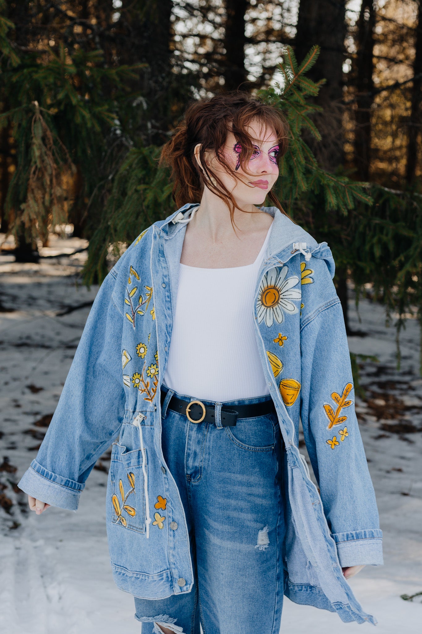Own a piece of wearable art with this truly unique and funky jean jacket! Hand-painted with vibrant yellow flowers, this jacket is a true expression of joy and happiness. The bold and playful design is sure to turn heads and bring a smile to everyone's face. Don't miss out on the chance to own this one-of-a-kind jacket and showcase your individual style.