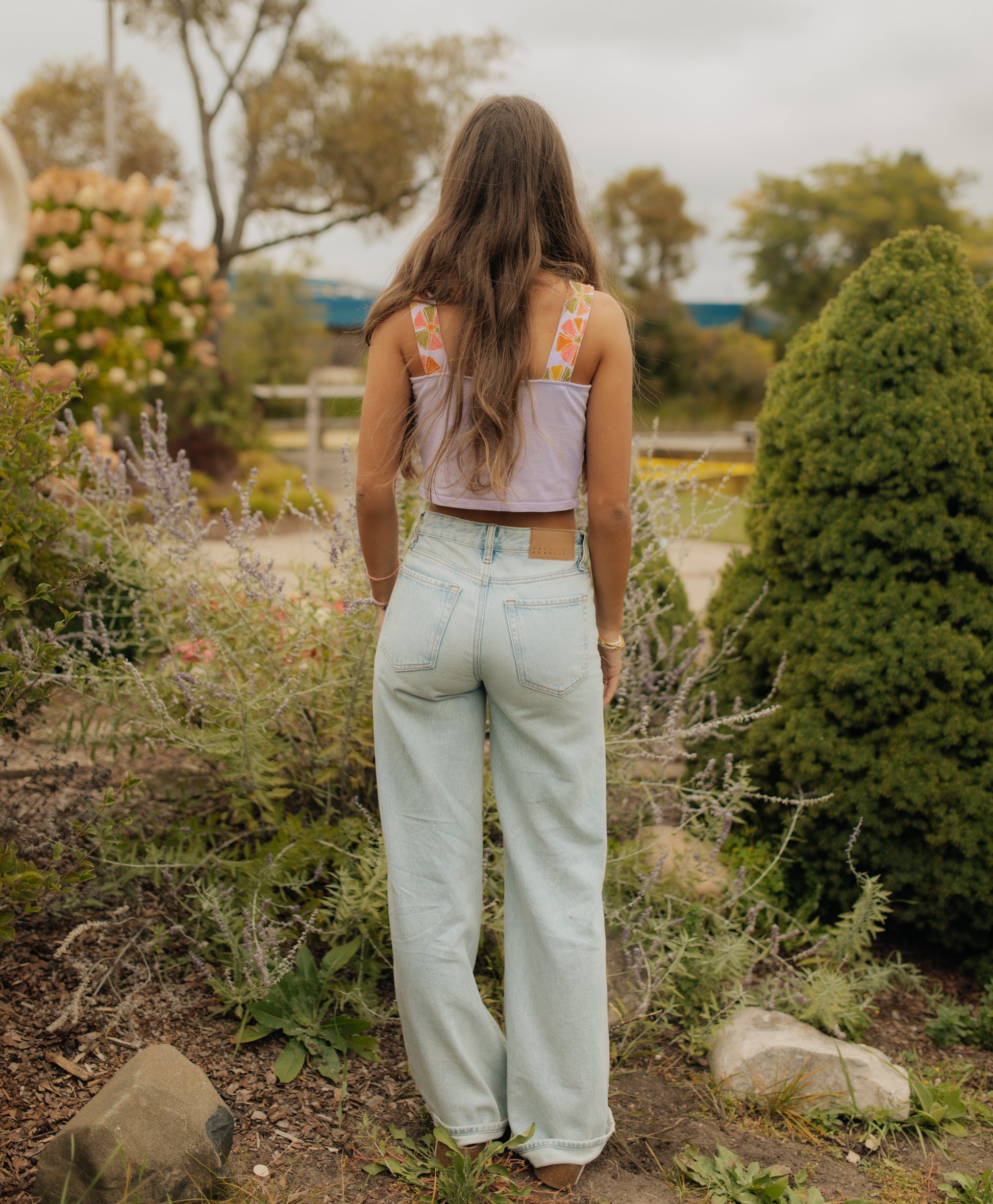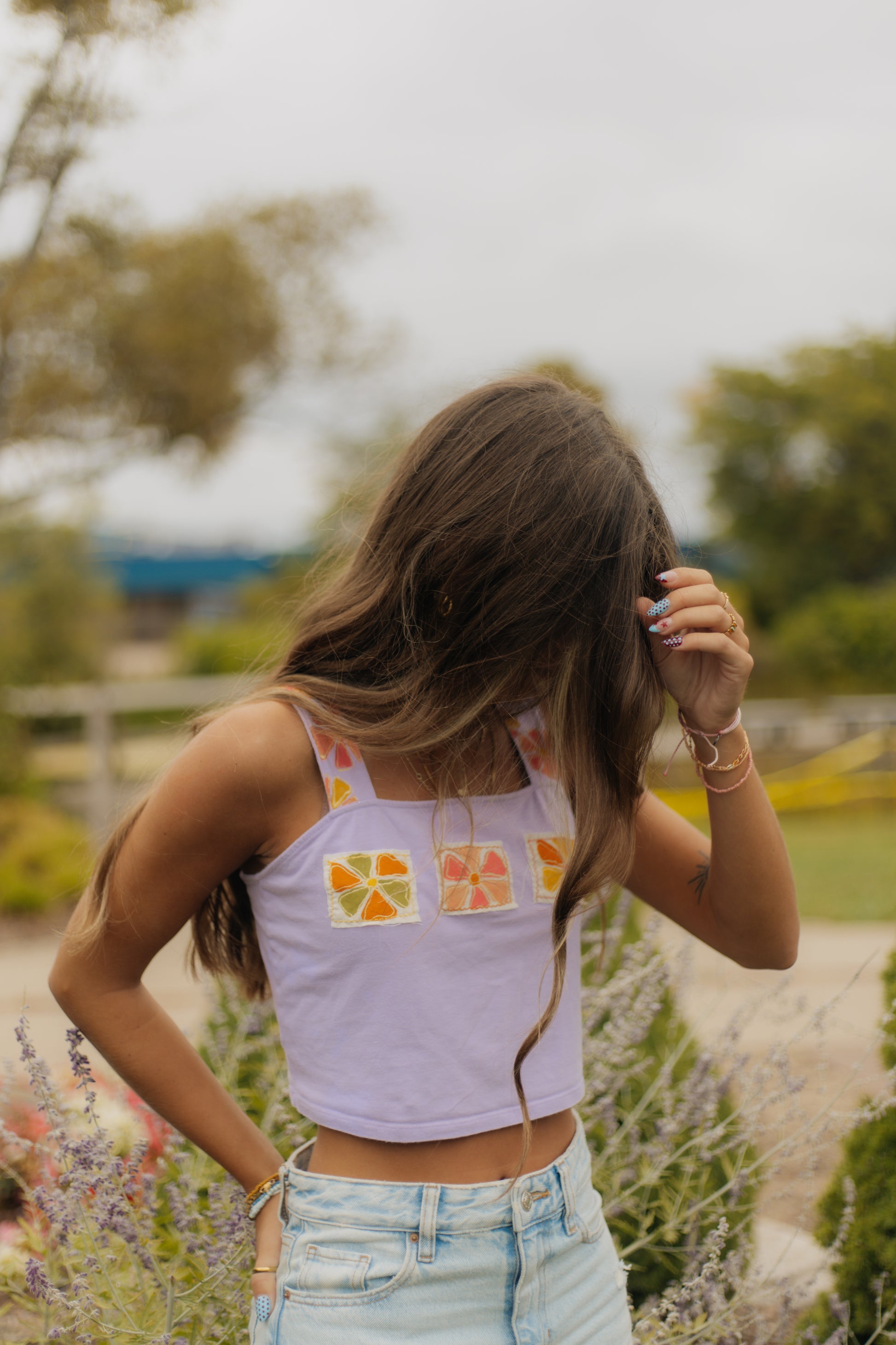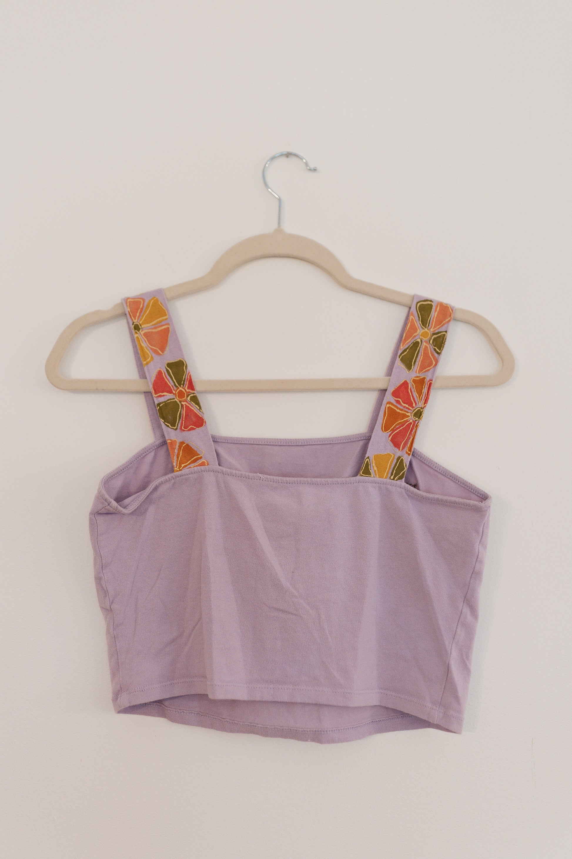 A purple tank that was thrifted and then patched. The patches were hand painted then sewn on, that straps on the tank were hand painted as well.
