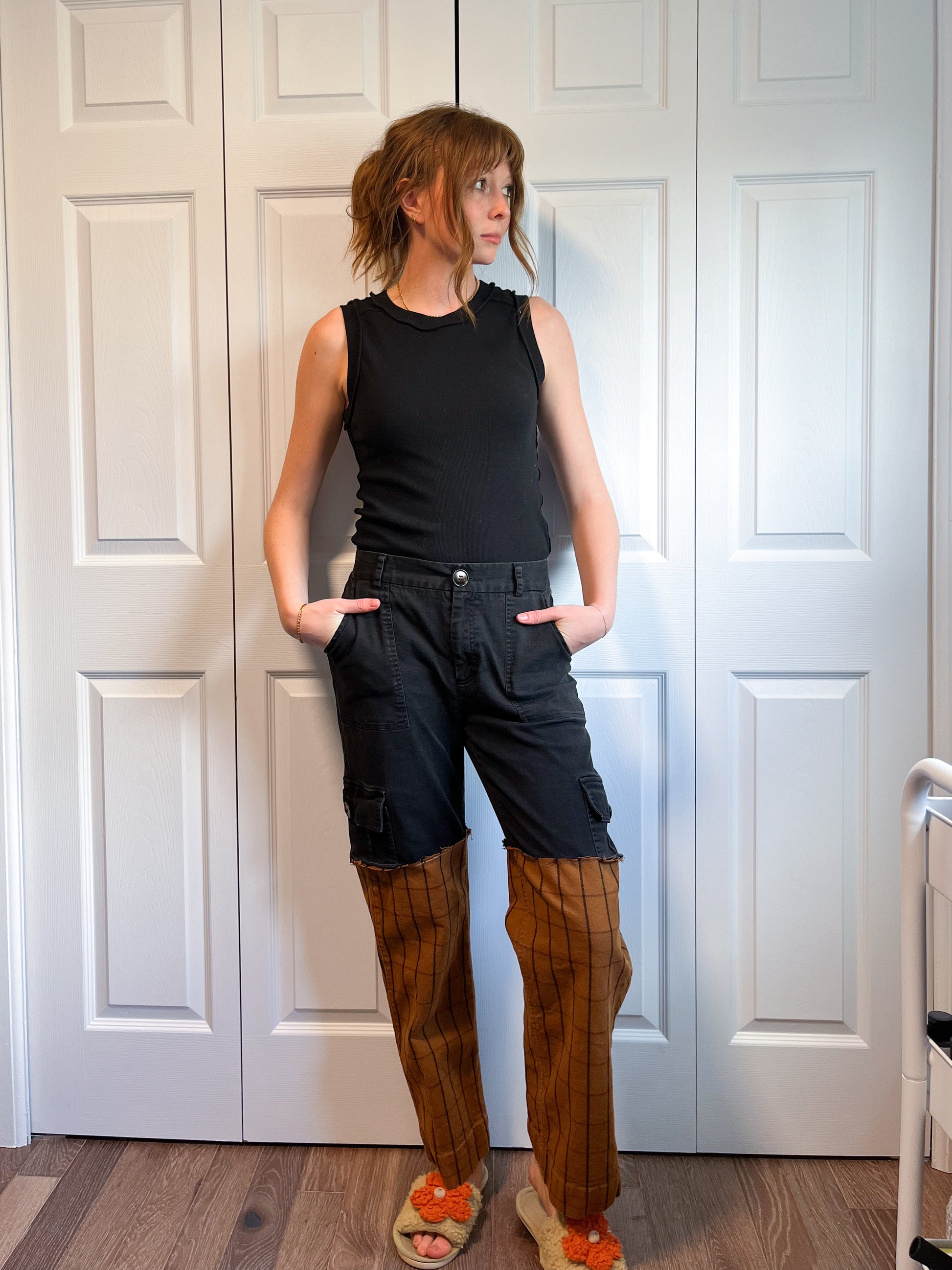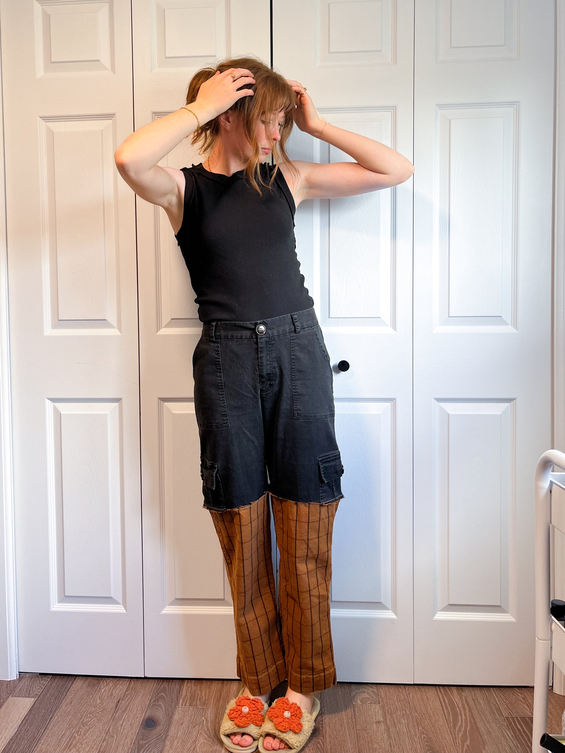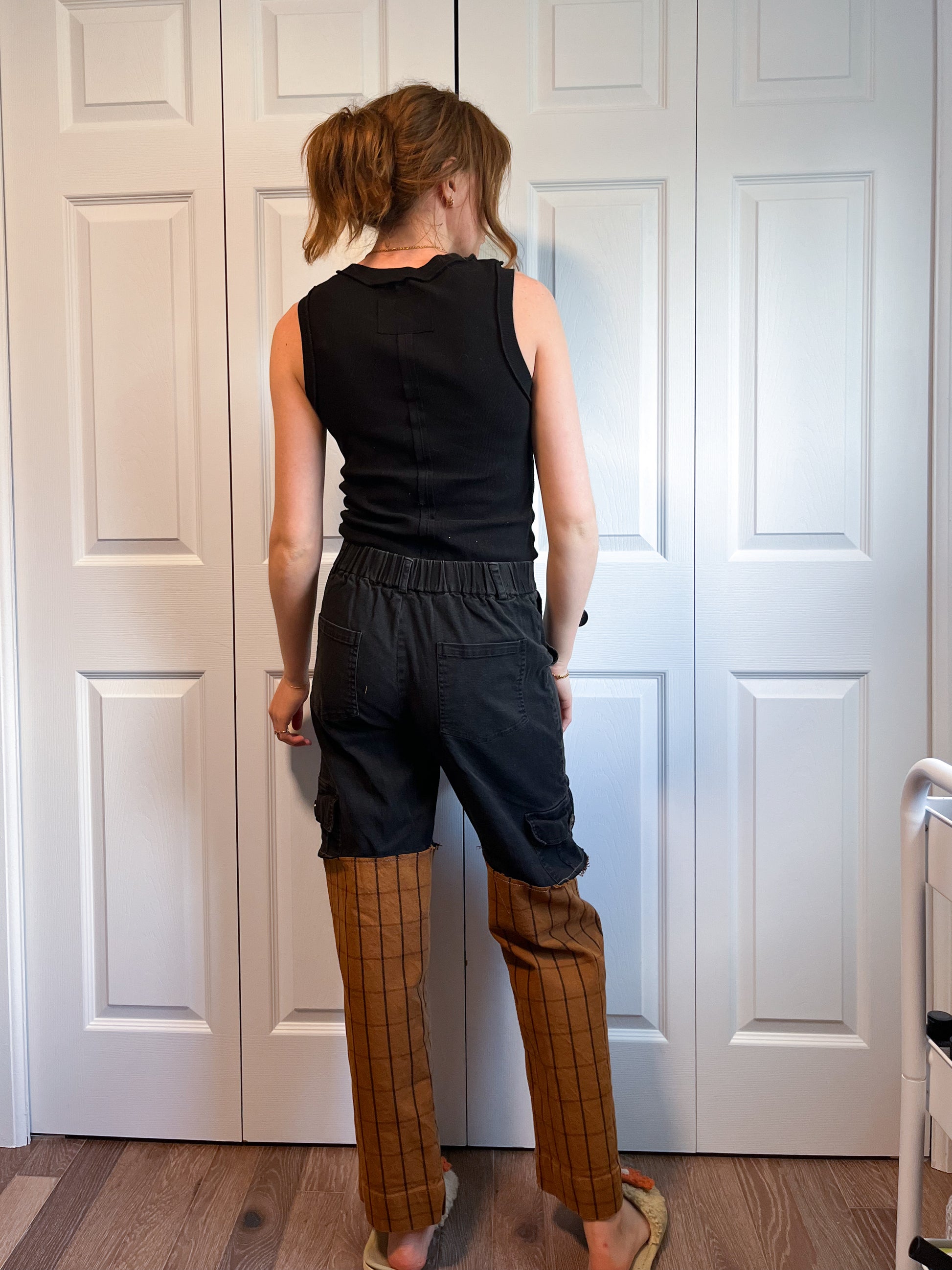 Unique upcycled cargo pants with patchwork design. The waist is stretchy. This was reworked by me, by sewing to pants together.
