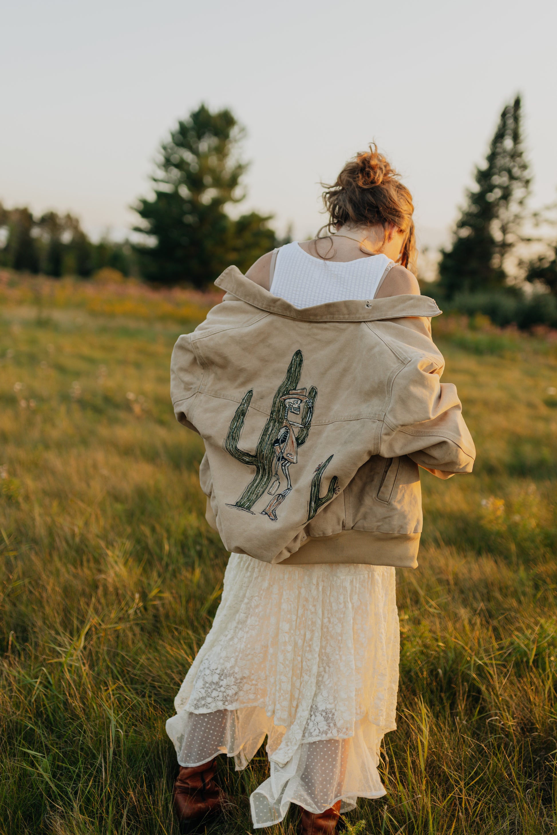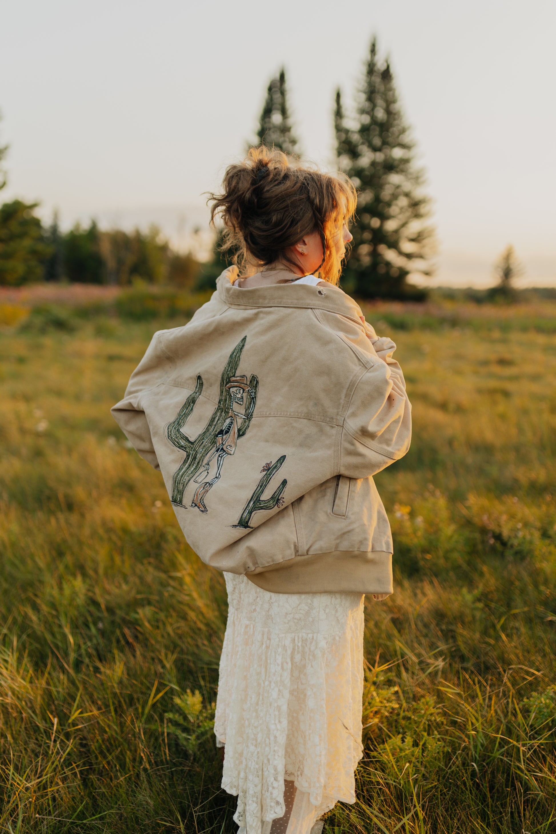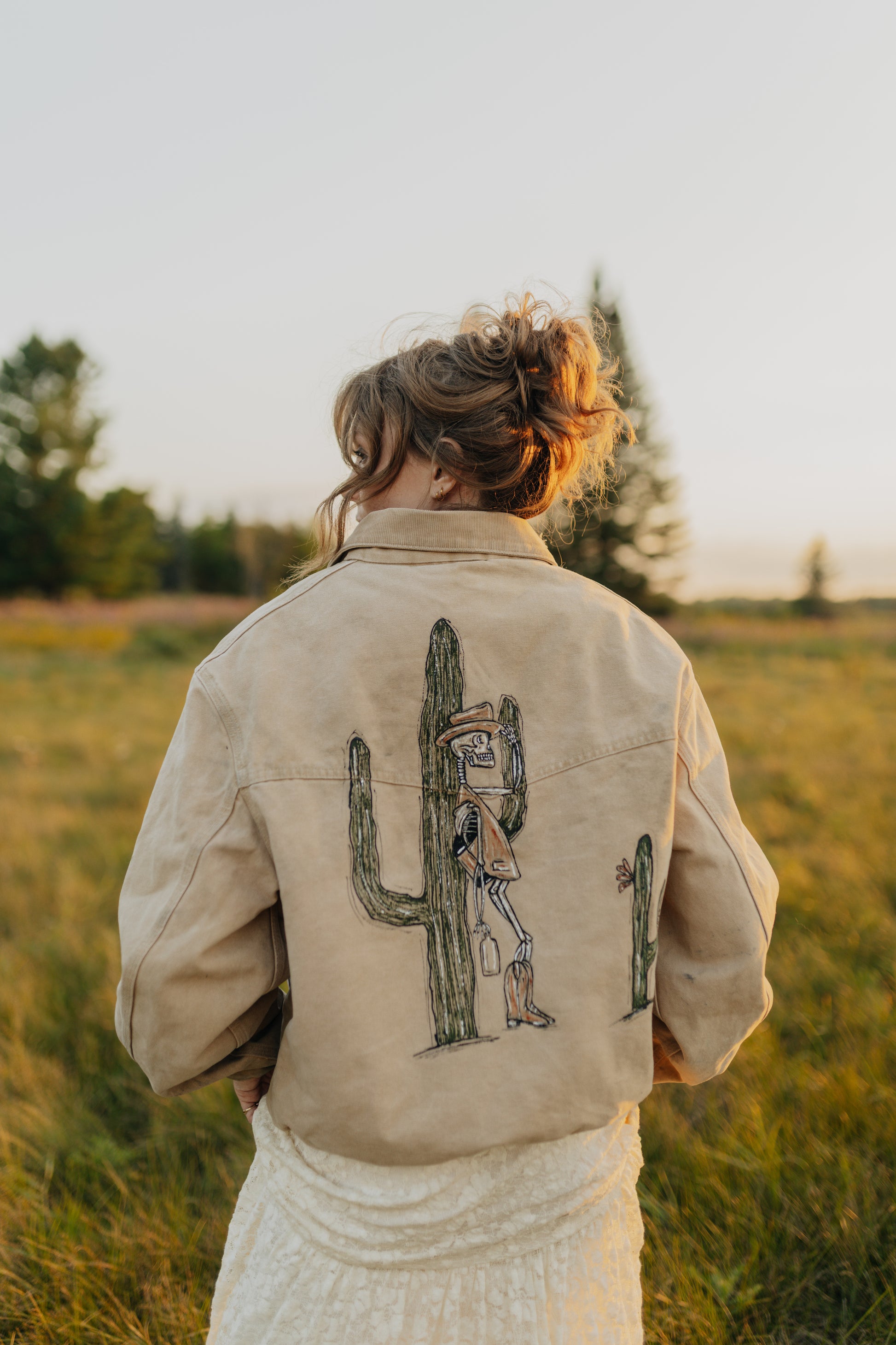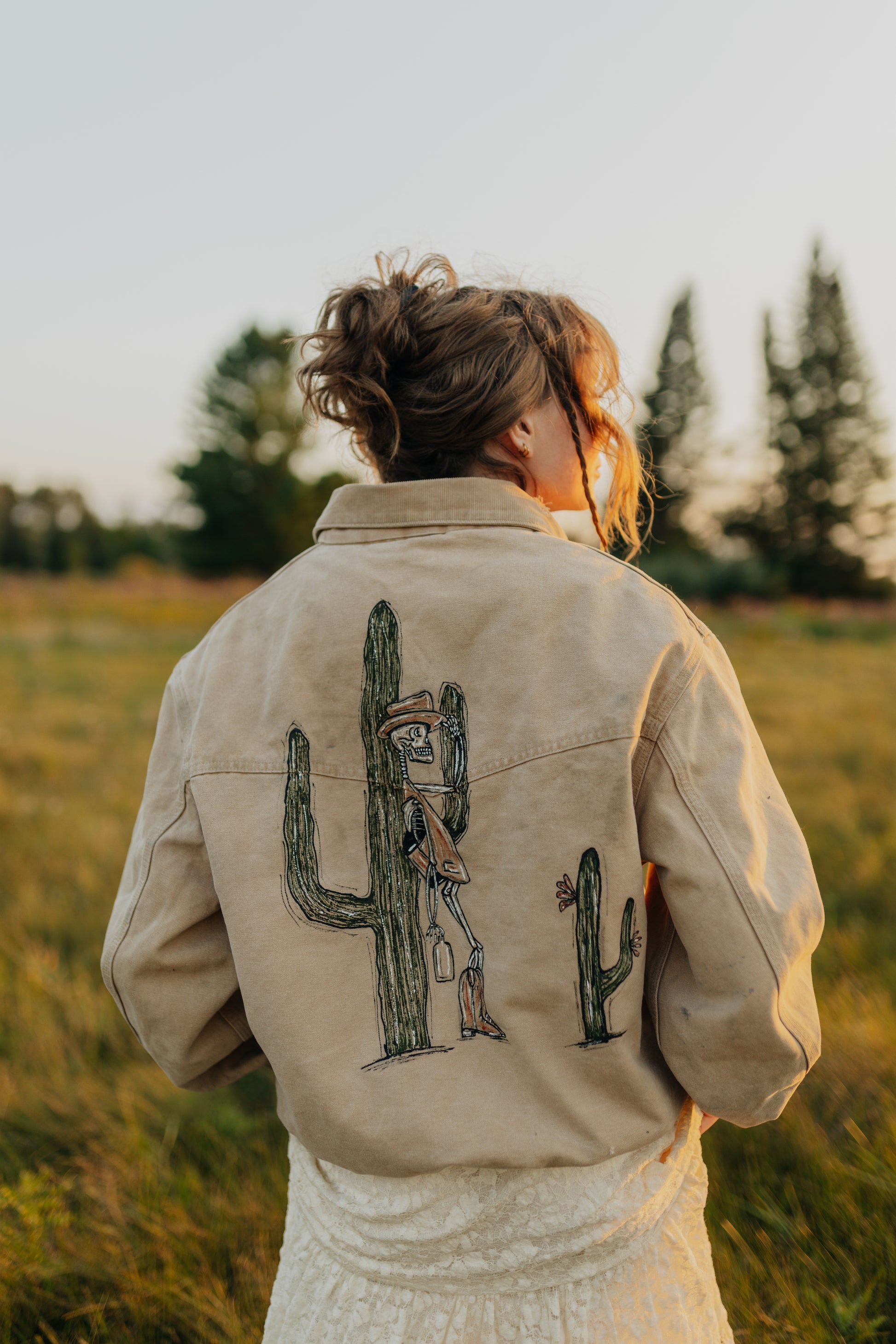 A vintage worn carhartt jacket that was thrifted and then painted on. This skeleton and cactus’ were hand painted with an acrylic & fabric paint mixture. This jacket has staining on it and has wear spots.