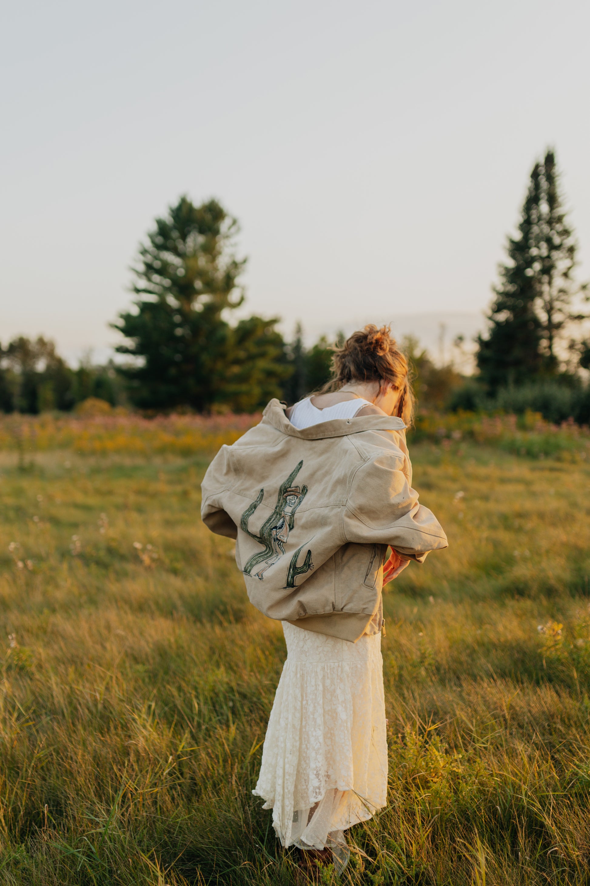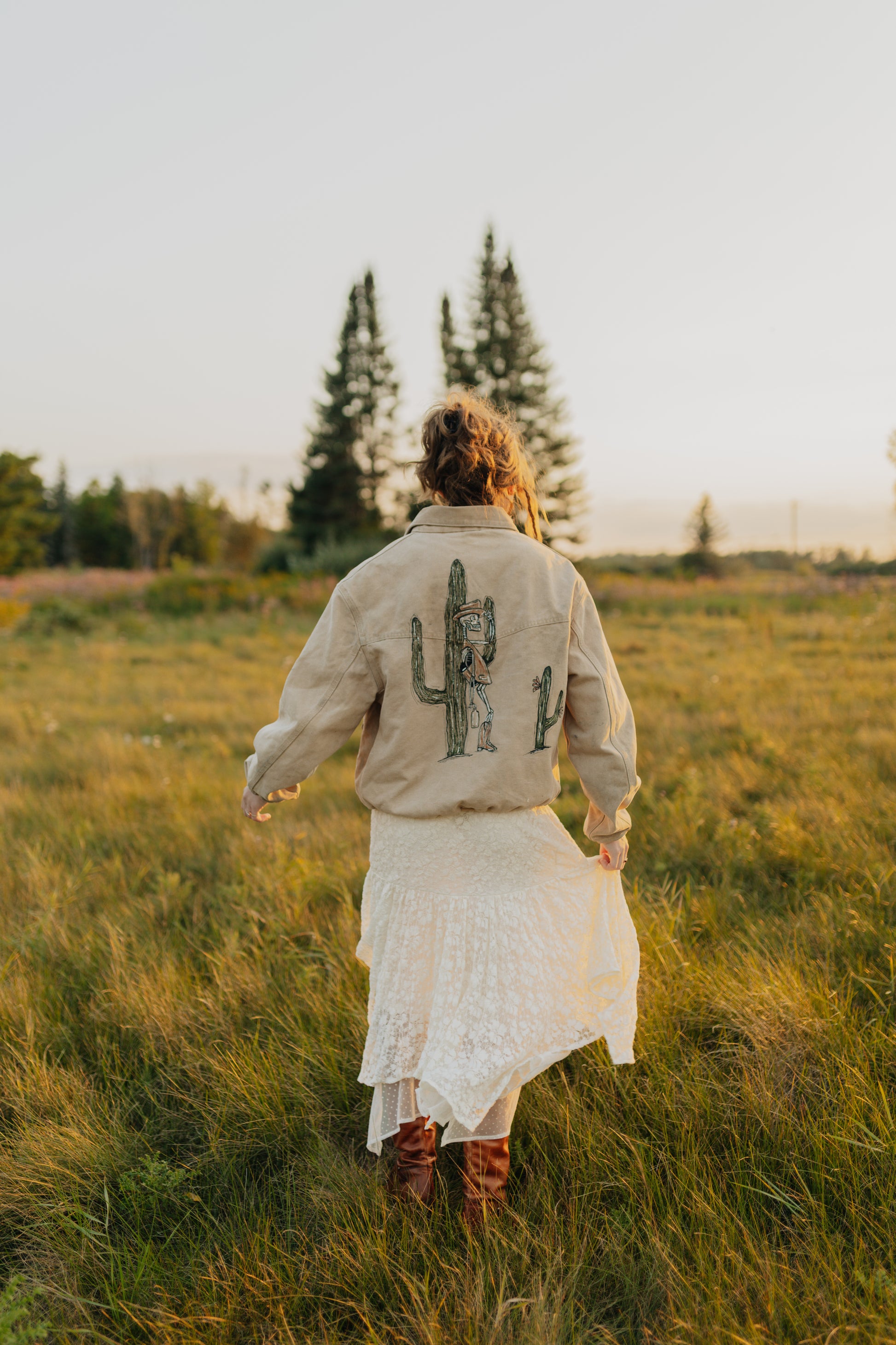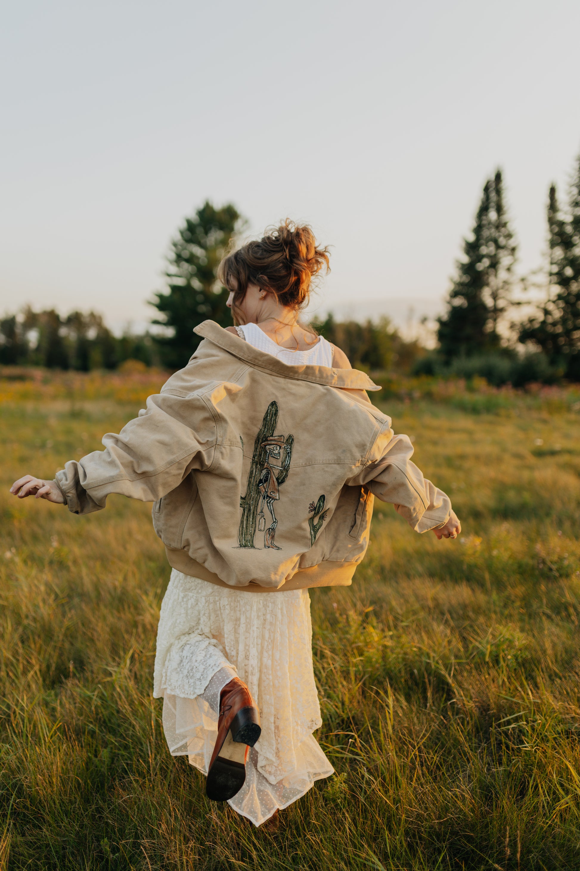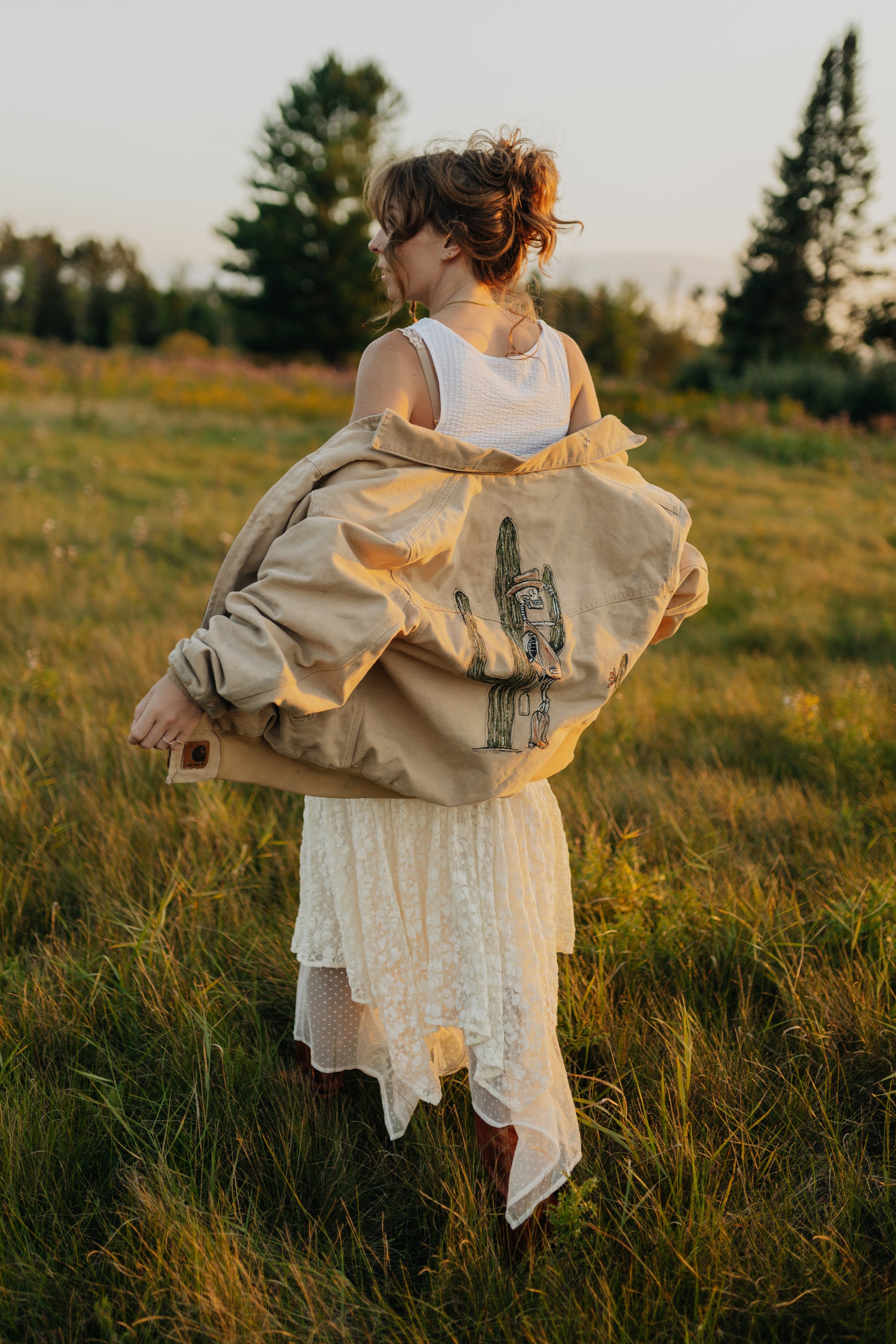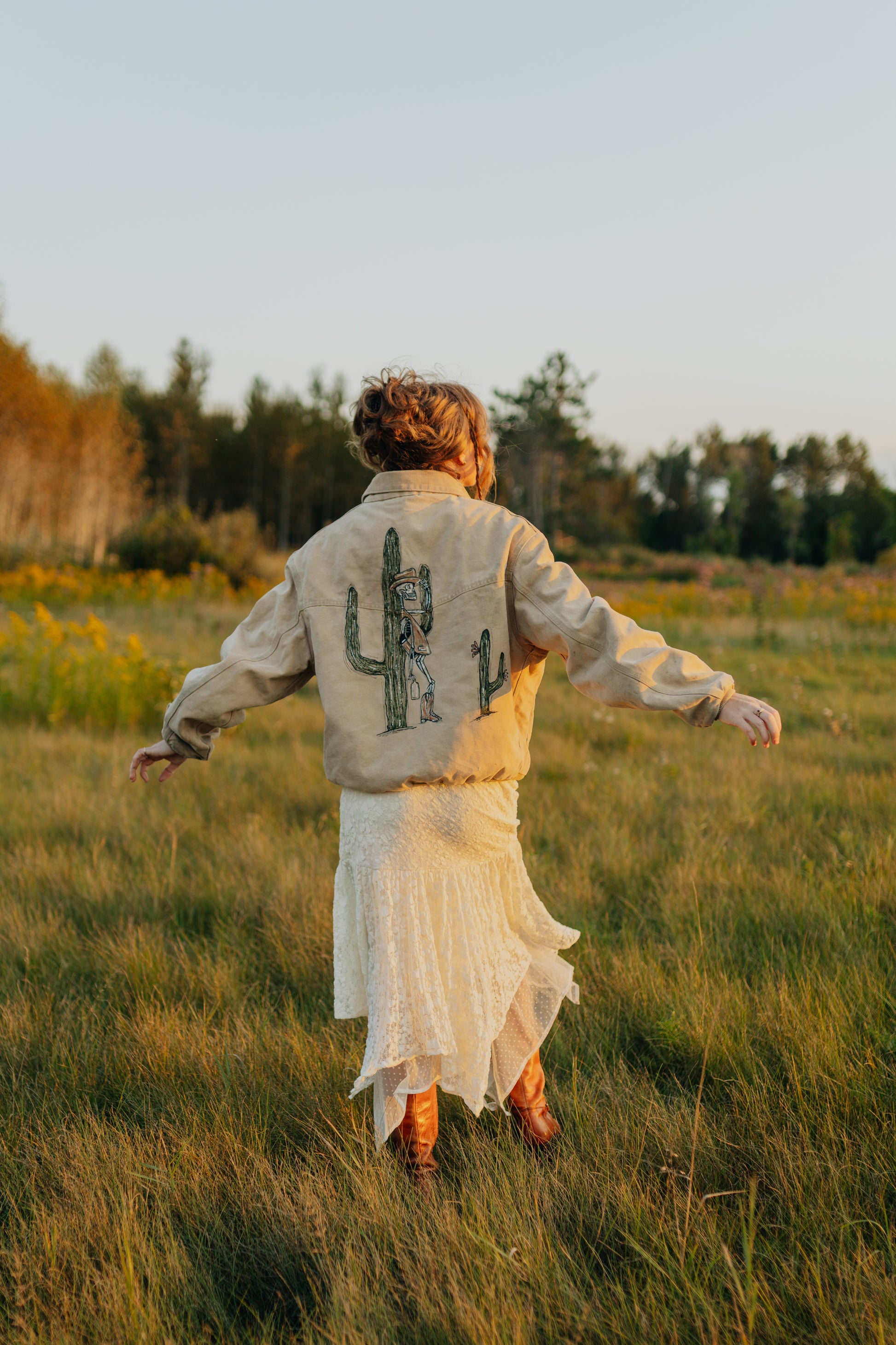 A vintage worn carhartt jacket that was thrifted and then painted on. This skeleton and cactus’ were hand painted with an acrylic & fabric paint mixture. This jacket has staining on it and has wear spots.