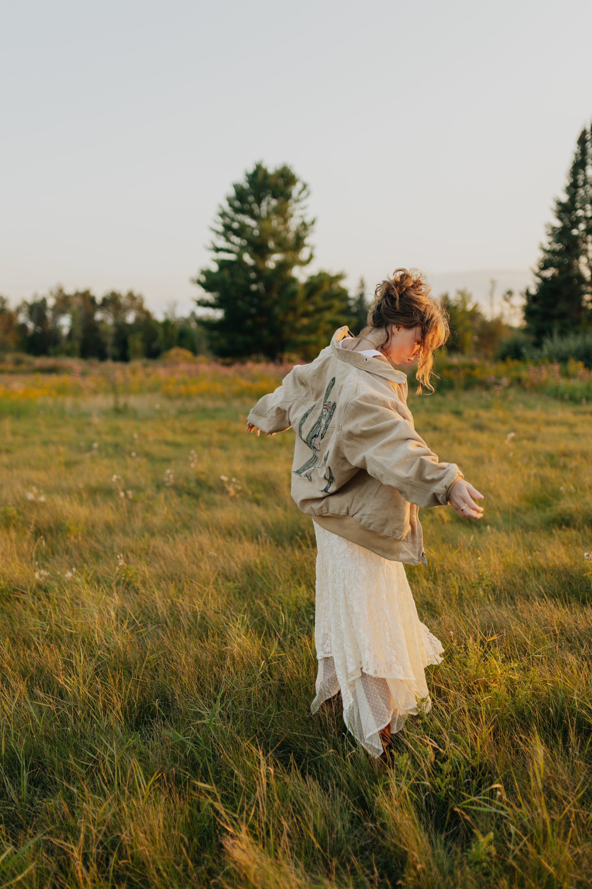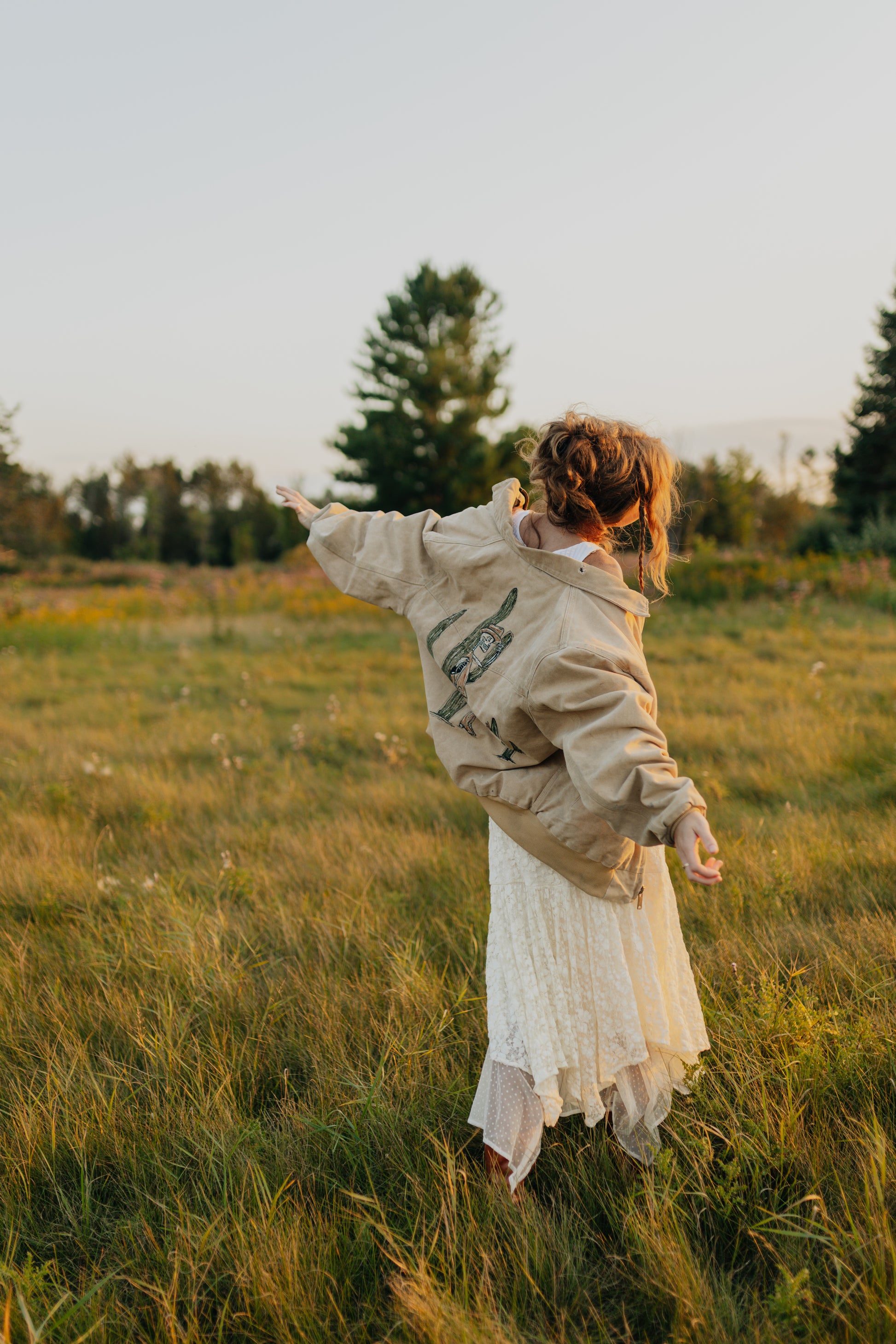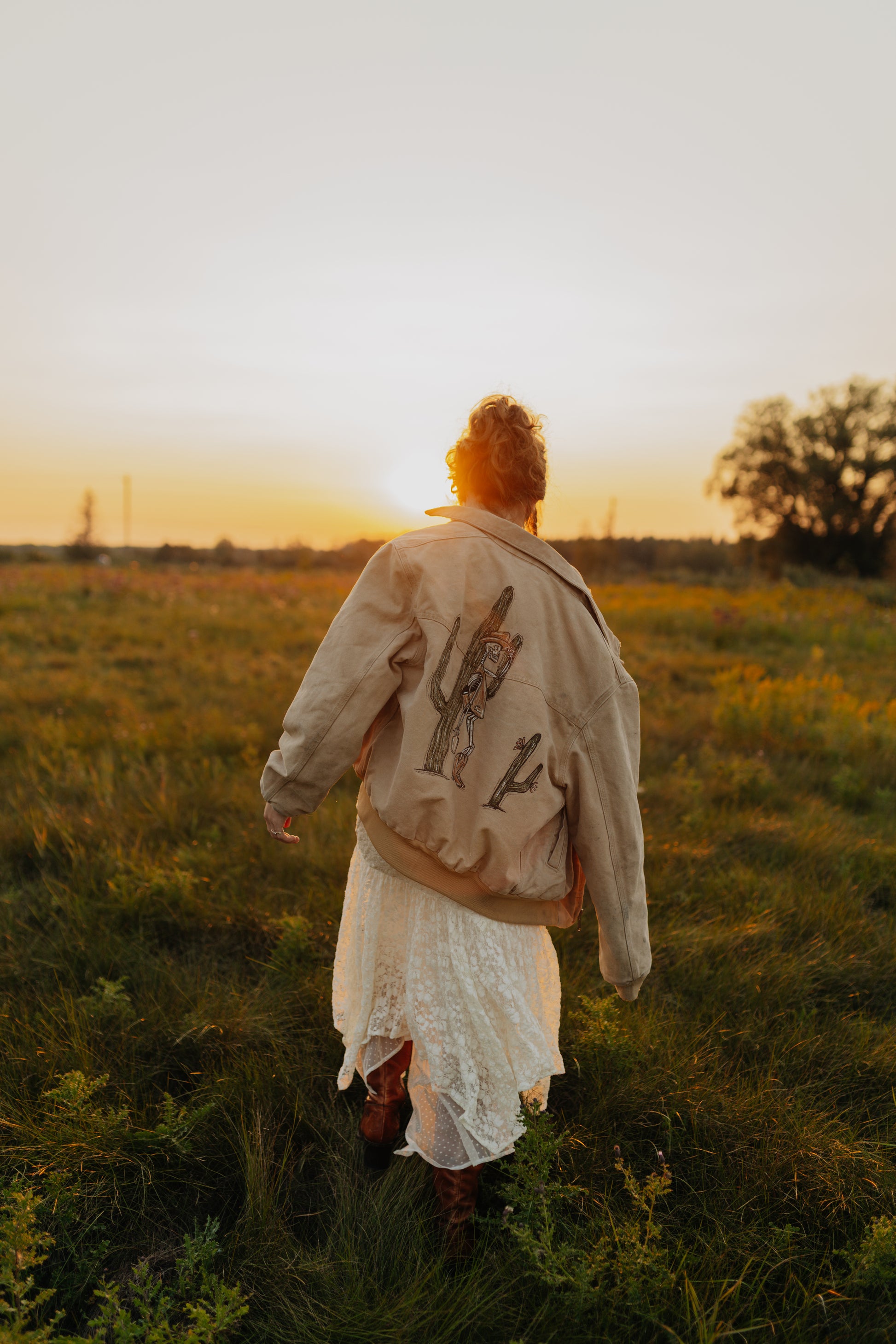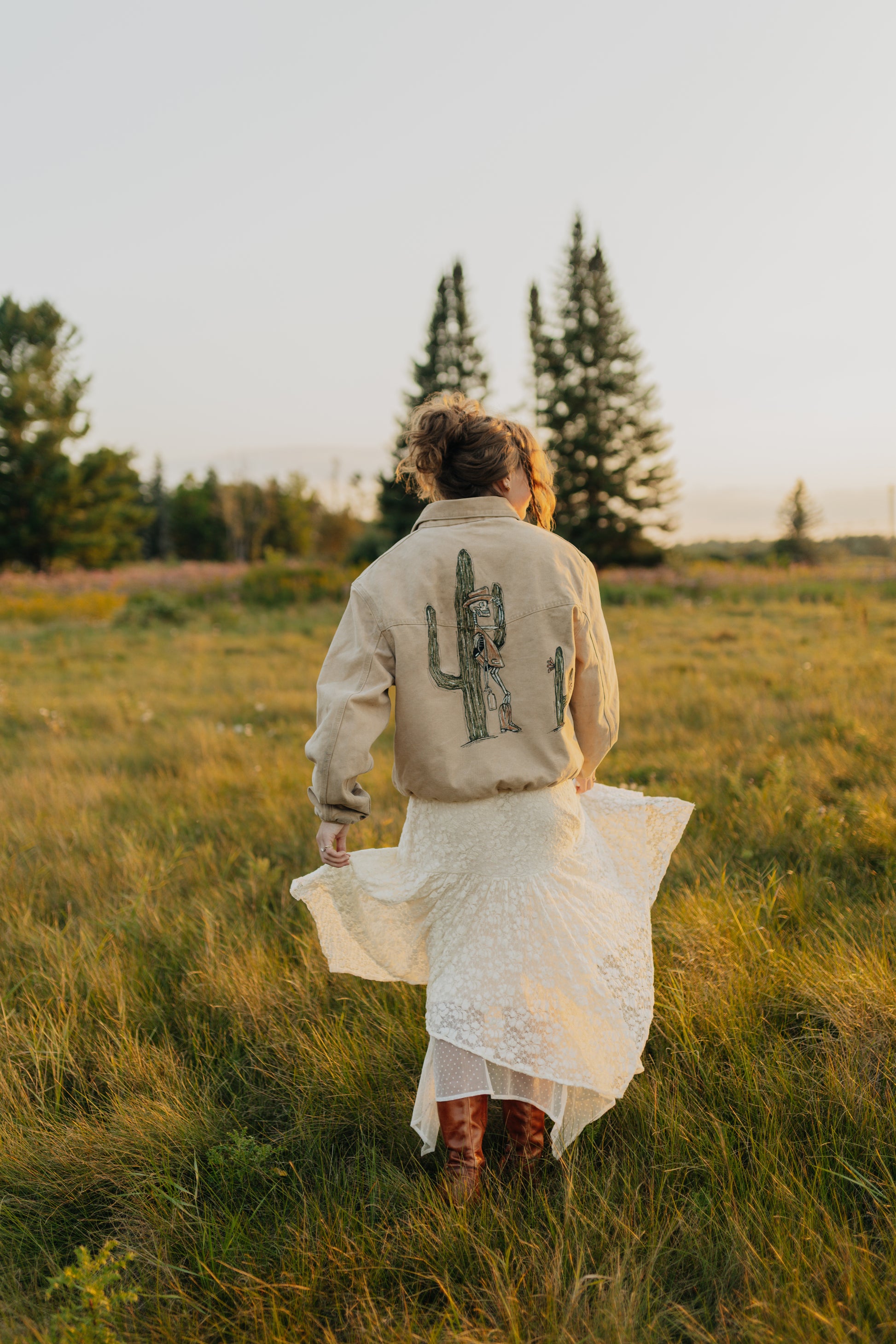 A vintage worn carhartt jacket that was thrifted and then painted on. This skeleton and cactus’ were hand painted with an acrylic & fabric paint mixture. This jacket has staining on it and has wear spots.