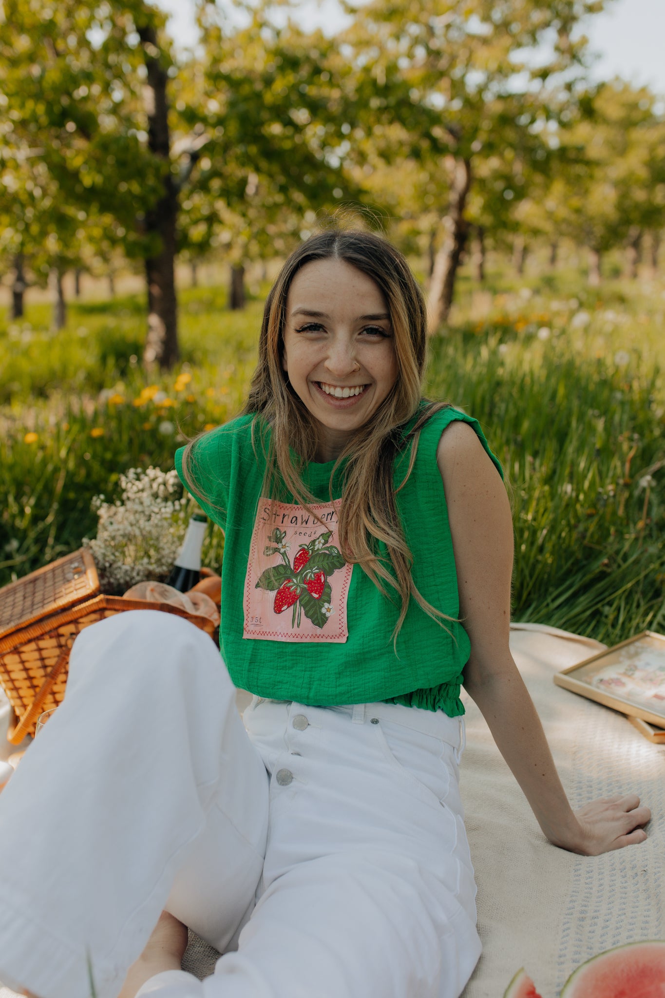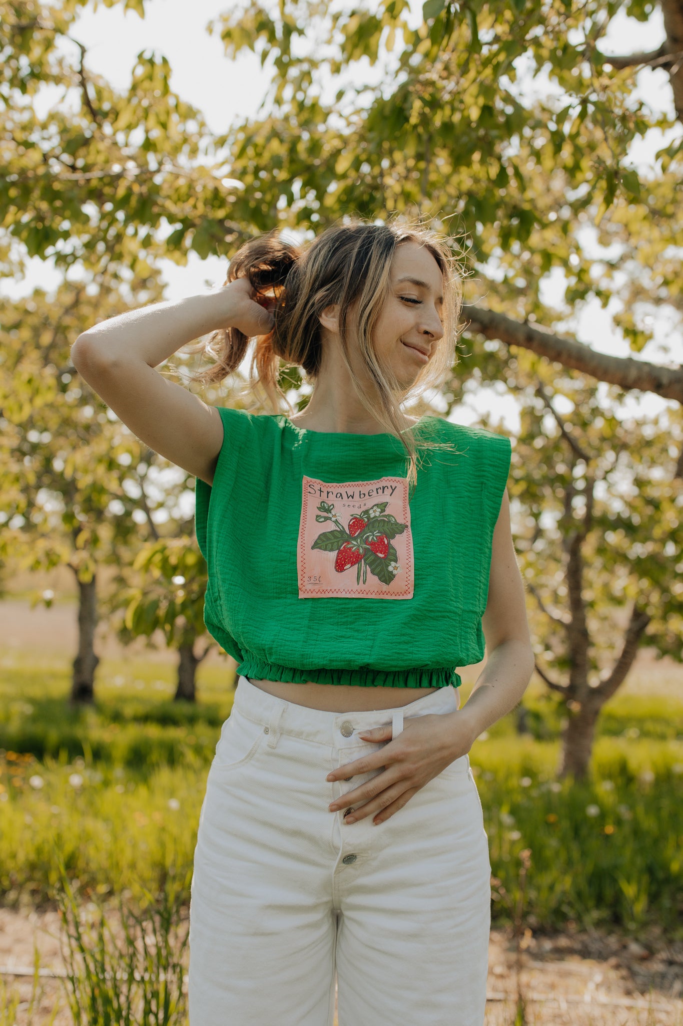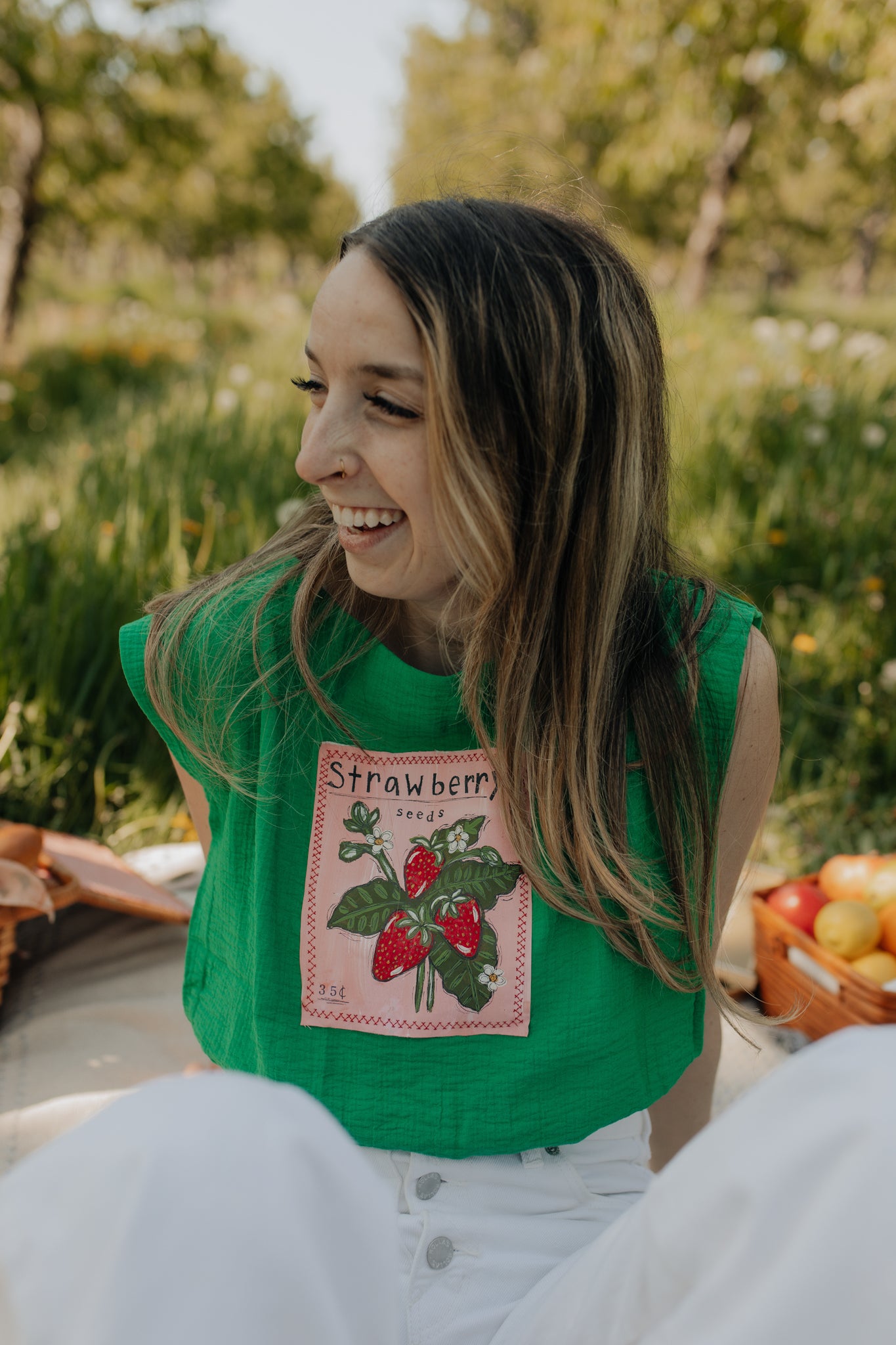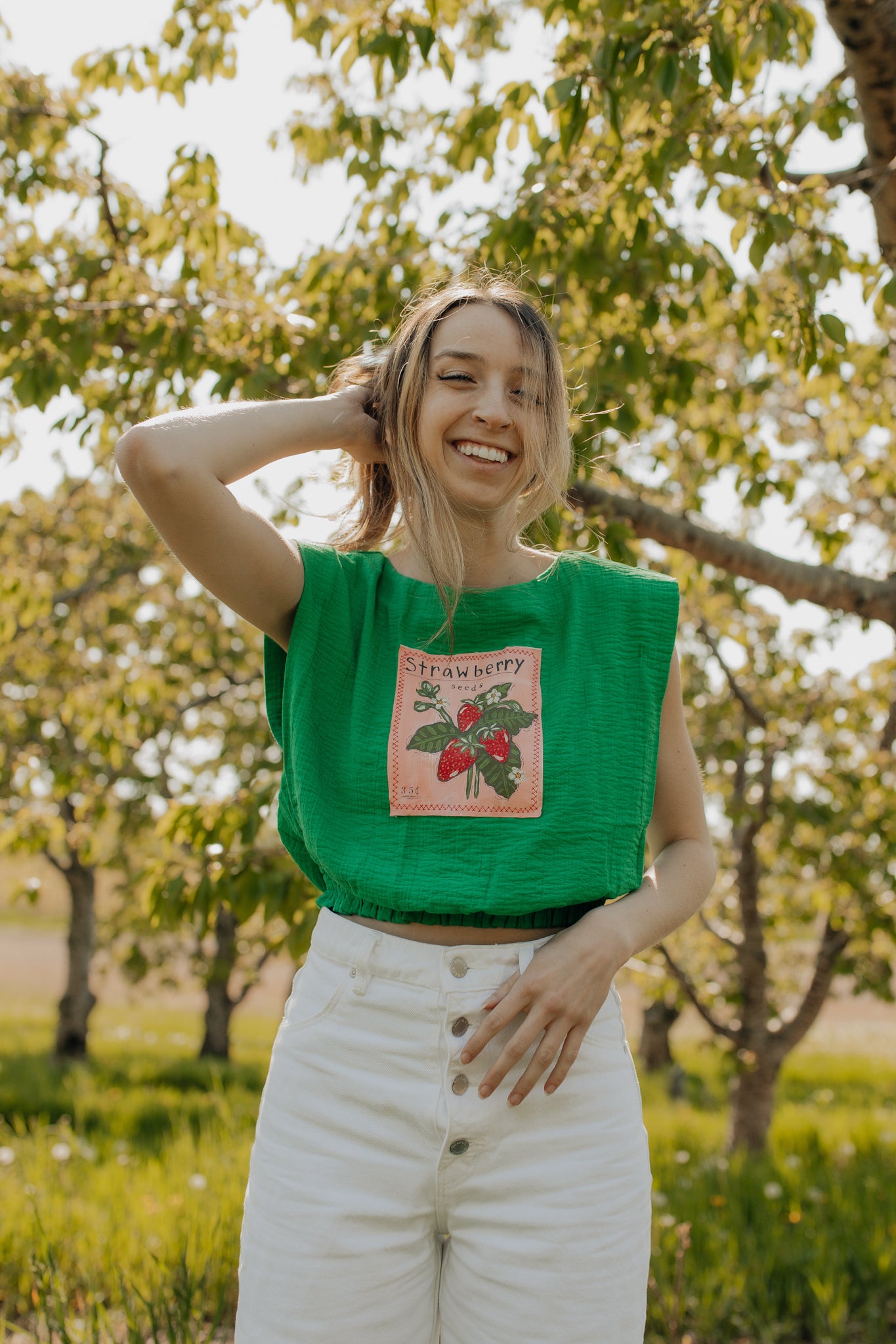 A fun twist on a normal tank by adding a painted patch of a strawberry seed packet! This piece was thrifted, painted, and patched!