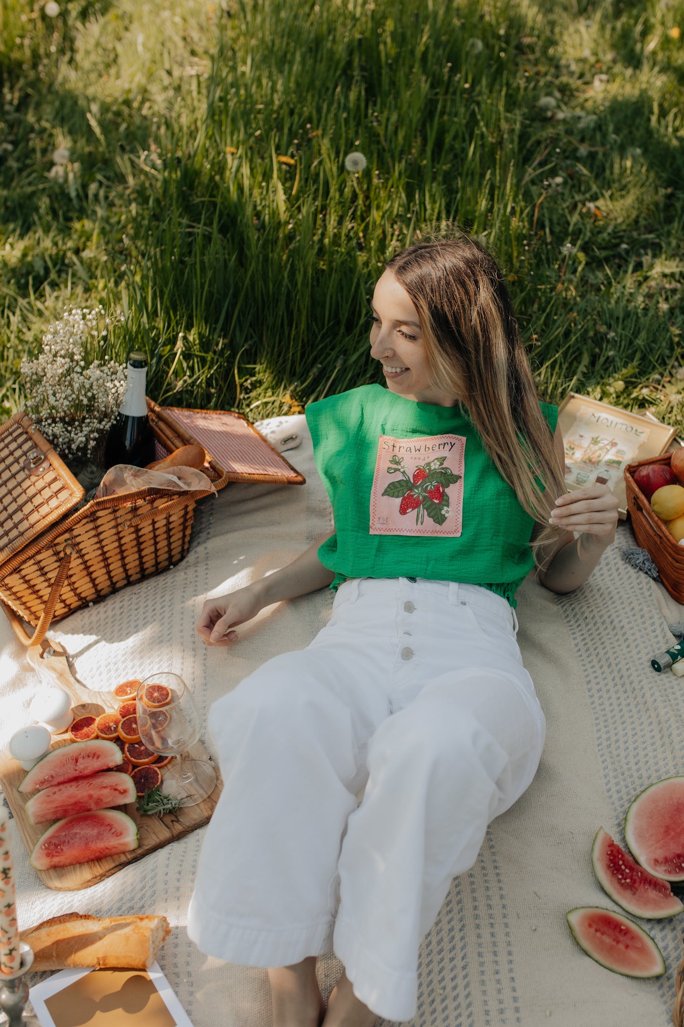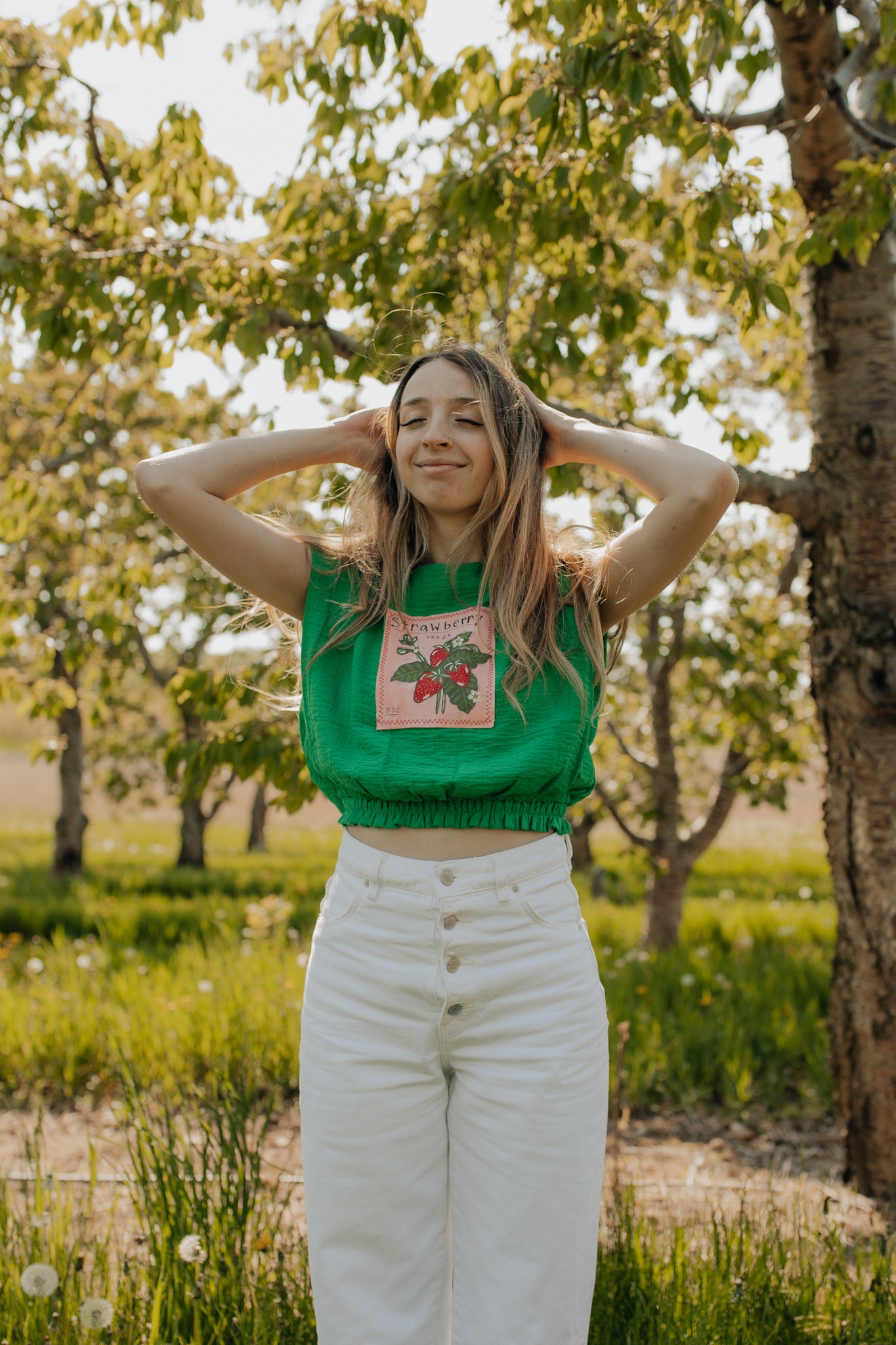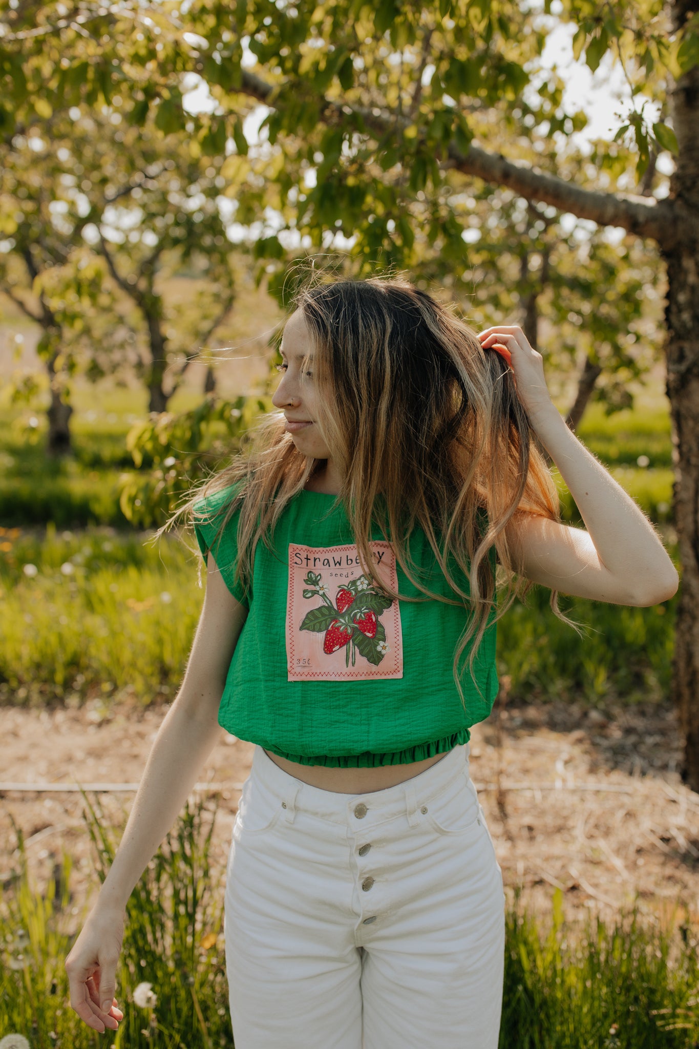 A fun twist on a normal tank by adding a painted patch of a strawberry seed packet! This piece was thrifted, painted, and patched!