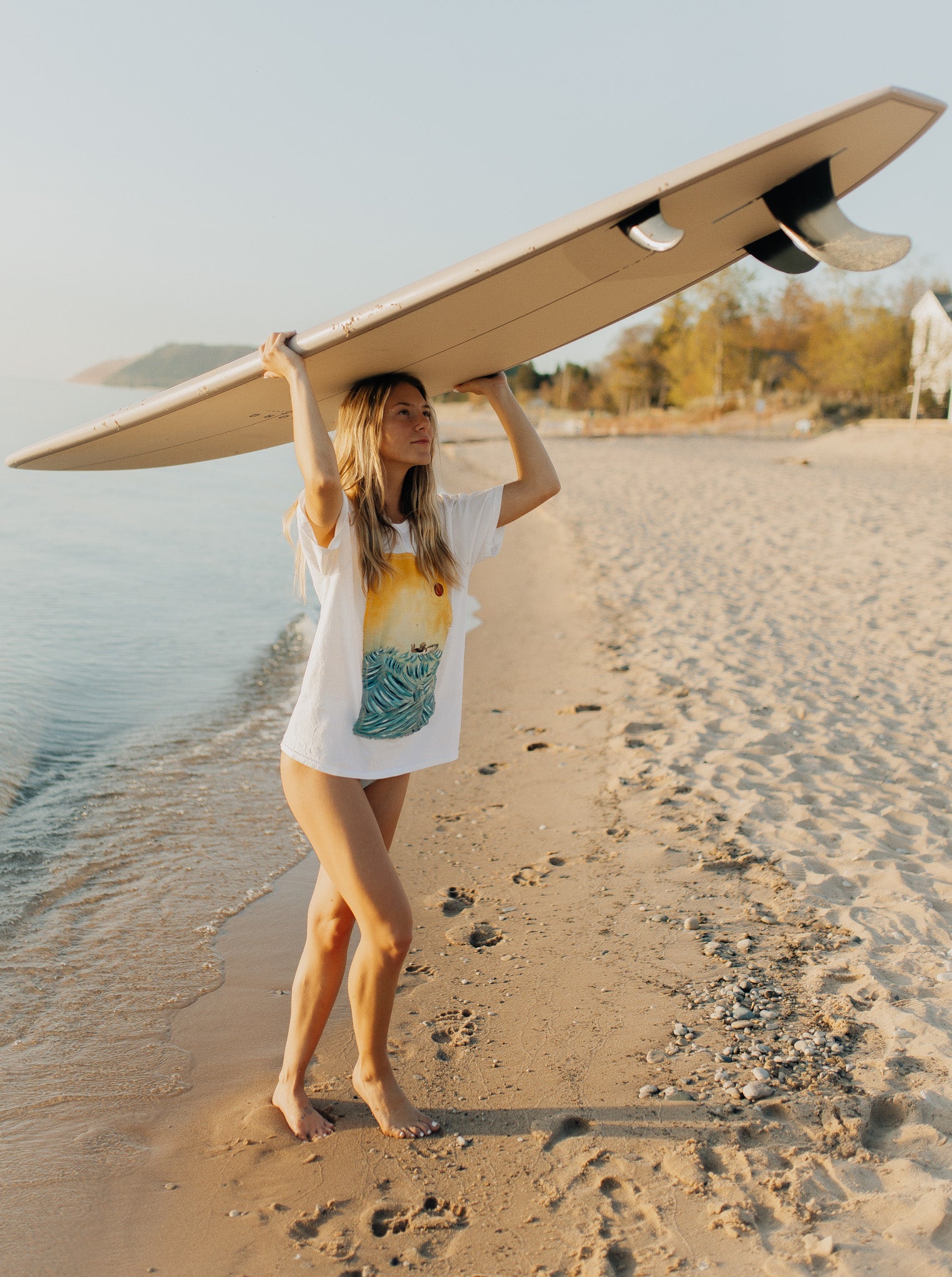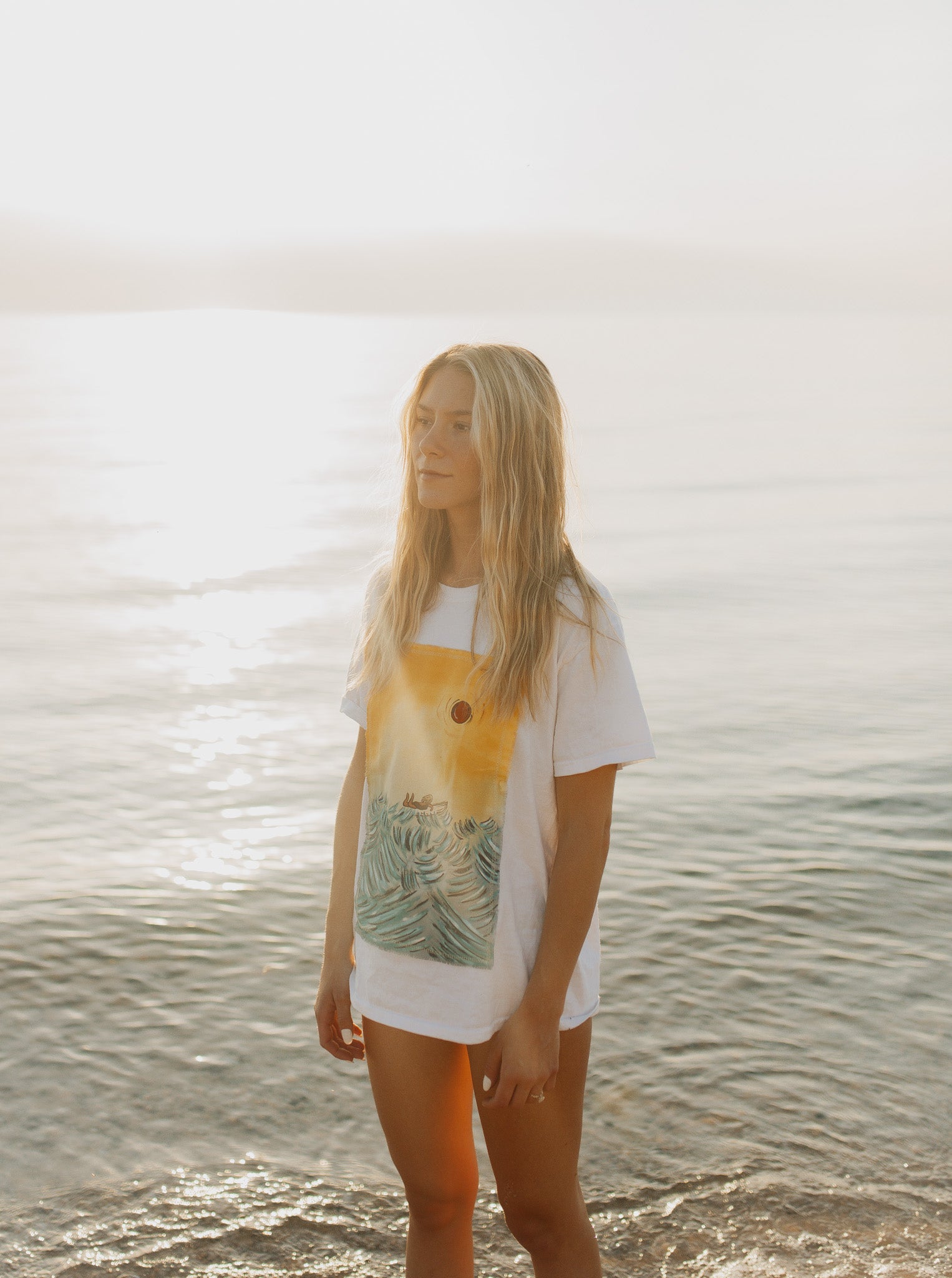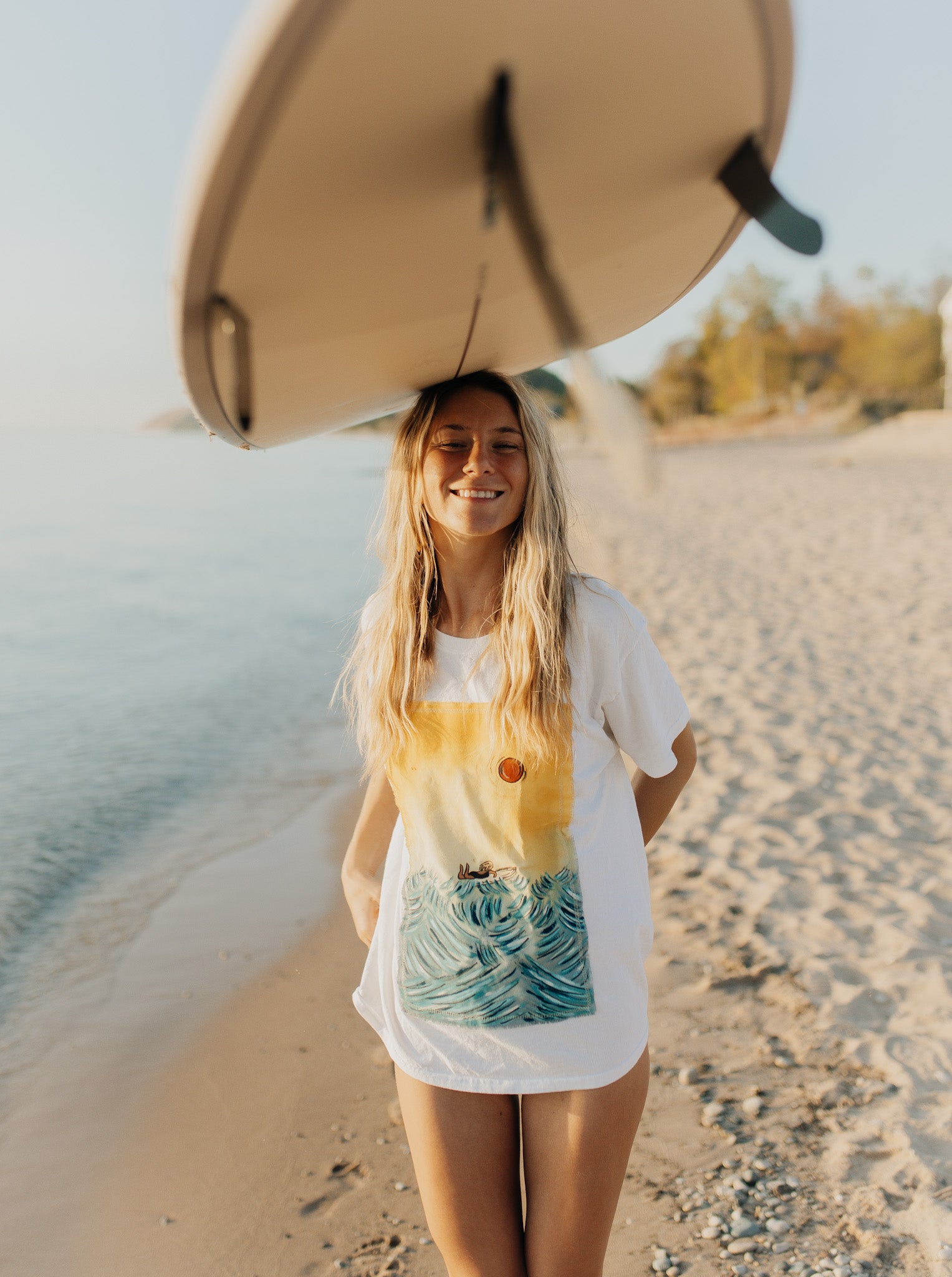This is my favorite creation from the whole Surfer Collection! I thrifted this white tee and patched it. For the painting of the patch i did a yellow and blue wash on it For the background and then filled in the little details! It has such a fun oversized look and is perfect for throwing over your swimsuit!